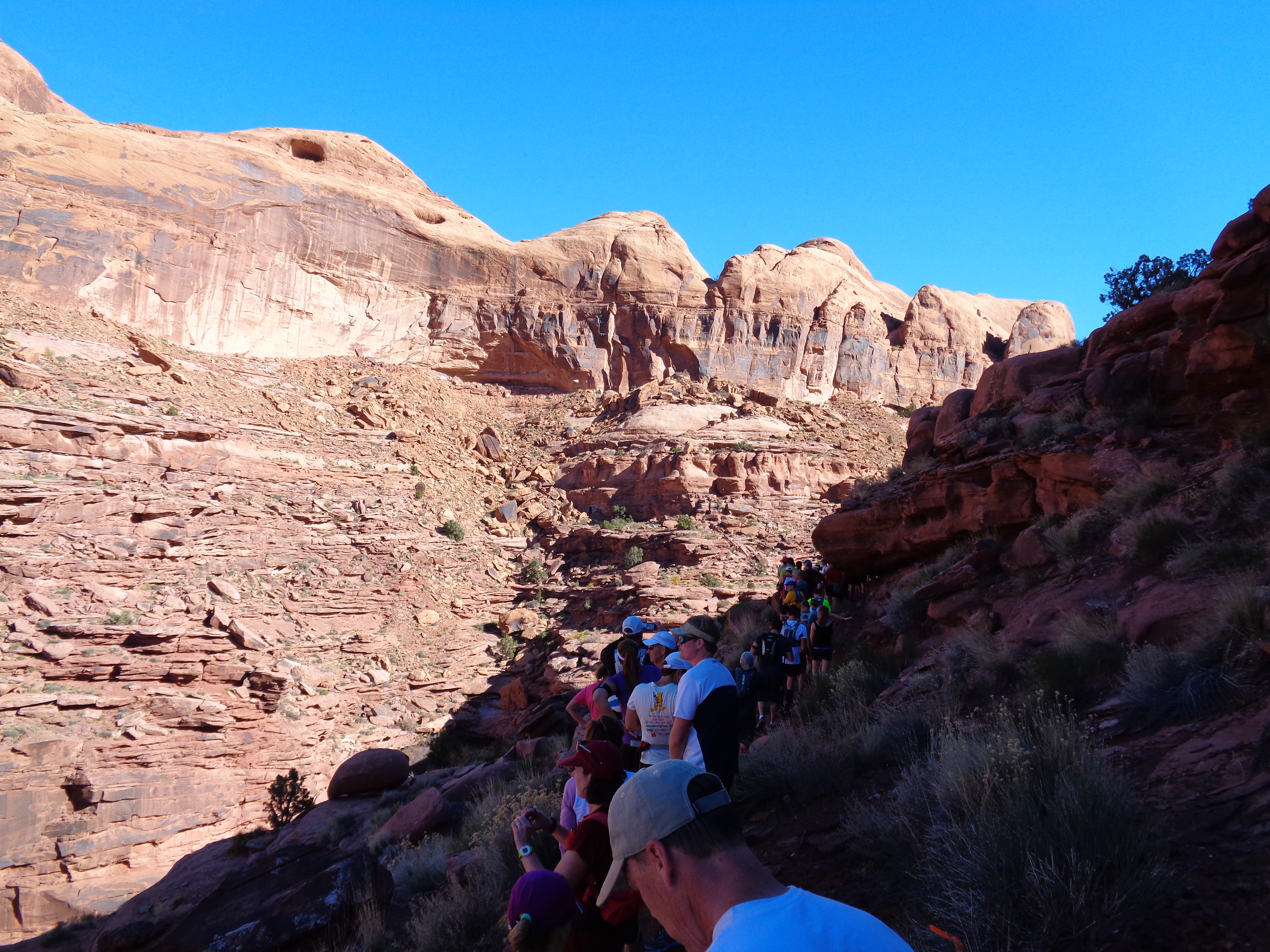 Okay, there were some normal (ish) parts too. Like to the left, a picture of a runner coming up some slickrock, which was what miles 19-22ish were. With Colorado snow-capped peaks in the background. The mountain bikers were having a great time, but most of the runners around me were dying. Whatever. I was too happy. Poor guys, I kept passing them, stopping to take pictures, passing them again, etc. I’m obnoxious. In the beginning of the race, everyone was taking pictures! Either the touristy runners were all half marathoners, or the distance folks like myself were too exhausted to stop and take photos.