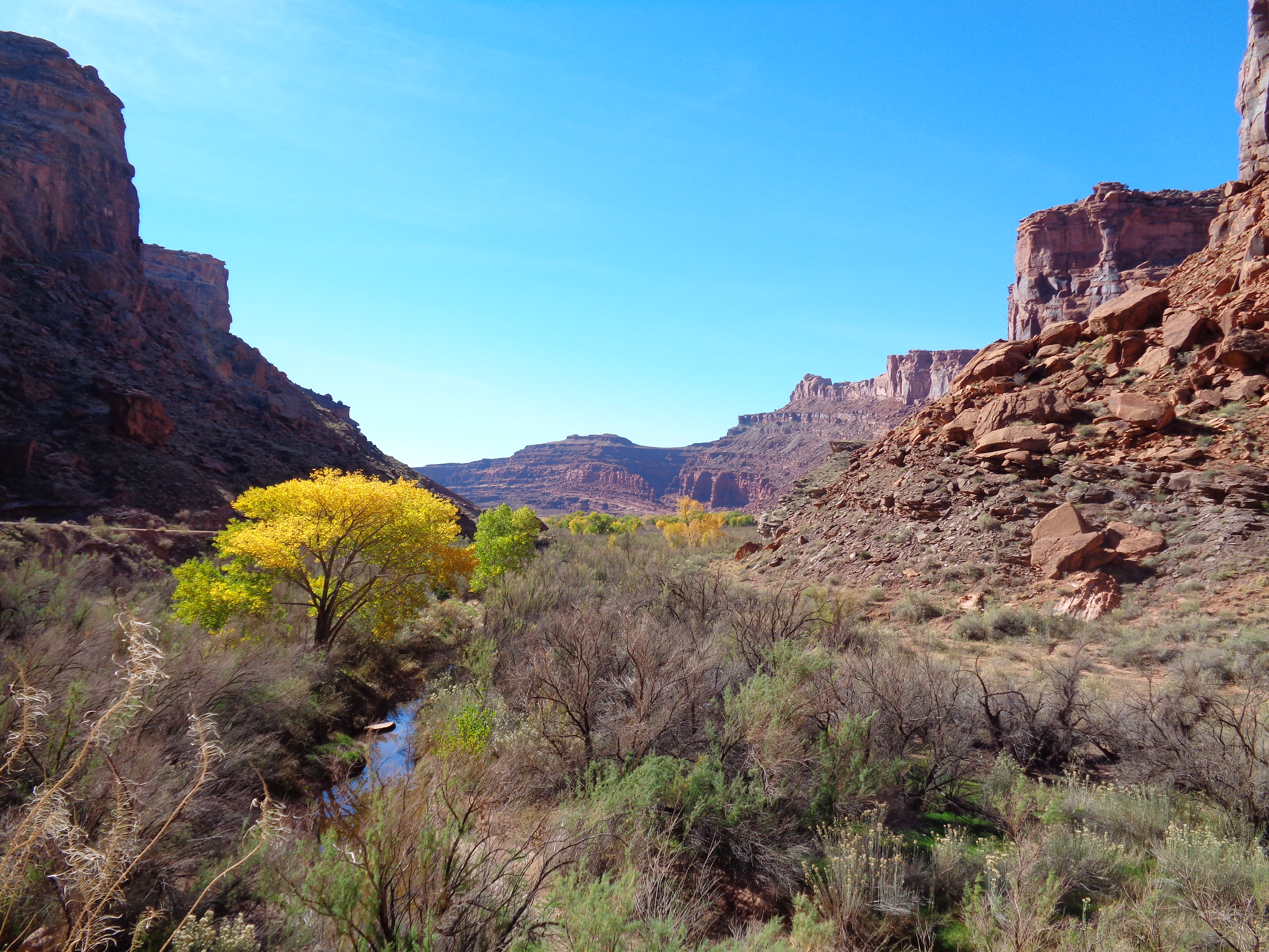 In that first photo, where you’re standing by the rock at the top of the Mile 16 peak, there are weird little ponds way in the background. I checked them out on Google Earth. They’re potash evaporation ponds. From the sky, they’re an eerie, artificial blue. What is potash, you ask? Potash is mined salt with a lot of water-soluble potassium, used primarily for fertilizer. Hmm, potassium and salt … so those ponds would be a great place to take a good long drink before you run 26 miles in the desert! Unbeatable cramp prevention (assuming you don’t poison yourself)! The Wiki page for potash has a photo of these very same Moab ponds.