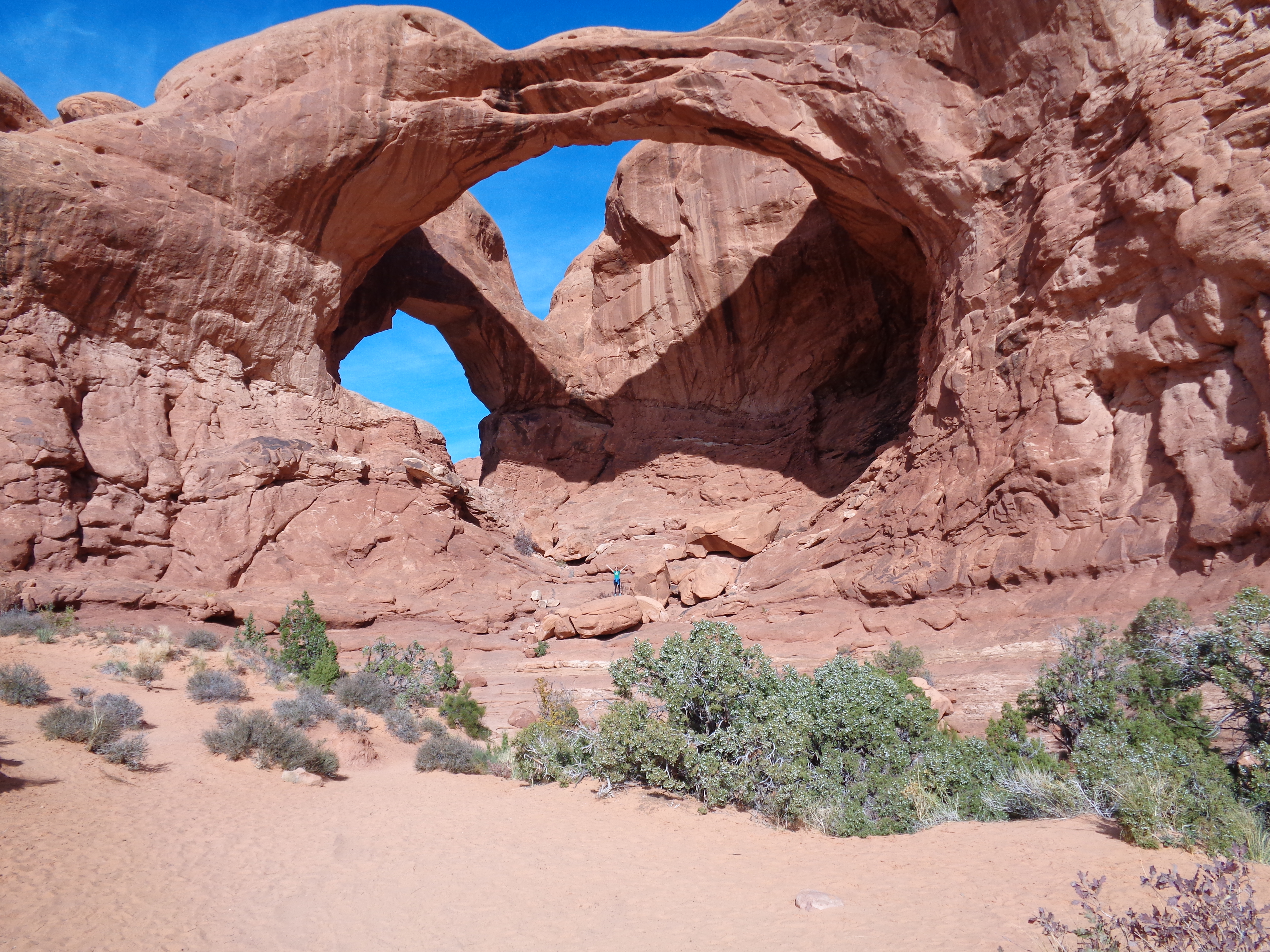 Last but not least, the double arch! If you look really closely, I’m standing in the middle of it on top of a rock. That’s how unbelievably massive it is. It was humbling to stand right below it. We almost didn’t go to that one, but I saw the trailhead right near ours and we had a few extra minutes (it was something like .5 miles round trip) so we figured we could check it out.