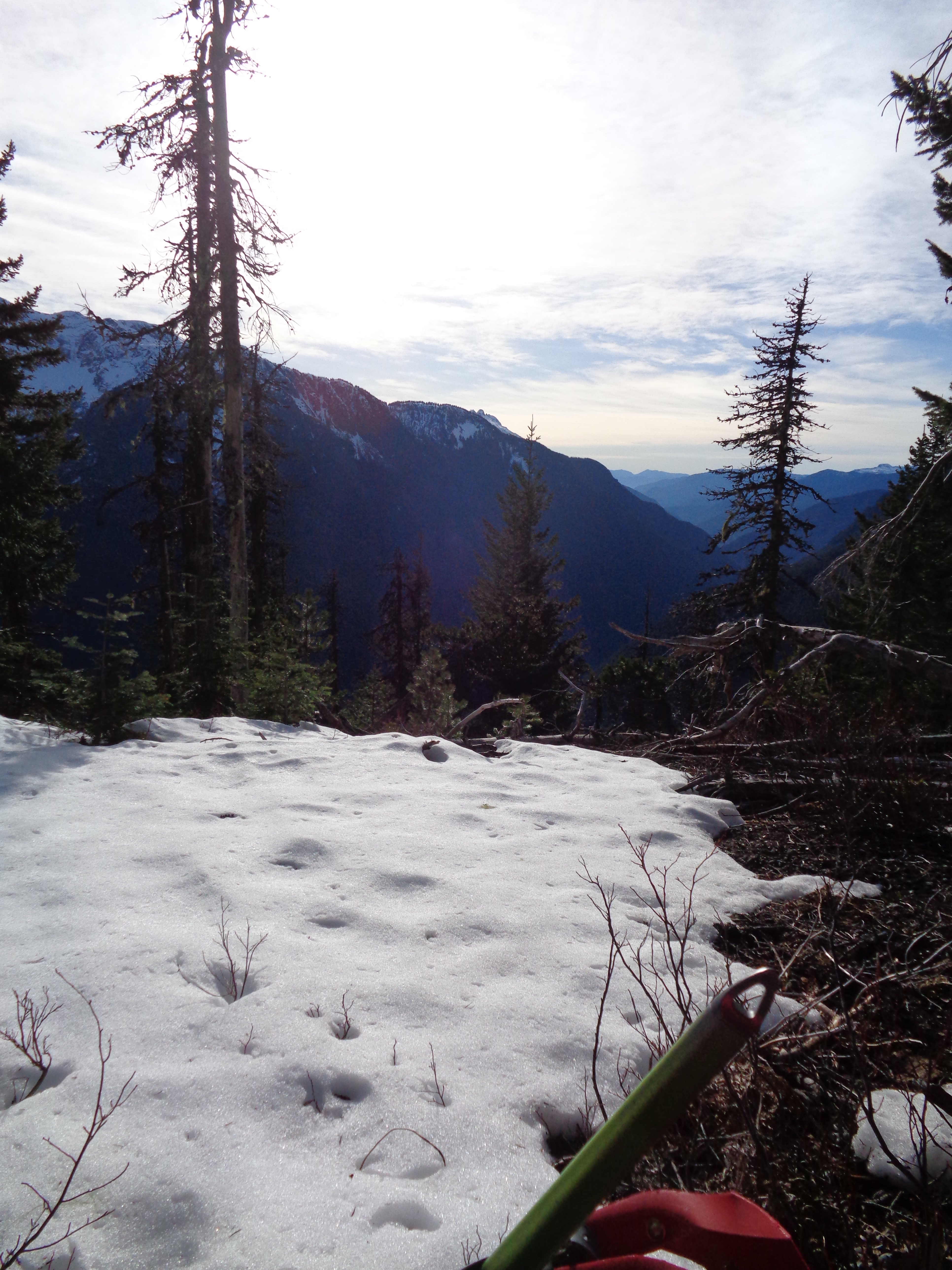 The trail was up. And then up some more. And again. Turn a corner, more up. Much of it looked like second-growth forest, and between the sun, the ridiculously warm weather, and the green, it could have been a summer hike. I expected to go off trail around 3800-4000ft, so I was keeping an eye on elevation gain and topographical features. You get sneak peaks of the surrounding mountains, and boy did it look spectacular. I couldn’t wait to get up to the Stetattle Ridge. Alas, after weeks of no hiking and sporadic running, I am not in marathon shape anymore! My ass is slow. And I lost the snowbaskets on my hiking poles. But it was great to just be out again, especially in an area I was so unfamiliar with. I had done hikes that got me close to North Cascades National Park, but I had never been within it! I didn’t know any of the surrounding peaks.