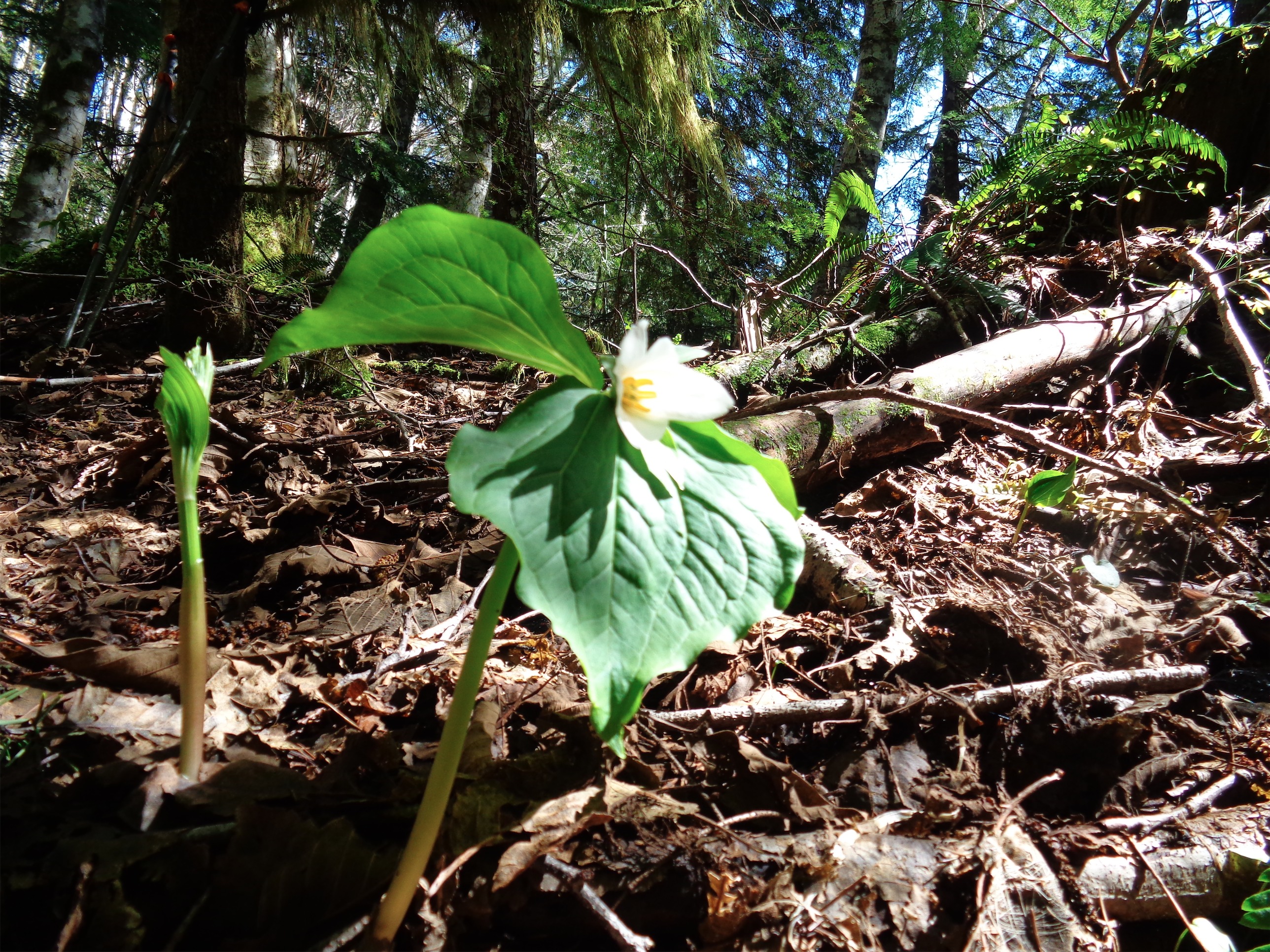 We decided to follow our own tracks back even though that meant going up a little bit before heading down to meet the trail. The theory was that this time at least we’d see the postholes coming, and know where to watch out. It worked, and we made good time going back down. If you ignore both of us wiping out multiple times. Mud is slippery. Wet tree trunks are slippery too, and so are mossy rocks. Oh, and one time I postholed into a stream beneath a tiny snow bridge, and crashed to the ground. Which meant I broke through the rest of the snow bridge, and was effectively lying in a river. Tip: Always keep crappy old towels in the car. You never know when they’ll be useful. I caught myself every time (by which I mean I avoided injury, my ass still did the catching) but Surafel might have twisted a knee at one point. Luckily, we were close to the trailhead by then. Fingers crossed for a quick recovery!