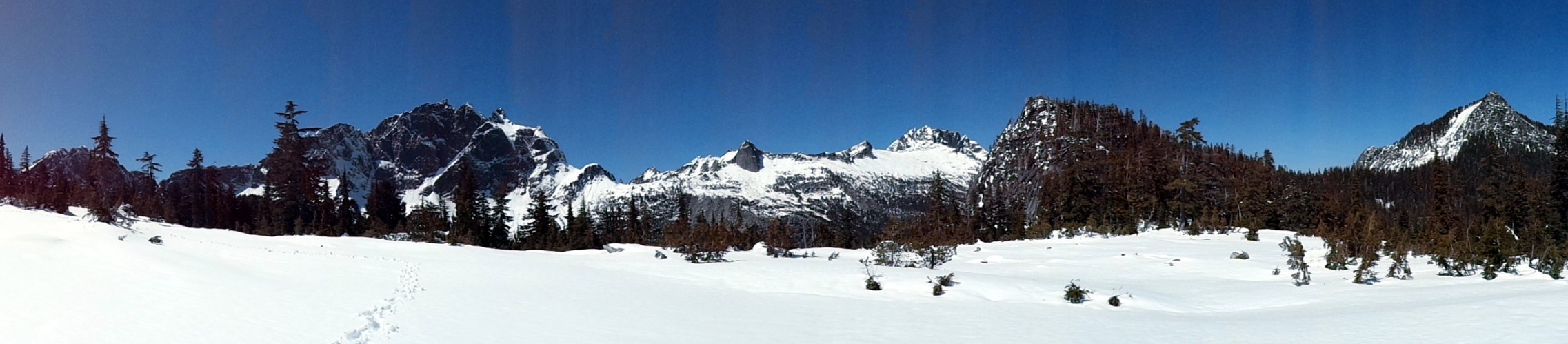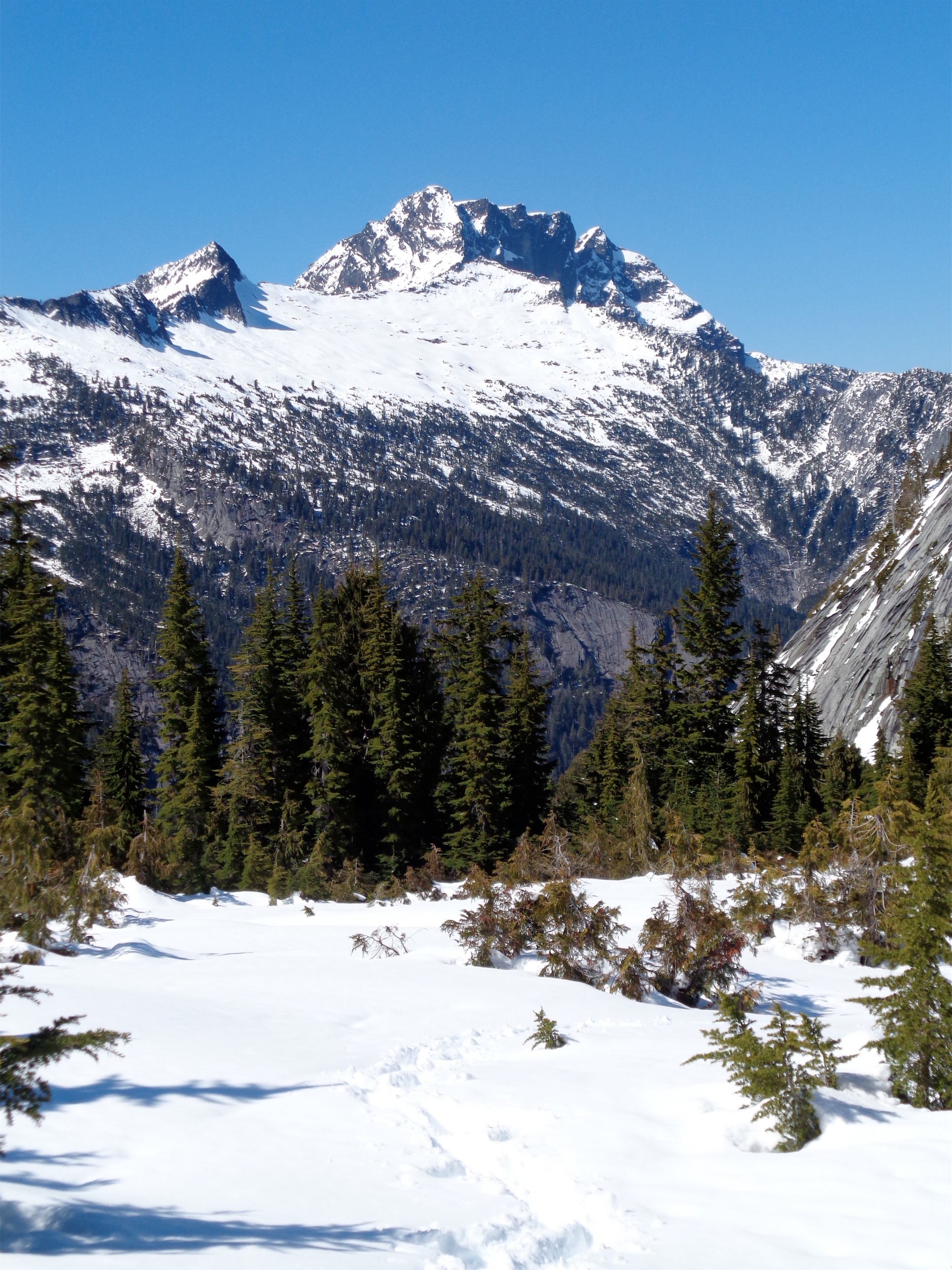 I can see why rock climbers like this place. Check out the huge rock wall to climb. It was massive, the type of rock I look at and can’t quite fathom how anyone climbs it. But I bet it’s a piece of cake for most climbers. It was shortly after this that the trail started to get covered in snow. We crossed a small talus slope, and beyond that, the trail was invisible. Okay, I was hoping to not be trail breaking again after how tiring Beckler was the day before, but I was here, so why not. For a while you could vaguely tell where the trail was. The forest was dense enough that when there was a windy line through the trees, it was a safe bet that it was the path. Eventually we emerged into a more open area, where the trees were more sparse and we were starting to get some views.