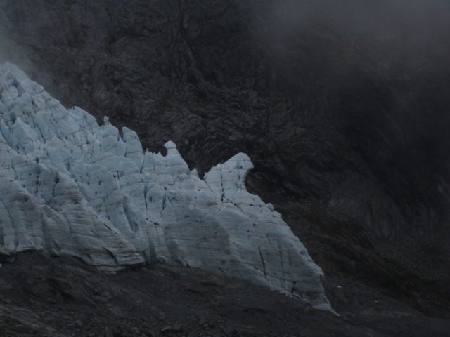 And suddenly I hear “WHOA! WHOA OH MY GOD OH MY GOD WHOAAAAA!” (double rainbow word for word with an equal level of enthusiasm) and I turn around to see the clouds clearing, and we’re sitting freaking 20 feet away from the Lower Curtis, which has a stark terminus full of jagged seracs all lined up, with hell’s highway and dramatic rocky peaks suspended above it. Hoooly shit. I nearly fell over. This is what it looks like. This is where we are, and we had no idea. That rumbling had been the freakin glacier! There was still a small pool of cloud hanging just over the glacier, but Shukan is a beautiful mountain. Nothing can compare.