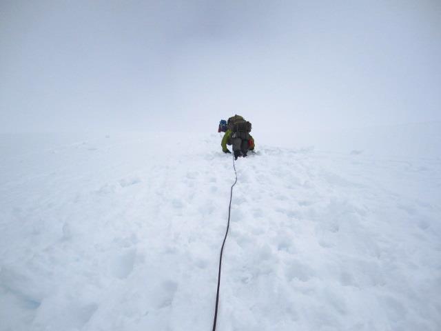 The fog got thicker. We did a fine job with the crevasses, which were far more prevalent than in mid August. The difference three weeks makes is amazing. The horizon started to blend everything together. Foggy sky was impossible to differentiate from snow, and I can see how people can get disoriented so easily. The crevasses were the only things keeping me in line. I pulled out the map, and it looked like there would be a flat ish spot up to our left. I pow-wowed with John, his GPS said the same thing. That’s what we’d aim for.