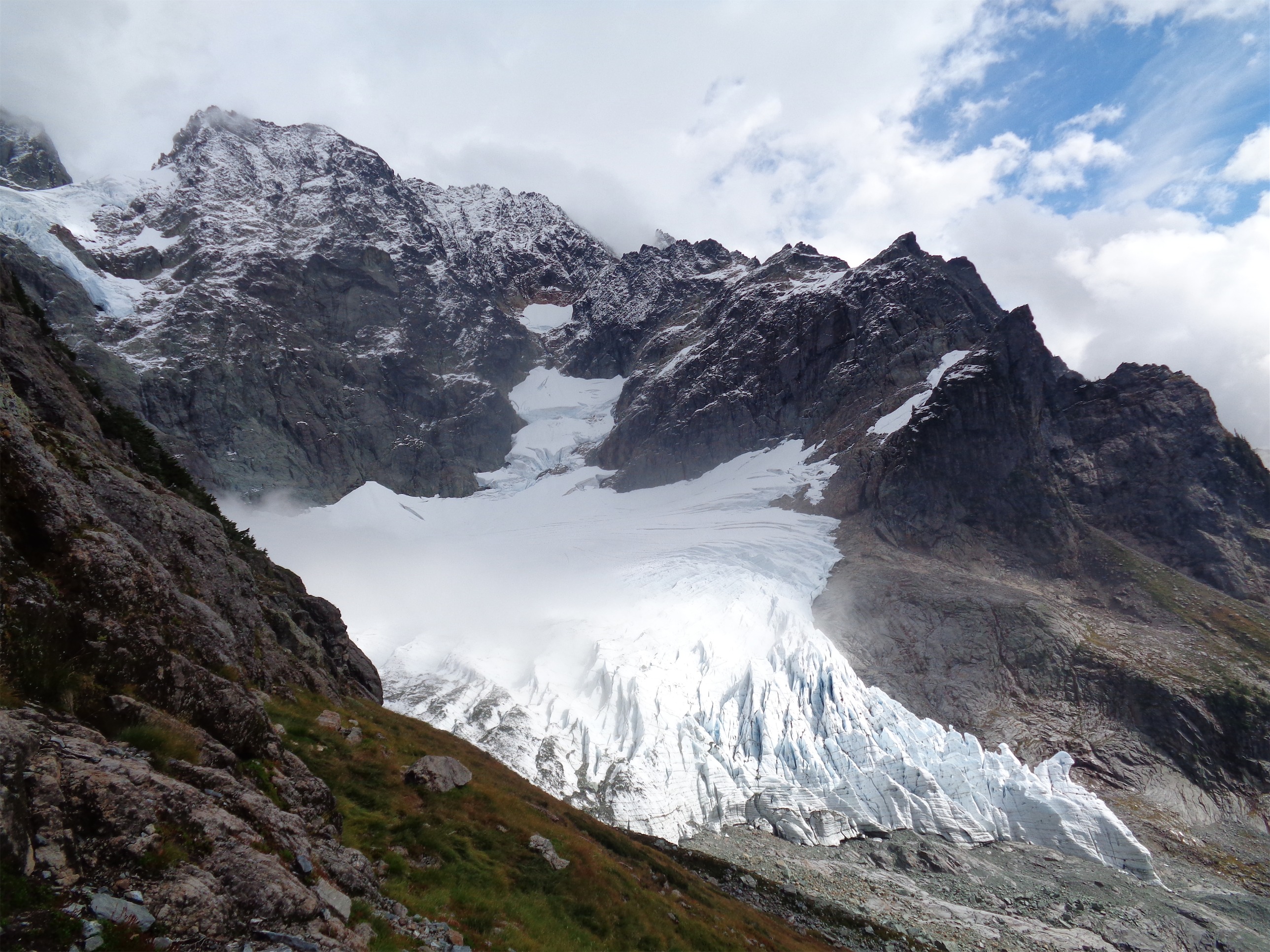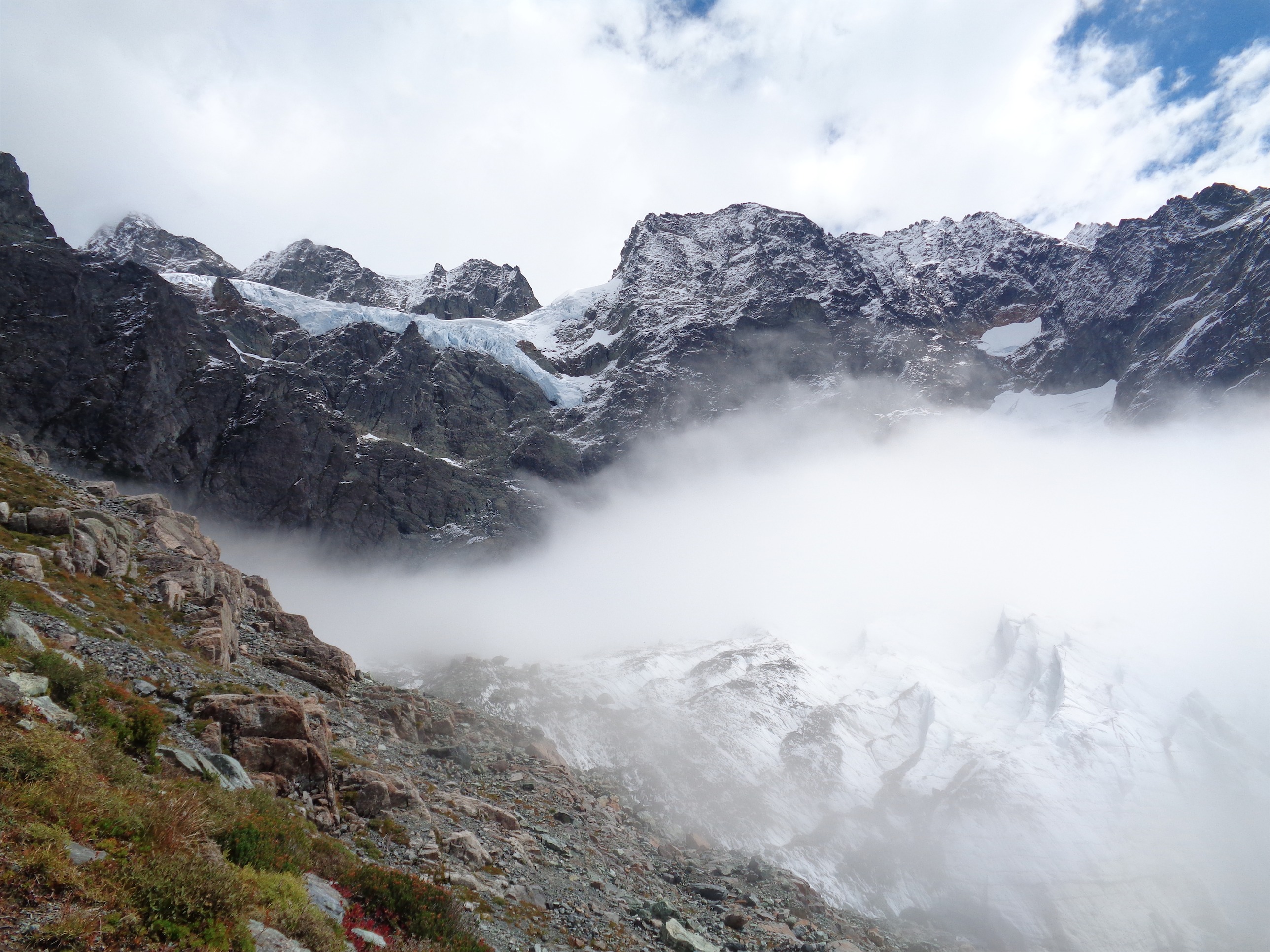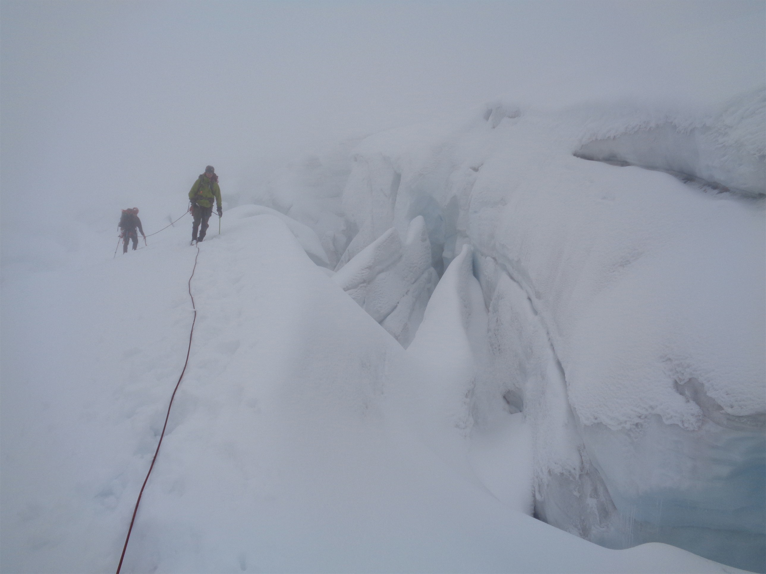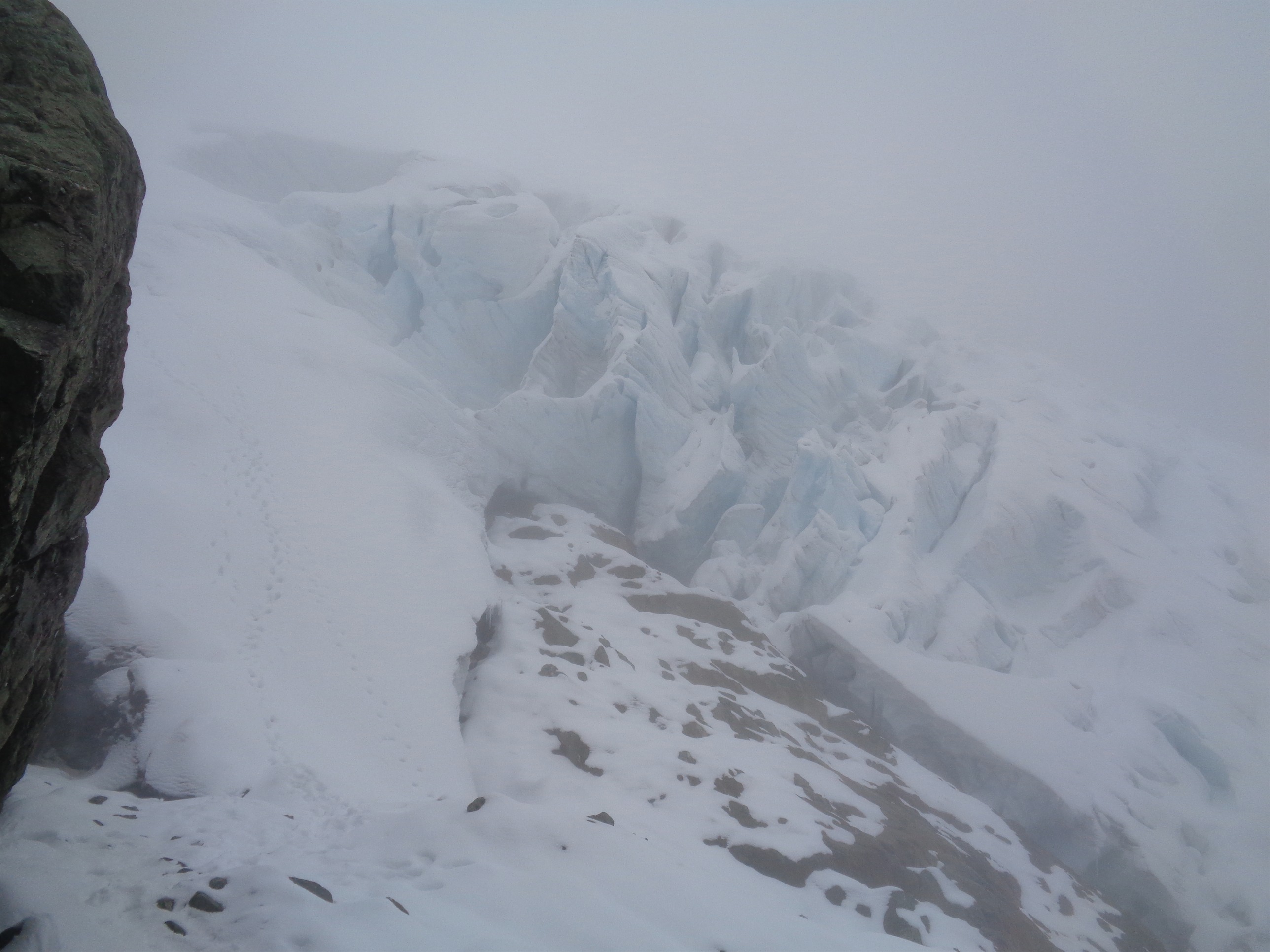 For once we were right, and the rest was clear sailing. Which is great, because it turns out crevasses are a lot harder to navigate when you can only see 15-20 feet in front of you. If we walk parallel to this one, will it end and we’ll be able to just go around it, or will it keep going until it meets a cliff or a bigger crevasse? You just don’t know. Fortunately, we made it to the base of the cliffs above the Upper Curtis, and we knew to hug those until we could hop up to meet the Sulphide, which came up quickly.