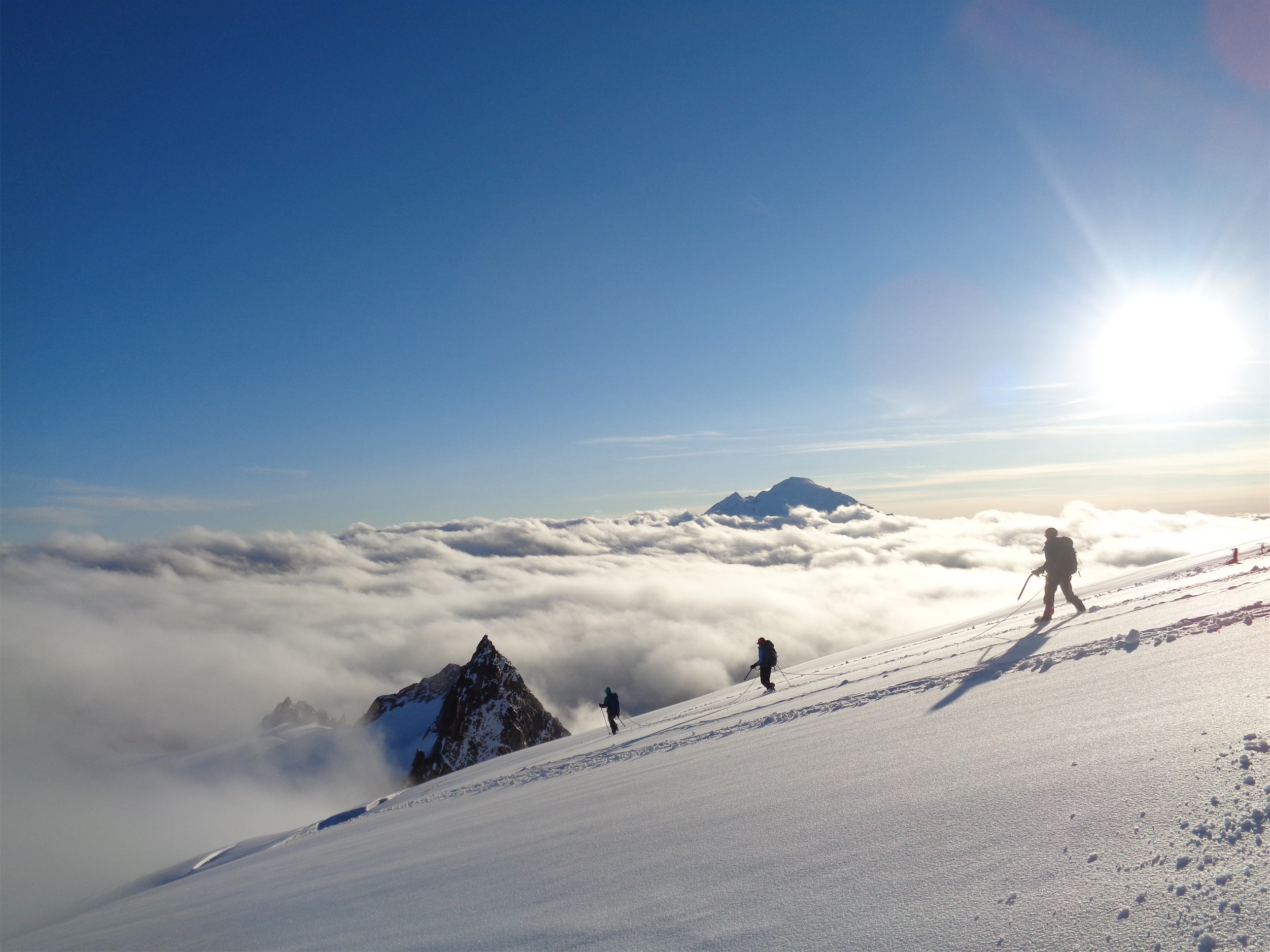 The summit pyramid was out, covered in fresh snow, the sky was blue for the first time since Friday morning (and that one glimpse of the glacier) and we could see a group of three descending! I took some sweet pics of them beneath the pyramid, and waited for them to get closer. As they passed our tent, I ran to talk to them (And mostly to ask for permission to get photos of them walking past). Because Baker was out, above the clouds, with the sun shining behind it! Koma freakin Kulshan, in all her glory.