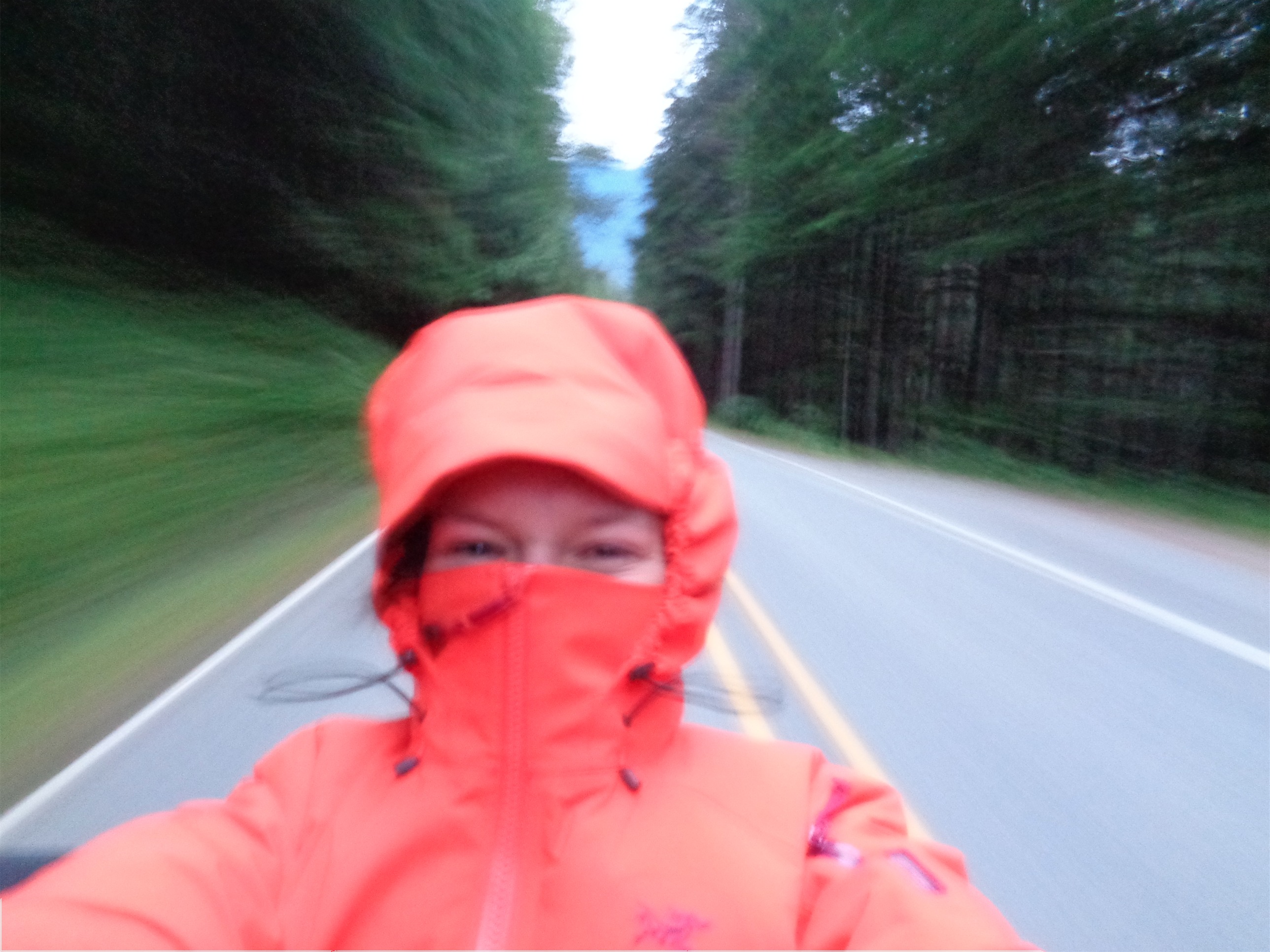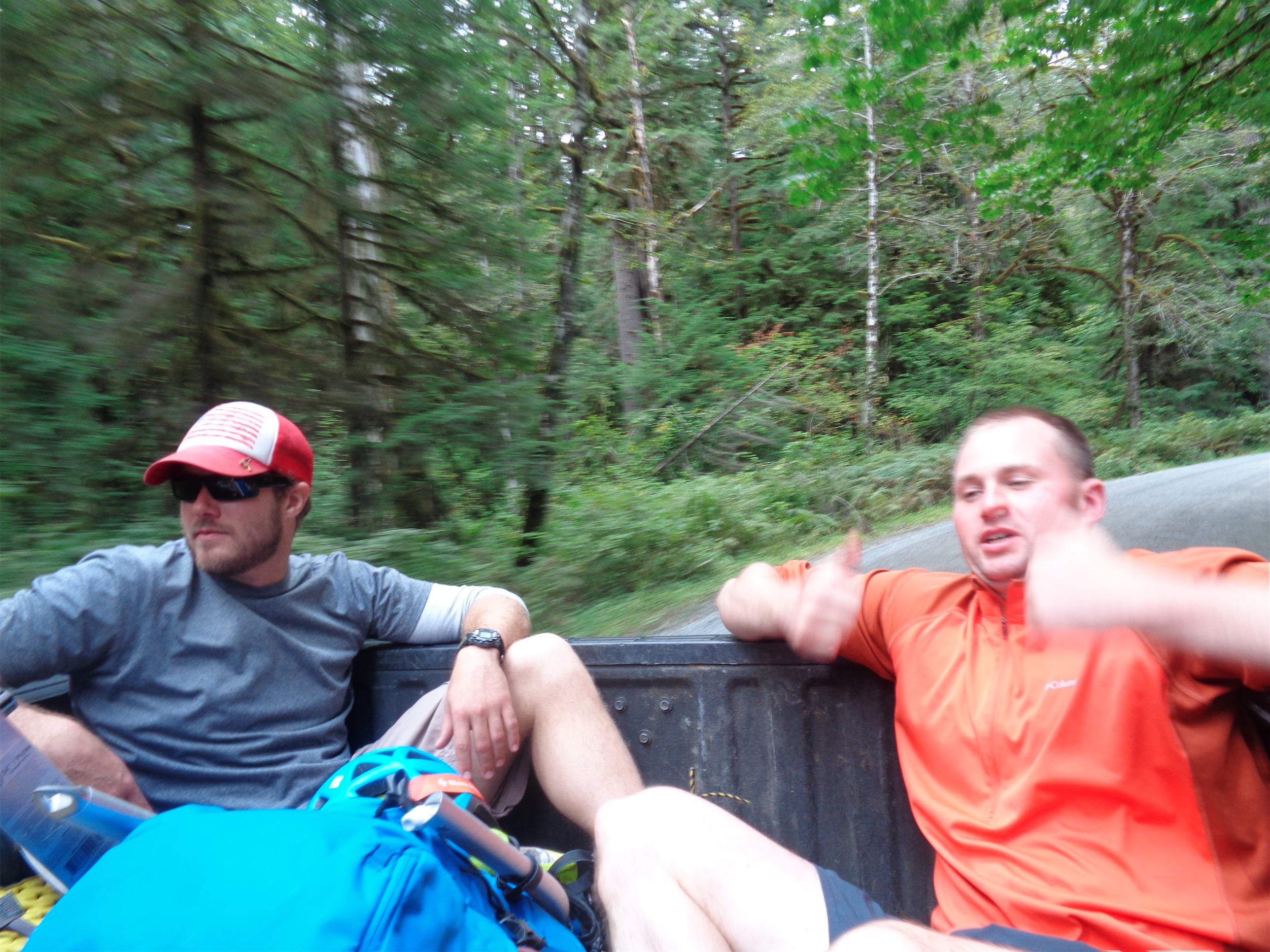We got dropped off in Sedro Wooley, got sandwiches at Subway, and sat on the curb at a gas station with our gear while we ate. So I was three days of wilderness adventure with no shower, eating a foot long (6 inch sandwiches are for wimps) with a 40oz soda because AMERICA. Waiting for someone to offer us a ride. And eventually, along came another pickup truck with a man and a dog, and again we piled into the bed of the truck. I put on my puffy and my hard shell, John even put on his ski goggles. 60mph in a truck, no problem. We’re all geared up.