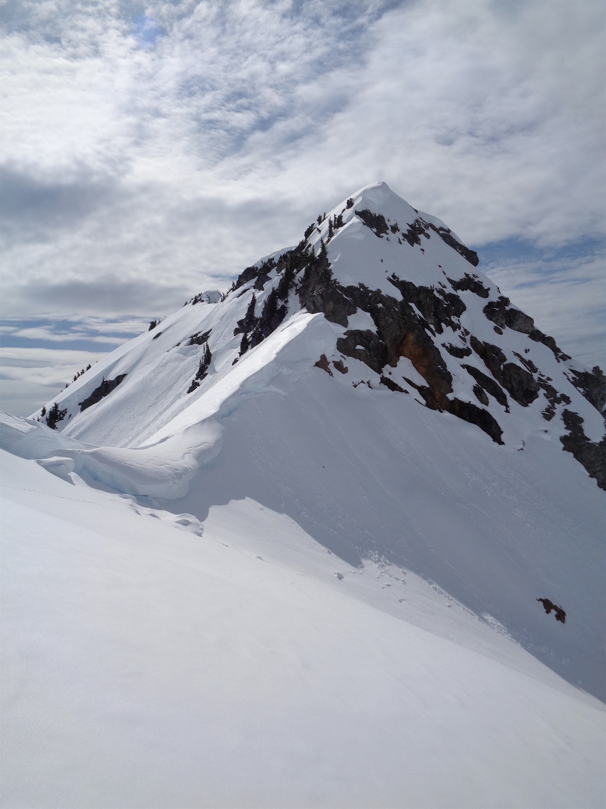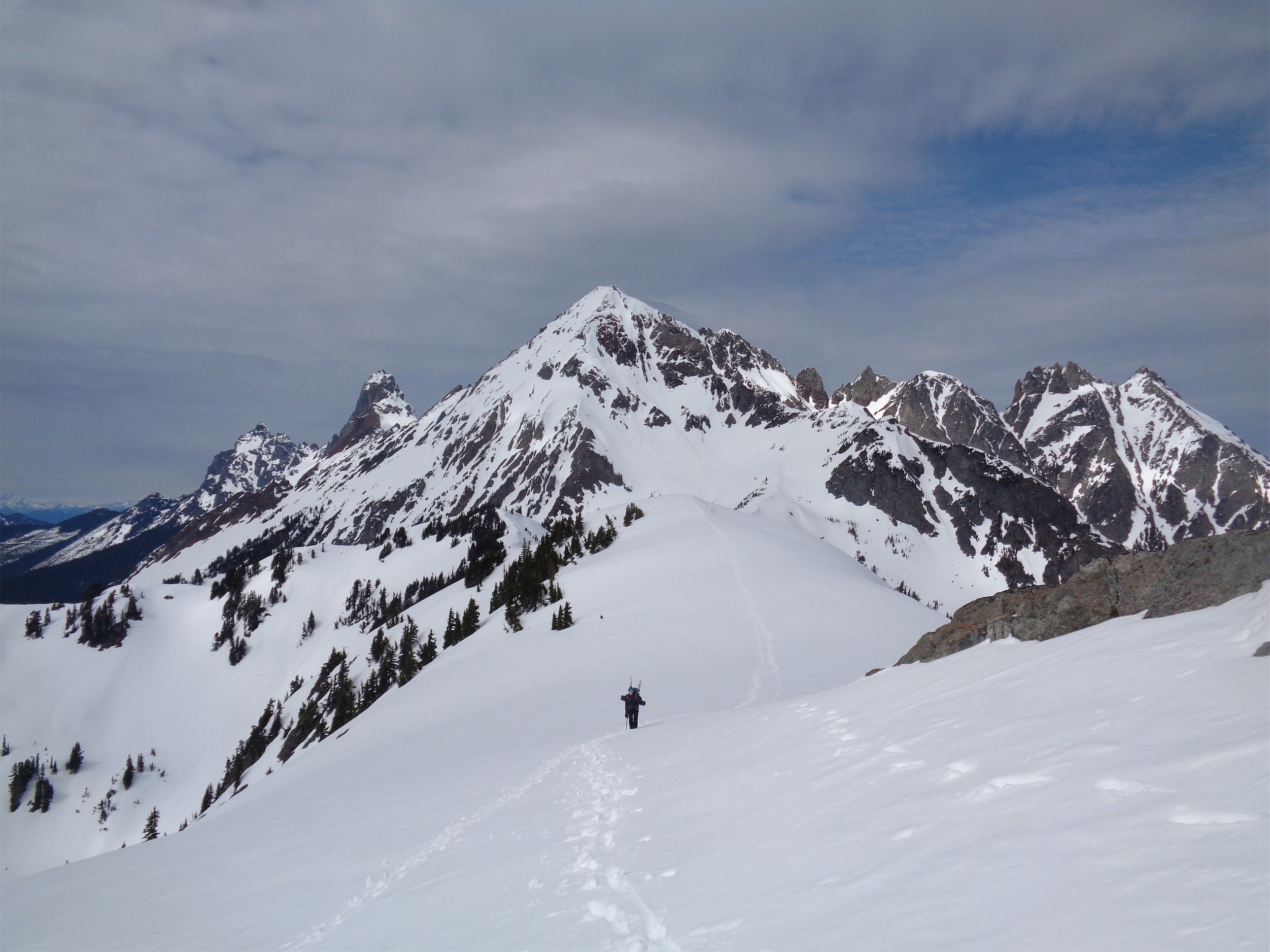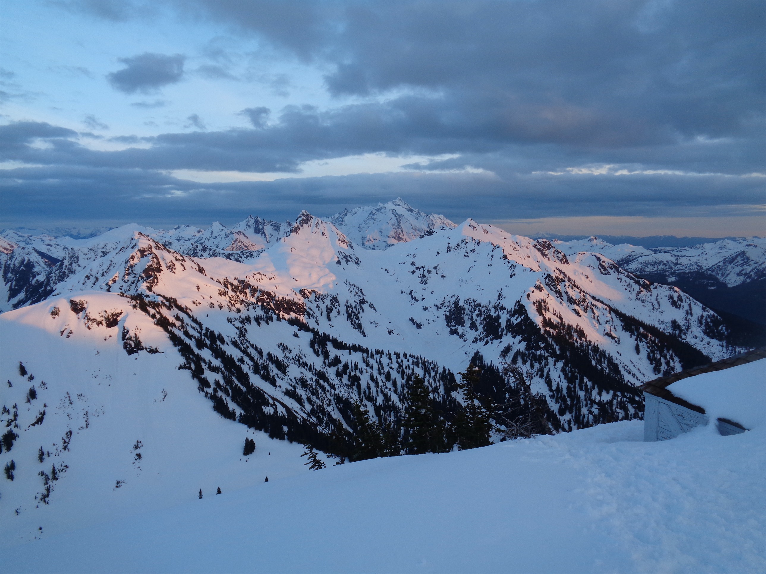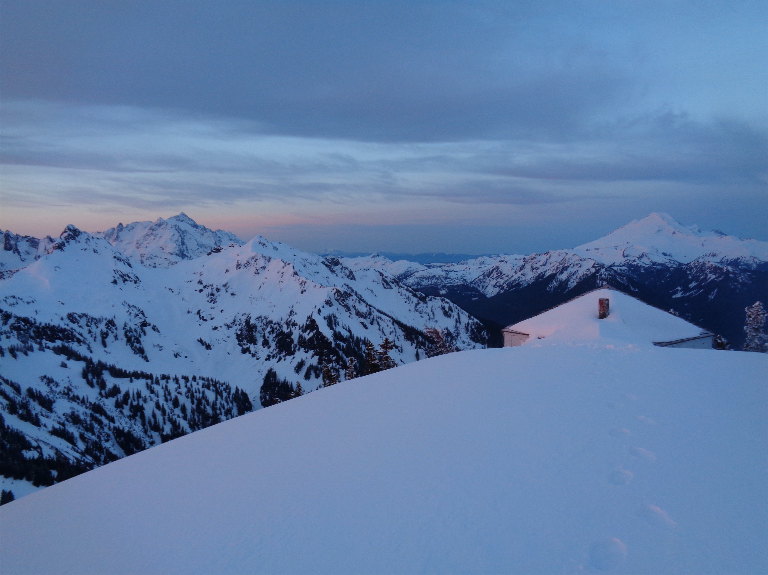 We snapped a bunch of pics and finally got to sleep around 6:30. Or I did, and I fell asleep to Tony prancing around outside singing “Here comes the sun, do do do dooo” and dancing to his own words (at least, I’m pretty sure that’s how it happened). Sam got up at 7 to get in some runs on the shoulder of Larrabee. I dozed until around 8:30 or 9, woke up, and ate half a bag of wheat things and a quarter pound of cheese. We spent the day lazing around the lookout, Tony and Calvin and Sam took some runs on skiis, everyone dozed on and off. At one point we hadn’t seen Sam in an hour or so (we had been tracking him along the ridge) and with snow softening so quickly, I started getting worried. There were two sets of tracks, both of which led straight into avalanche gullies. I grabbed some snacks and went to hike down and hopefully meet him. We knew he was probably fine, but I’m a paranoid person in the backcountry, and I’d rather be overly cautious than have the one time I don’t go look for someone be the one time they’re in trouble.