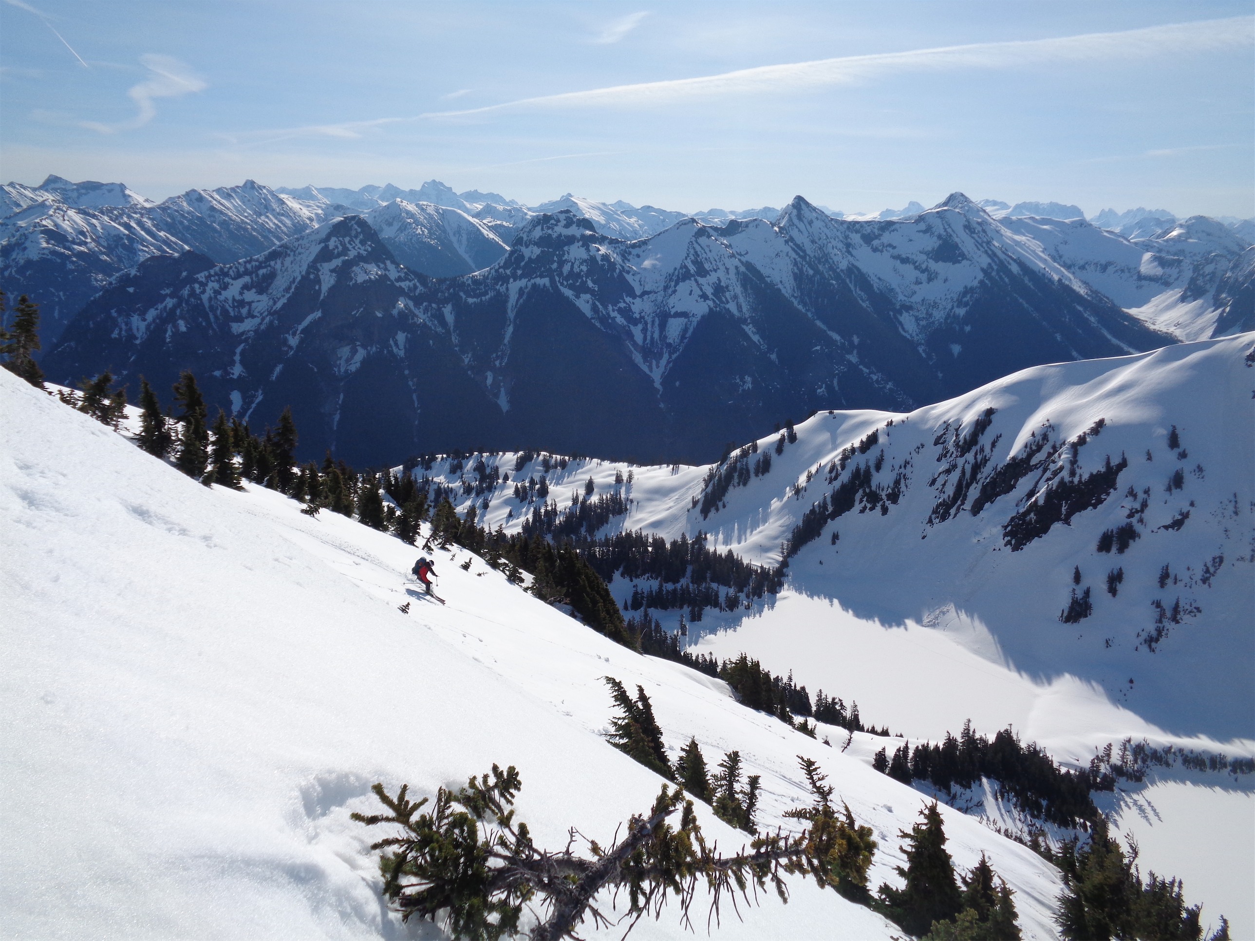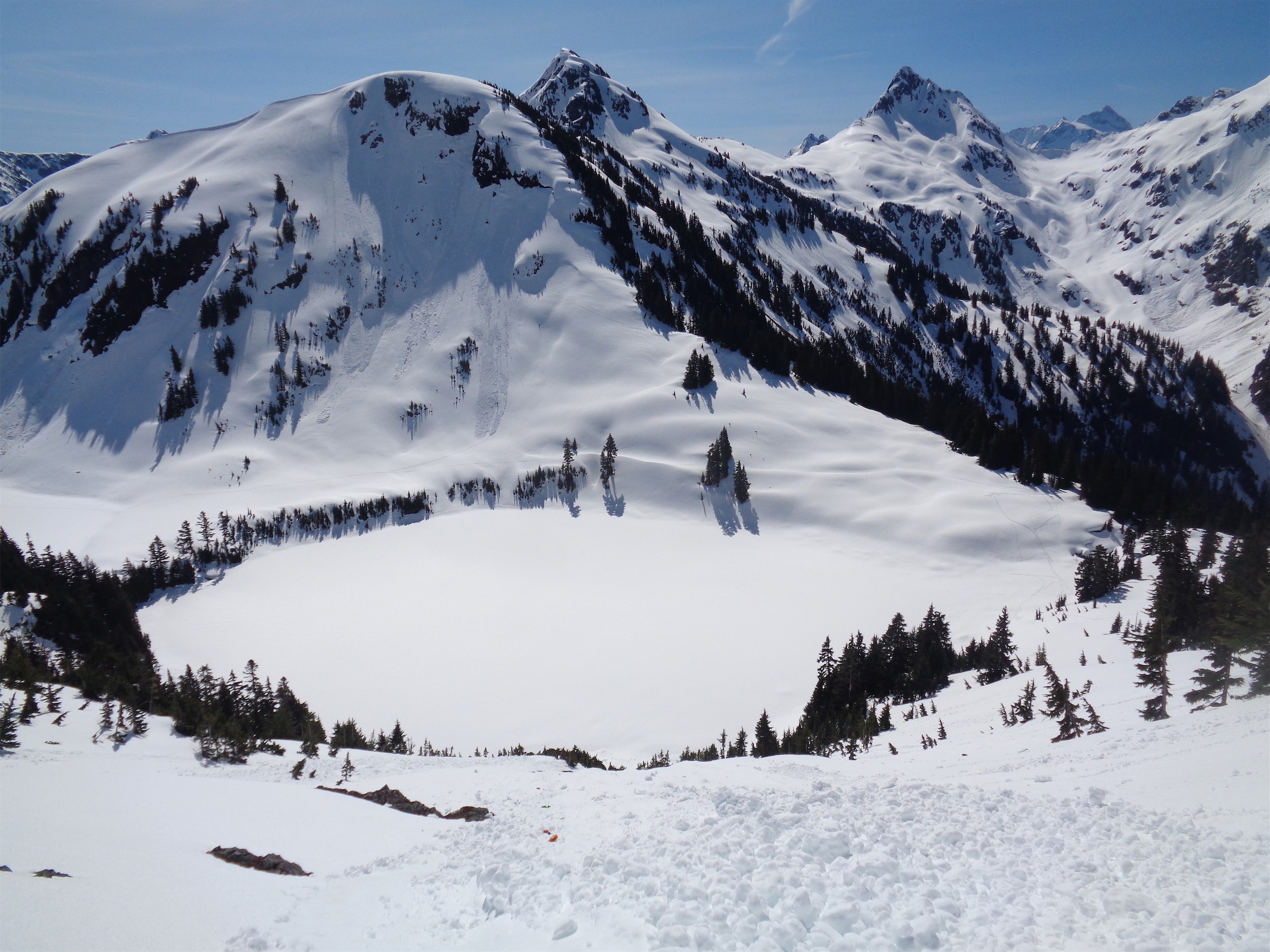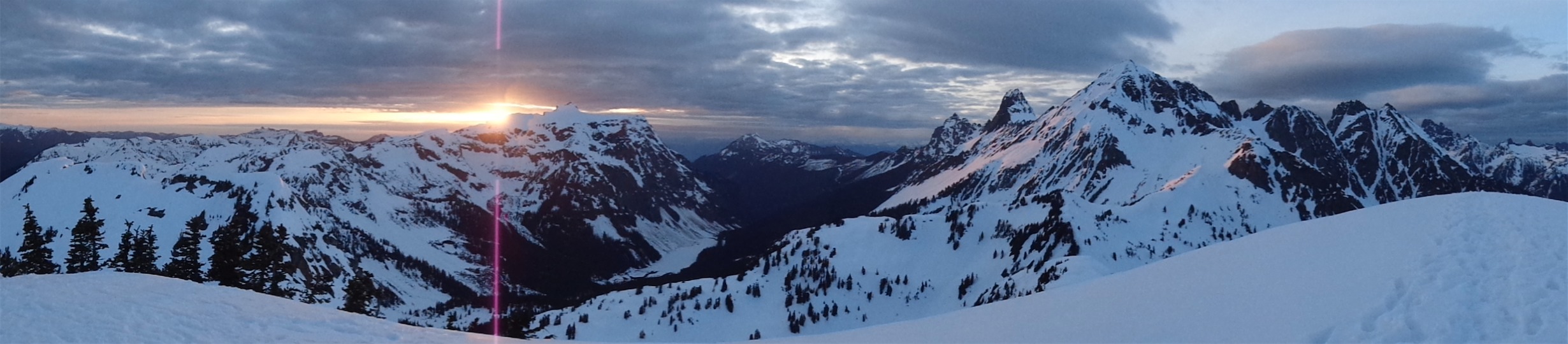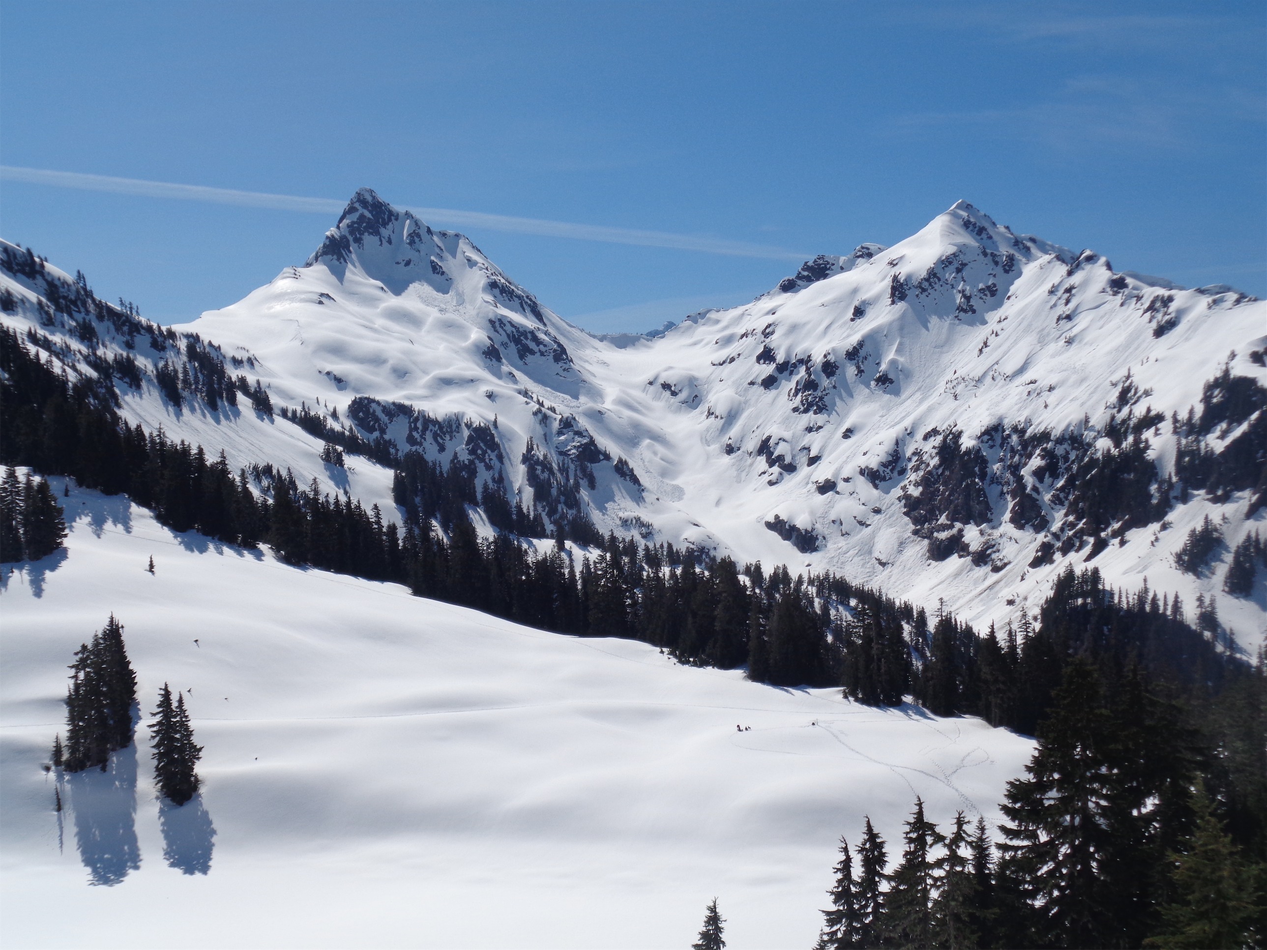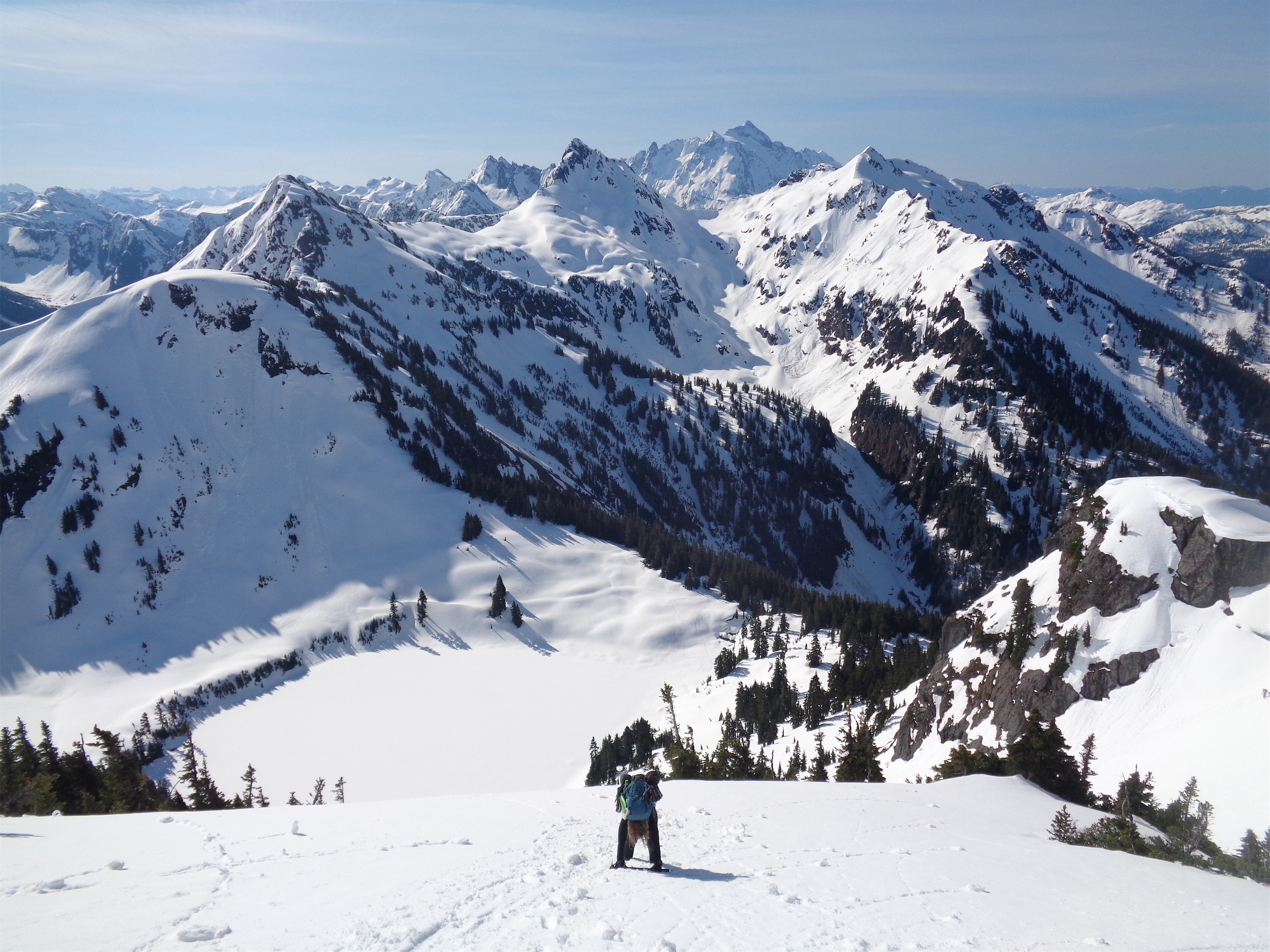 We snapped a bunch of pics and finally got to sleep around 6:30. Or I did, and I fell asleep to Tony prancing around outside singing “Here comes the sun, do do do dooo” and dancing to his own words (at least, I’m pretty sure that’s how it happened). Sam got up at 7 to get in some runs on the shoulder of Larrabee. I dozed until around 8:30 or 9, woke up, and ate half a bag of wheat things and a quarter pound of cheese. We spent the day lazing around the lookout, Tony and Calvin and Sam took some runs on skiis, everyone dozed on and off. At one point we hadn’t seen Sam in an hour or so (we had been tracking him along the ridge) and with snow softening so quickly, I started getting worried. There were two sets of tracks, both of which led straight into avalanche gullies. I grabbed some snacks and went to hike down and hopefully meet him. We knew he was probably fine, but I’m a paranoid person in the backcountry, and I’d rather be overly cautious than have the one time I don’t go look for someone be the one time they’re in trouble.