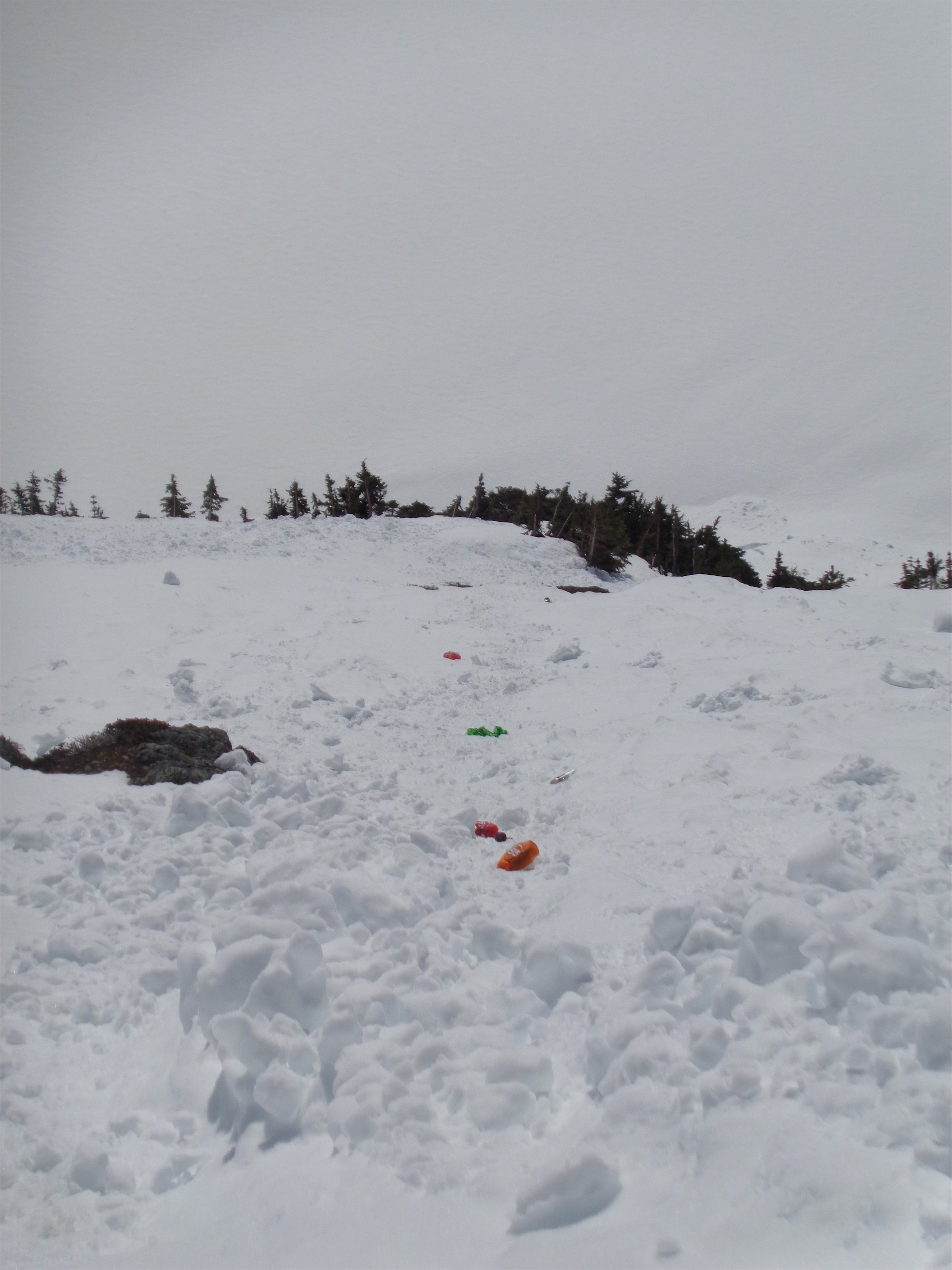 “Isn’t it a little ironic that as soon as I take the rope off, the bag falls 400ft?” I turned to Cheryl as we stared at her pack tumbling down past Calvin, Tony, and Quinn below us, shedding its contents as it went. Shovel here, pole there, beer on that side, stuff sack to the right. Tony came up to check on us after seeing the pack come crashing through a patch of trees above them. Shirtless, working on his base burn. Now that Cheryl was feeling a little more secure with the step-glissade technique (following my steps, step, step, butt scoot, repeat) I picked up the pace to go collect her stuff, and Quinn came along to help. Her stuff was spread out like a rainbow. Everything I came up to, I clipped to my pack. Growler. Half of a pole. The shovel. A jacket. A stuff sack. The other half of the pole. Another stuff sack. Another shirt. A third stuff sack. The pack took a brief break, and then kept falling as we watched helplessly. I looked ridiculous with a garage sale of random gear hanging from my pack and body.
