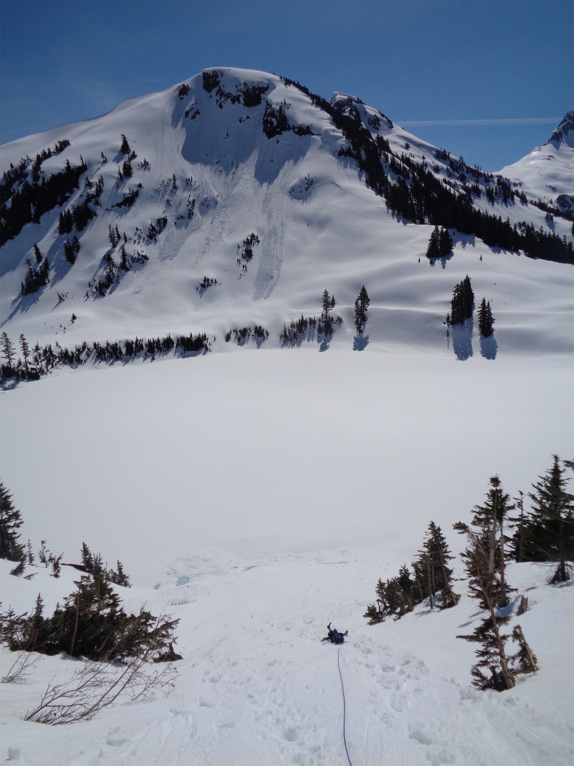 As I watched her descend, Cheryl slipped, and started going the slope headfirst. I was about 50ft below her and a few feet off to the side, watching her tumble. She hit a small patch of trees that flipped her onto her stomach going feet first. “Can you arrest?! CAN YOU ARREST! ARREST! GET THE AXE AND ARREST” I could see the ice axe attached by a leash, but she wasn’t gripping it. She finally pulled it to her and managed to get it in the ground as the slope mellowed out. The scary part? The slope mellowed out for another 10 feet, and then there was a cliff band, which dropped straight down another 40ft.