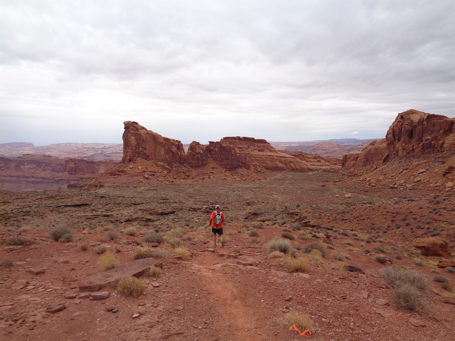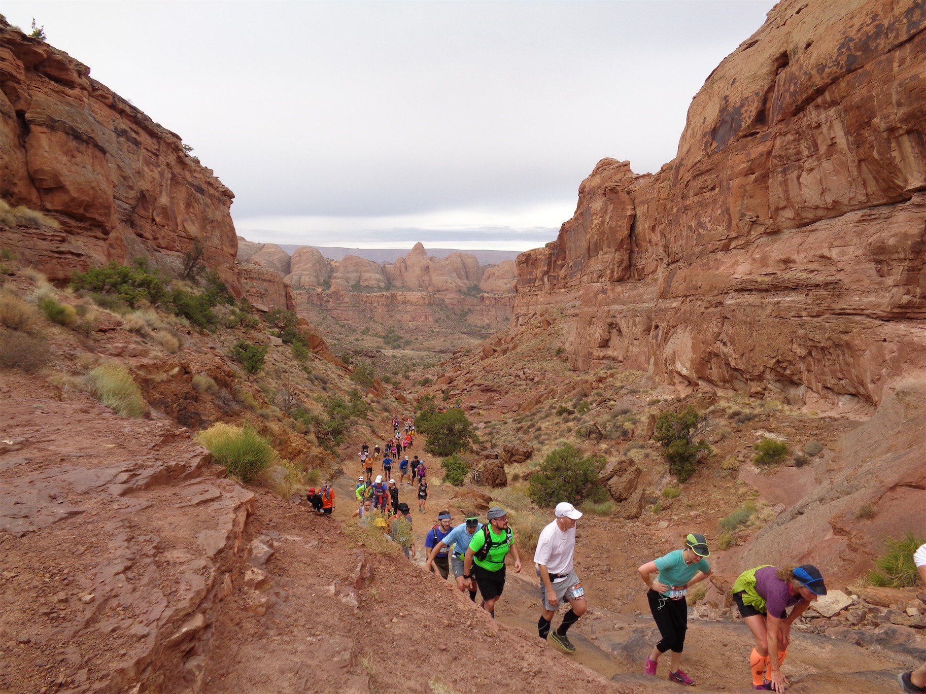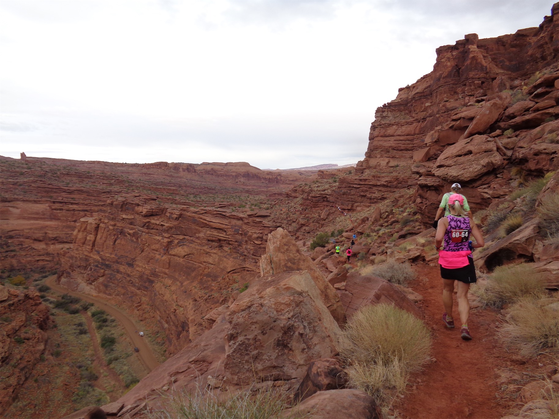 Oh, did I mention that the one day I fly to the desert is the one day it’s cloudy/drizzly in the entire second half of 2016? Yeah, it was rainy. In Moab. The desert. But that packed down some of the dust, and made the sandy parts easier to run. I had popped aspirin which is my only hope of easing my calf issues, and it kept them at bay, like a 5/10 on the swollen scale instead of 9/10 like a few of the past runs. And of course, mentality has a huge impact on any race. Everyone was jogging, we were darting to the sides of the trail to take photos and marvel at views and for once I did not bitch when there were bottlenecks in front of us, which is an unfortunate reality with any single track trail race, especially one that has a few scramble sections. Second tip: Take all of the photos. It’s a break without admitting you’re taking a break.