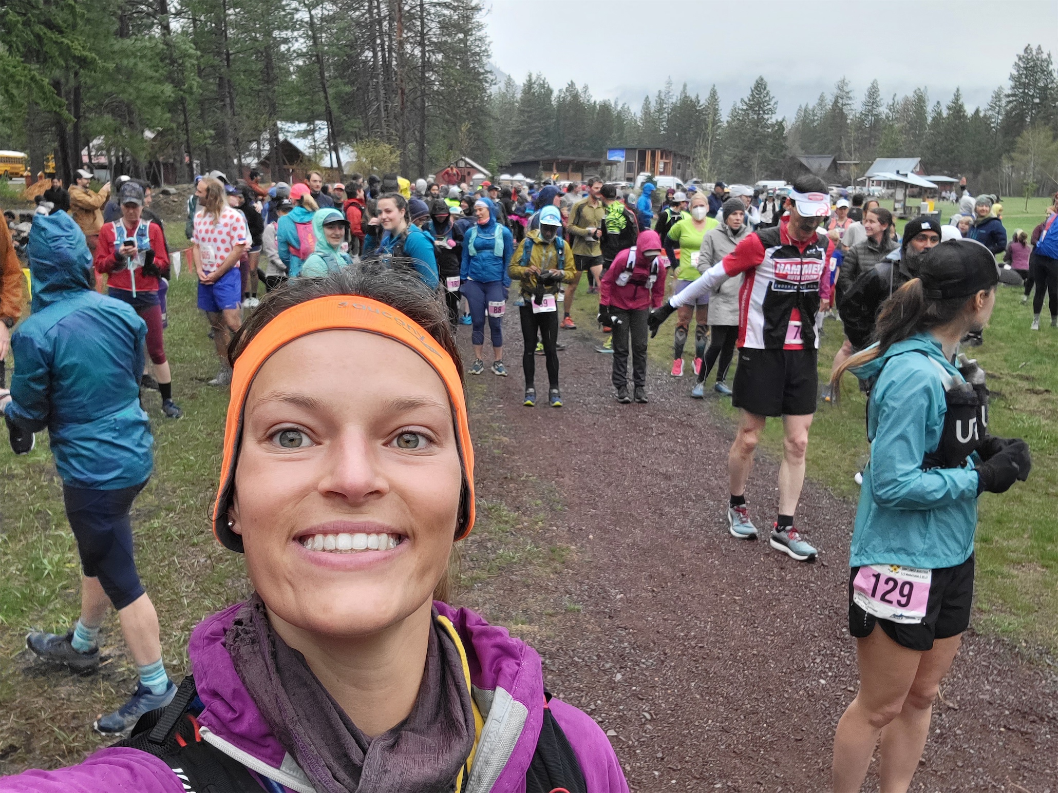 Brooke and Amber dropped me at the Marathon shuttle before driving themselves to the half marathon start. The shuttle took me from the finish line in Twisp up to the starting line in Mazama. The driver was kind enough to give me a hefty garbage bag to stay dry at the starting line (or you know, bivvy in if I totally died mid race) and I huddled under an outdoor pergola(?) with dozens of other runners until it was 5 minutes before the start. We hobbled over to the starting line in the drizzle, did a countdown, and took off. I let everyone pass me. Just you wait I’ll take you back down at like mile 23 when you’re dying and I’m cruising. At least that’s what I tell myself. Most of them just left me behind it’s okay.
