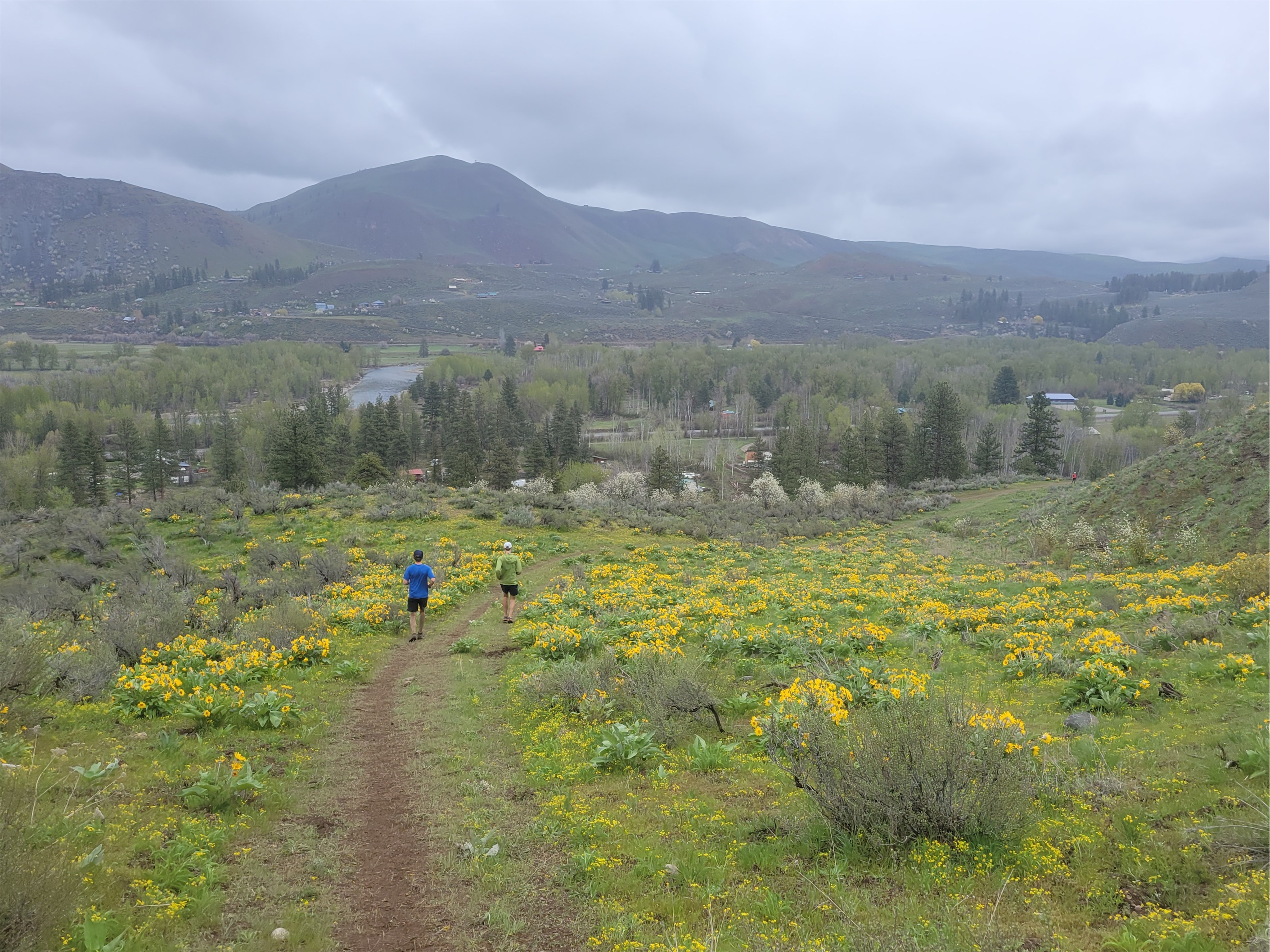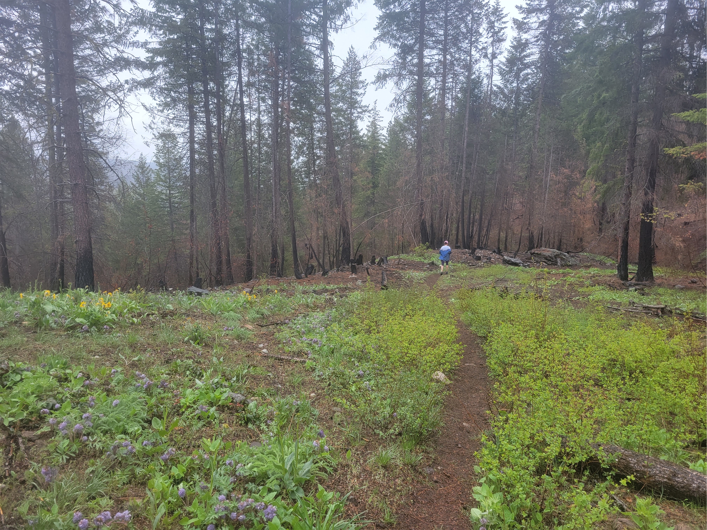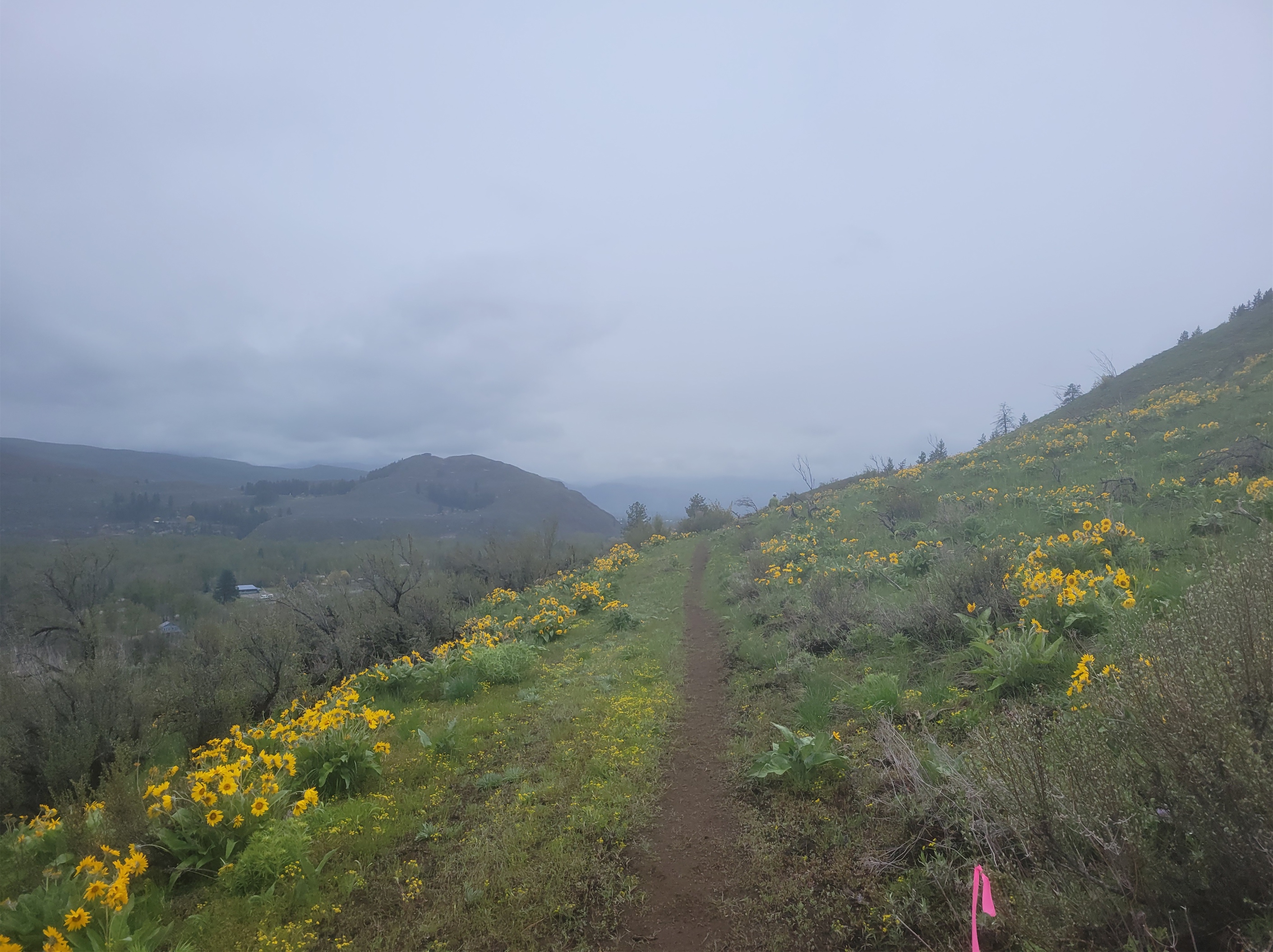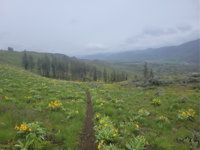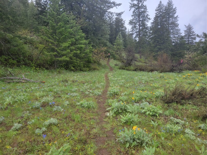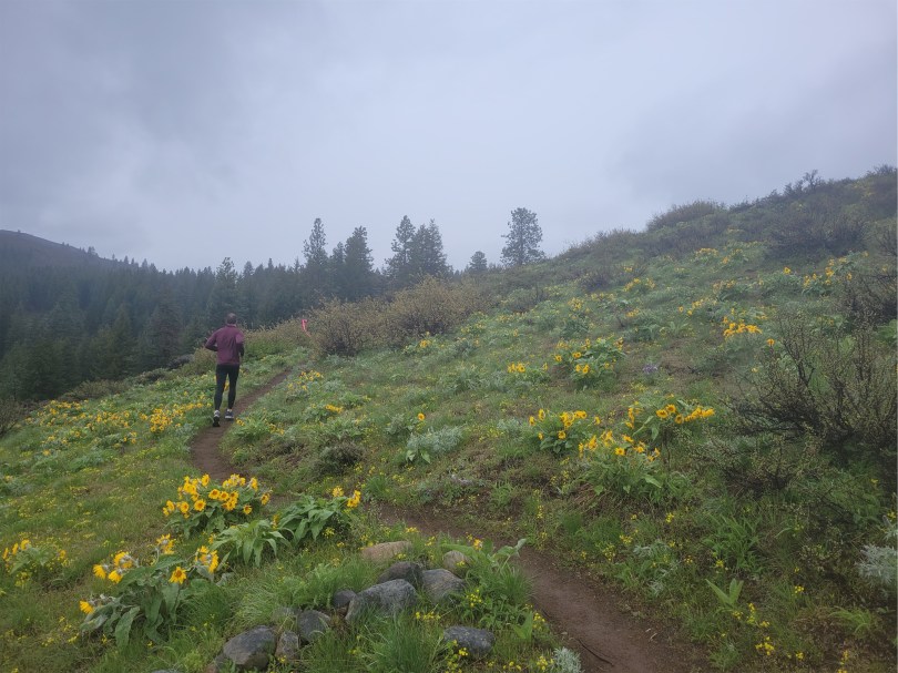 I figured they must have saved the best wildflowers for the second half, right? After all, that is where the half marathon course is, so the best must be yet to come. Single track trail, and finally – a patch of balsam root! And another! And a switchback! I started snapping photos. I chatted with some new trail friends, several who were on their first marathon ever, several who had done the sunflower marathon before and swore I had to come back next year because the flowers this year were so sad. I kept stopping to snap pics and let people run around me while I took pics of them. On multiple occasions I resisted the urge to smash my phone on the ground when it wouldn’t take pics because the touch screen can’t differentiate between my finger and a raindrop. I finally decided I needed to give up on pics and just jog for a bit while my phone and I got some space from each other.