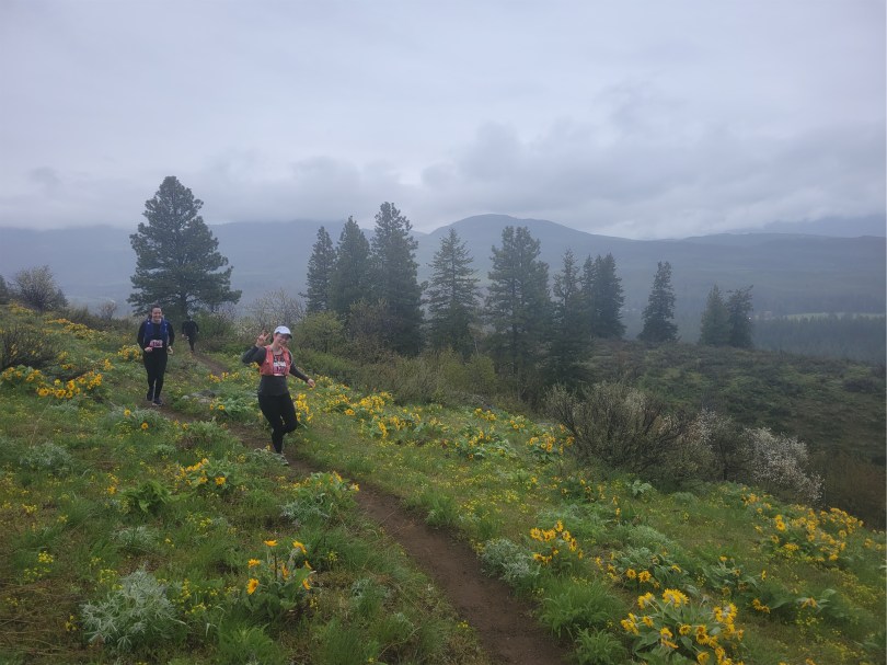 The aid station did have potato chips, and I grabbed more of those and oreos and threw some gatorade or gatorade equivalent in my face. I’m like the least dialed runner ever. Okay, final stretch, perk up. Wait no, we have to go uphill, use the rage first. I was hiking faster than the other runners around me were running, well besides the super fresh relay runner who at least breathed normally. Get outta here leave me alone hurry up I don’t want to hear it. The other runners noticed my efficient walking and joined me. We crested the hill and the rain finally let up and holy shit, the sage brush and flowers started appearing again. The heavy breather was gone. The air smelled like fresh sage. THERE are the endorphins I needed. Thanks body. My legs felt fresh again. I laughed passing the cameraman. Is this where I pretend to look good?! A guy cruising uphill passed me playing Dancing in the Moonlight out loud on a speaker, I lit up. I love this song! Keep up I wanna listen! I started passing people. Let’s go baby. I don’t know how many miles are left and I don’t want to know. Can’t be much further at this point.