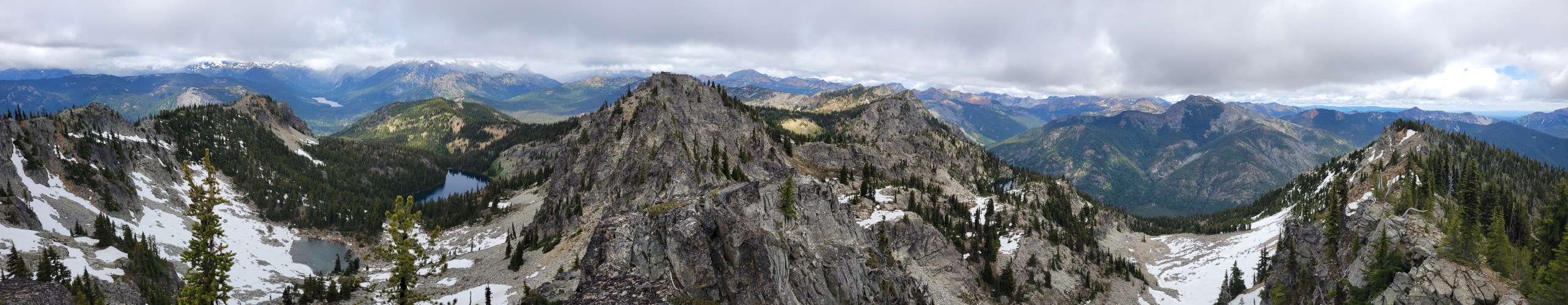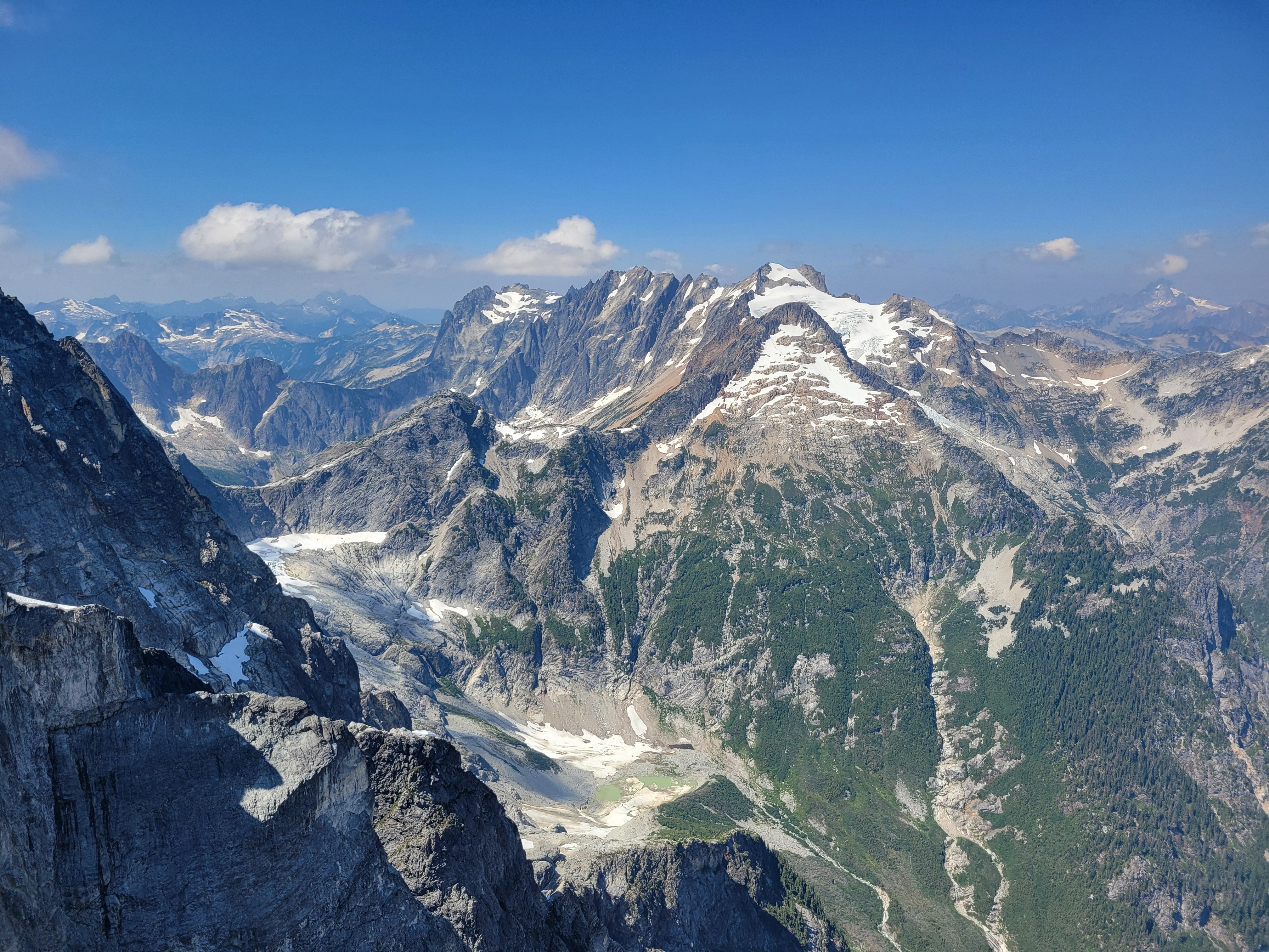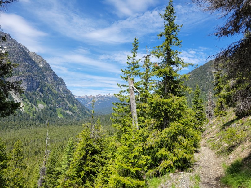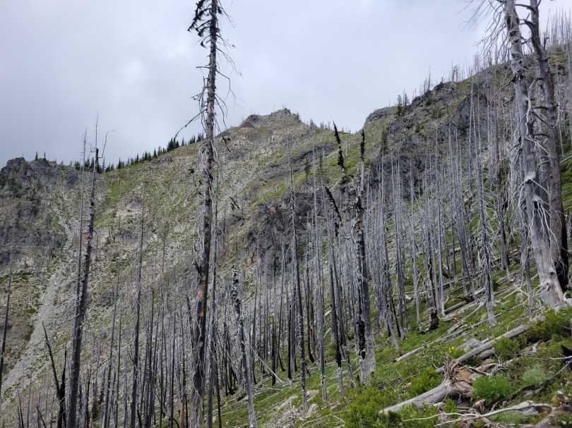 It had backed off to a drizzle. I strapped my soaking wet tent to the outside of my pack to spare everything on the inside and we took off. The first mile or two was stupid, generic slopes in the mist. And then we crested the next pass and hit larches and holy crap the glimpses we got were such teases. Toes of glaciers hanging down rock walls between larches! A huge moraine, with a lake I’d have demanded we hike to if it hadn’t been raining. The rolling slope to the east that we could have hiked up easily for better views, if we hadn’t been socked in by clouds. Oh man. But at least we only had to go four miles. Four miles of +2000ft and then -2000ft. Because of these below-treeline-only-campsites.