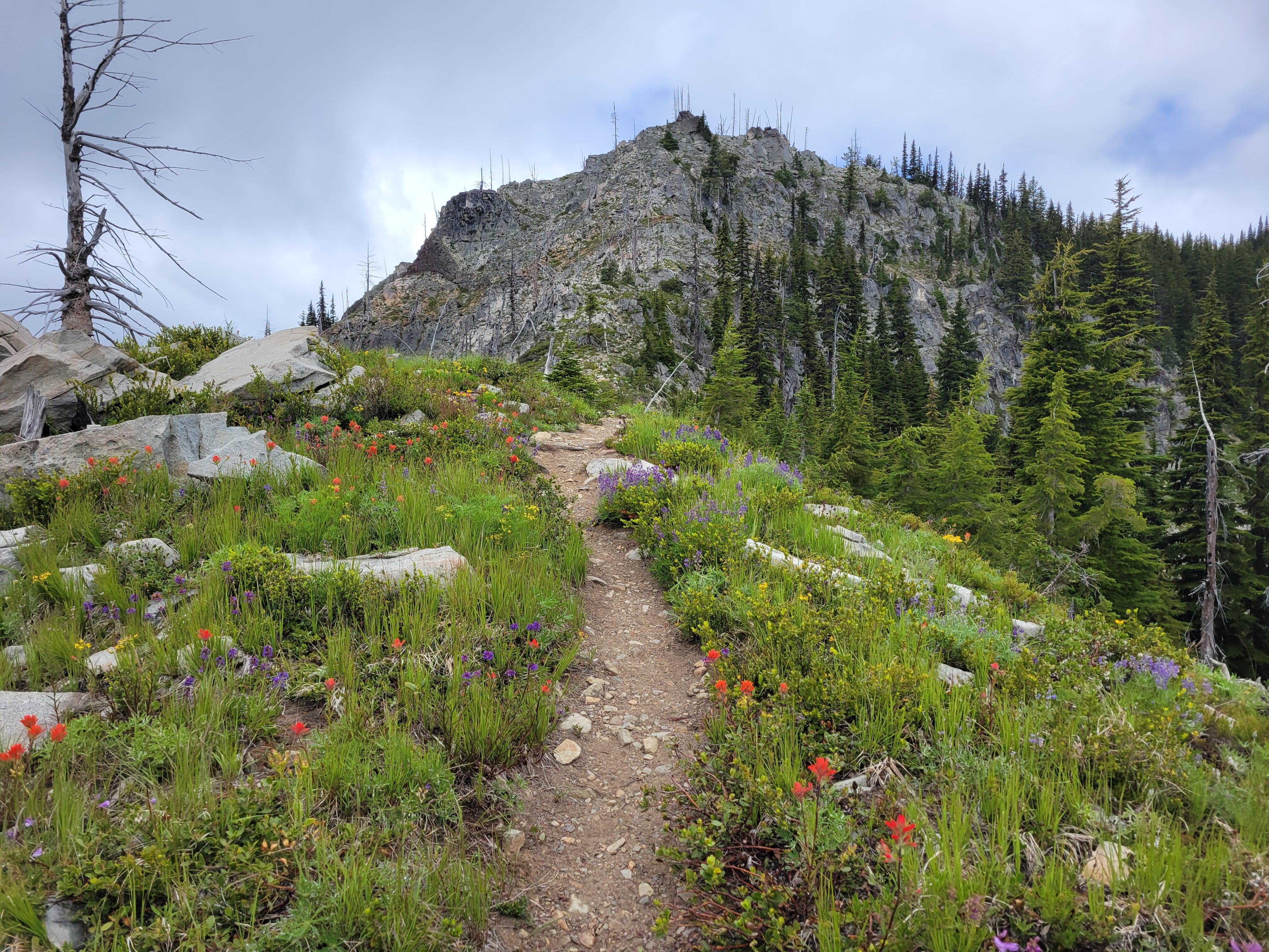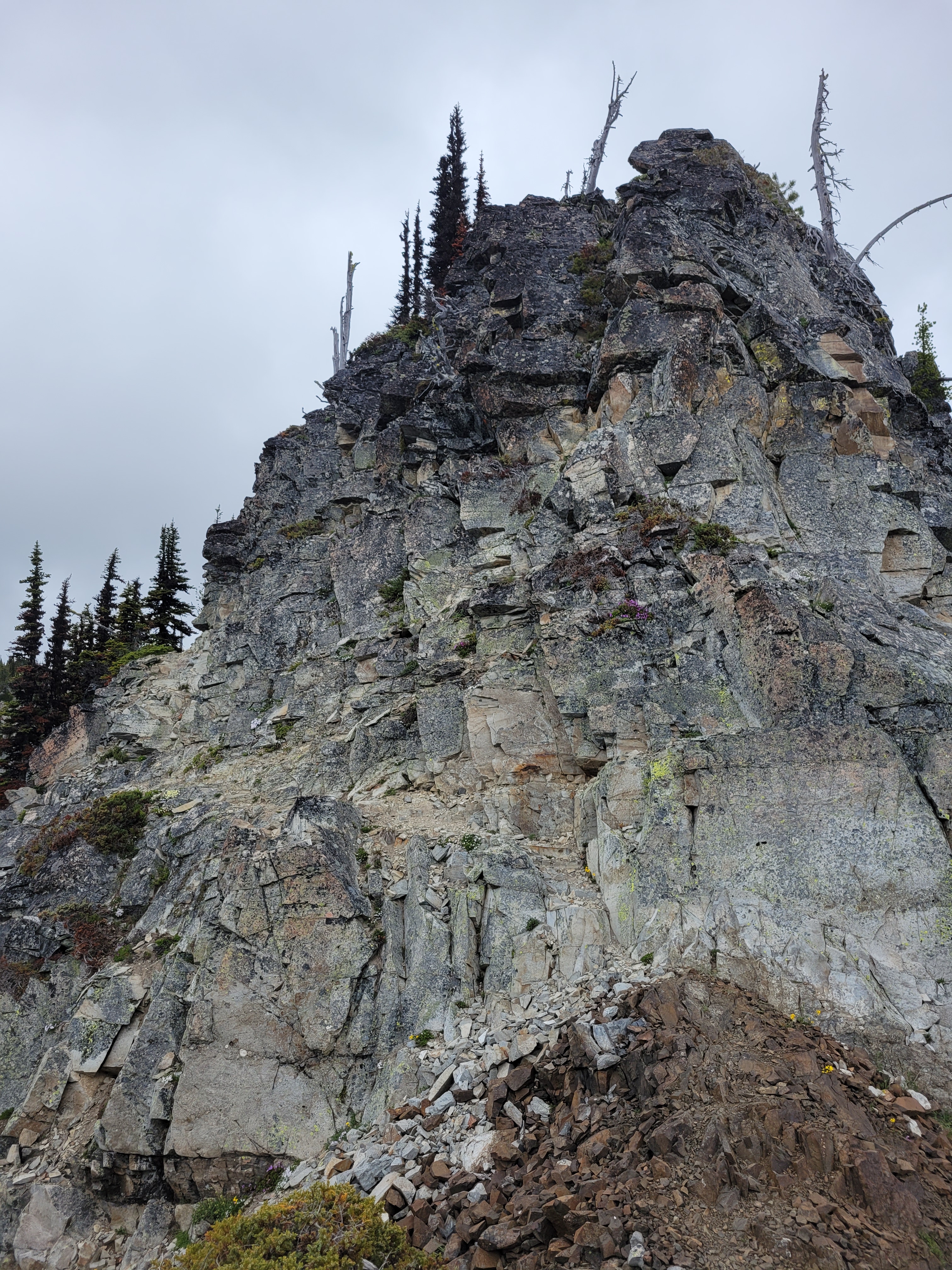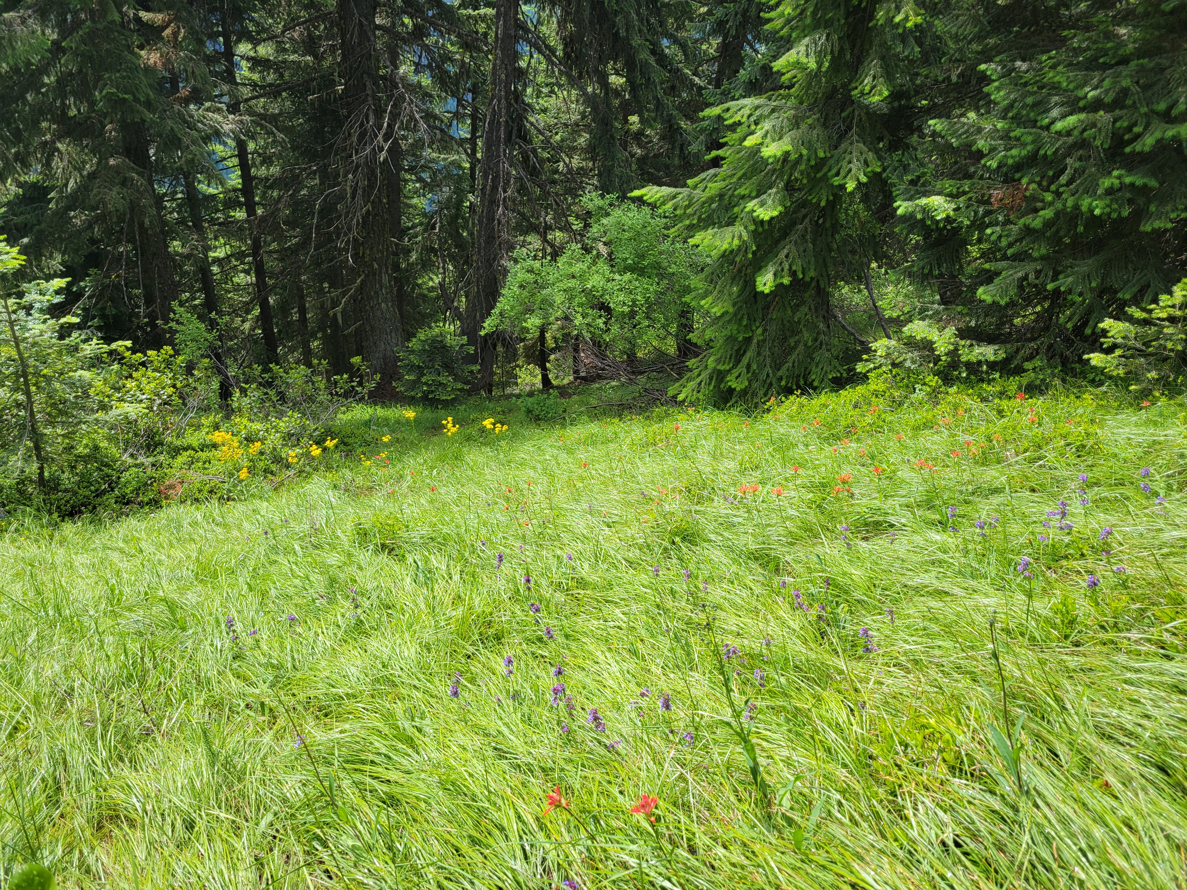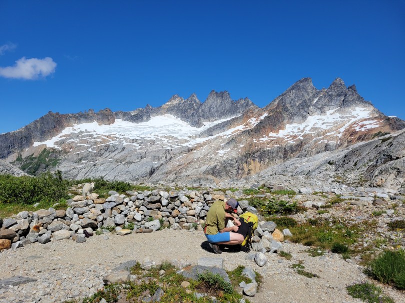We got to camp around 3pm and did basically what we had done that morning, set up tents and sat in dry spots for as long as we could tolerate. 5pm was dinnertime, we huddled in a dry grove between trees. Nobody was using the official picnic tables, which were in clearings fully exposed to rain. I think I was in my sleeping bag by 6:30pm where I slept for 12 hours because there was nothing else to do in the rain and the cold and this was another campsite below tree line with no larches and no views and only trees and probably bears. I peeked my head out occasionally to see if clouds were moving. The one pro of camping below tree line is some of the trees are dense enough that they maintain dry spots so you can at least sit outside briefly. I barely survived the pit toilet. It smelled horrible. My head cold must finally be passing.
