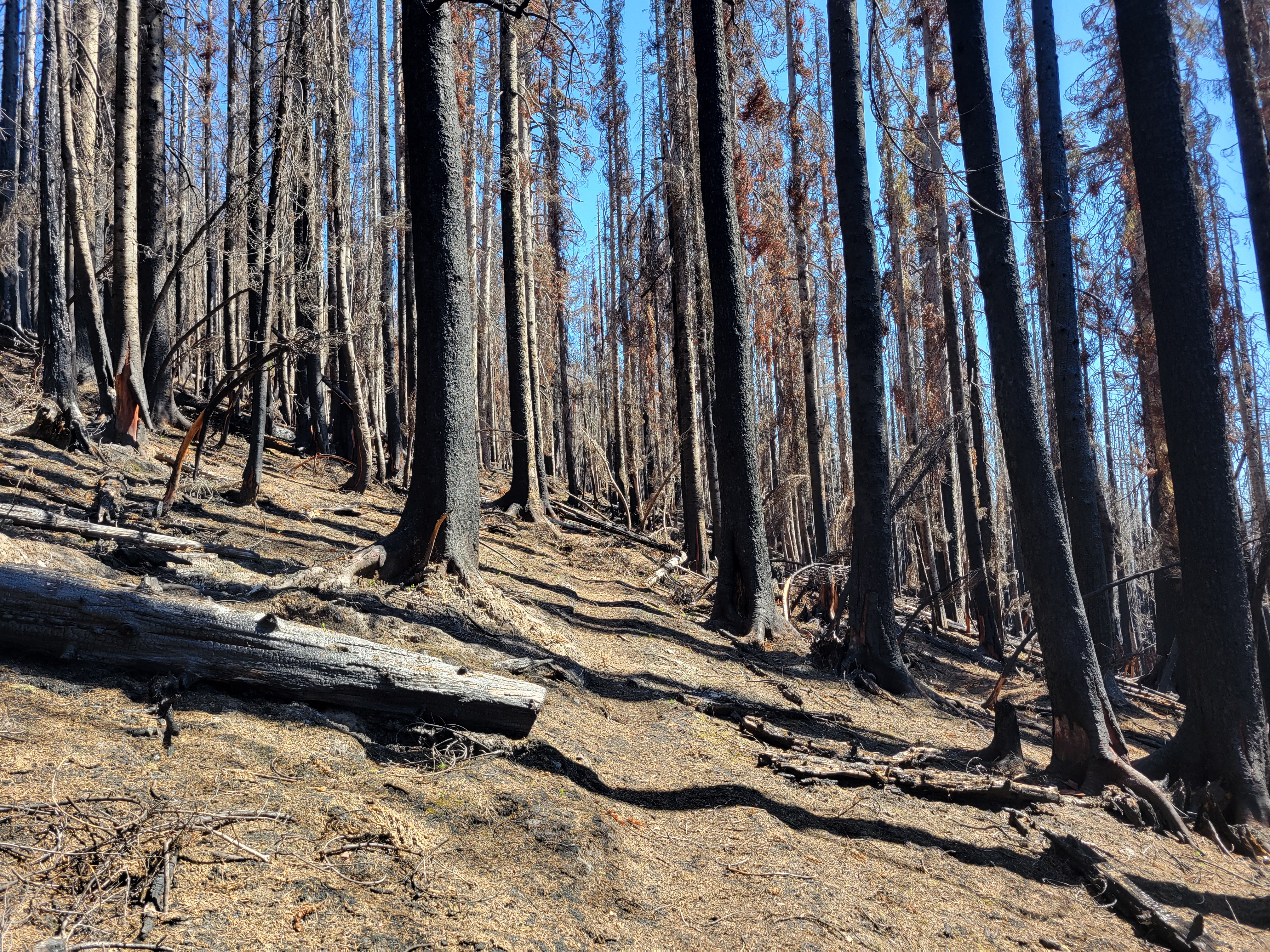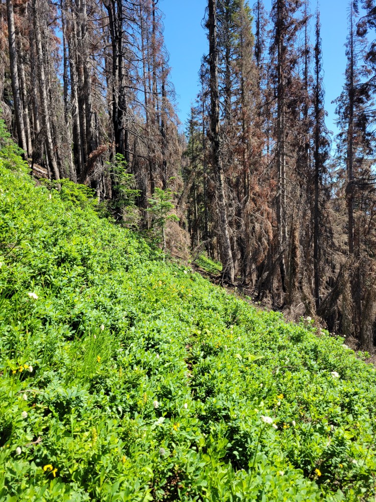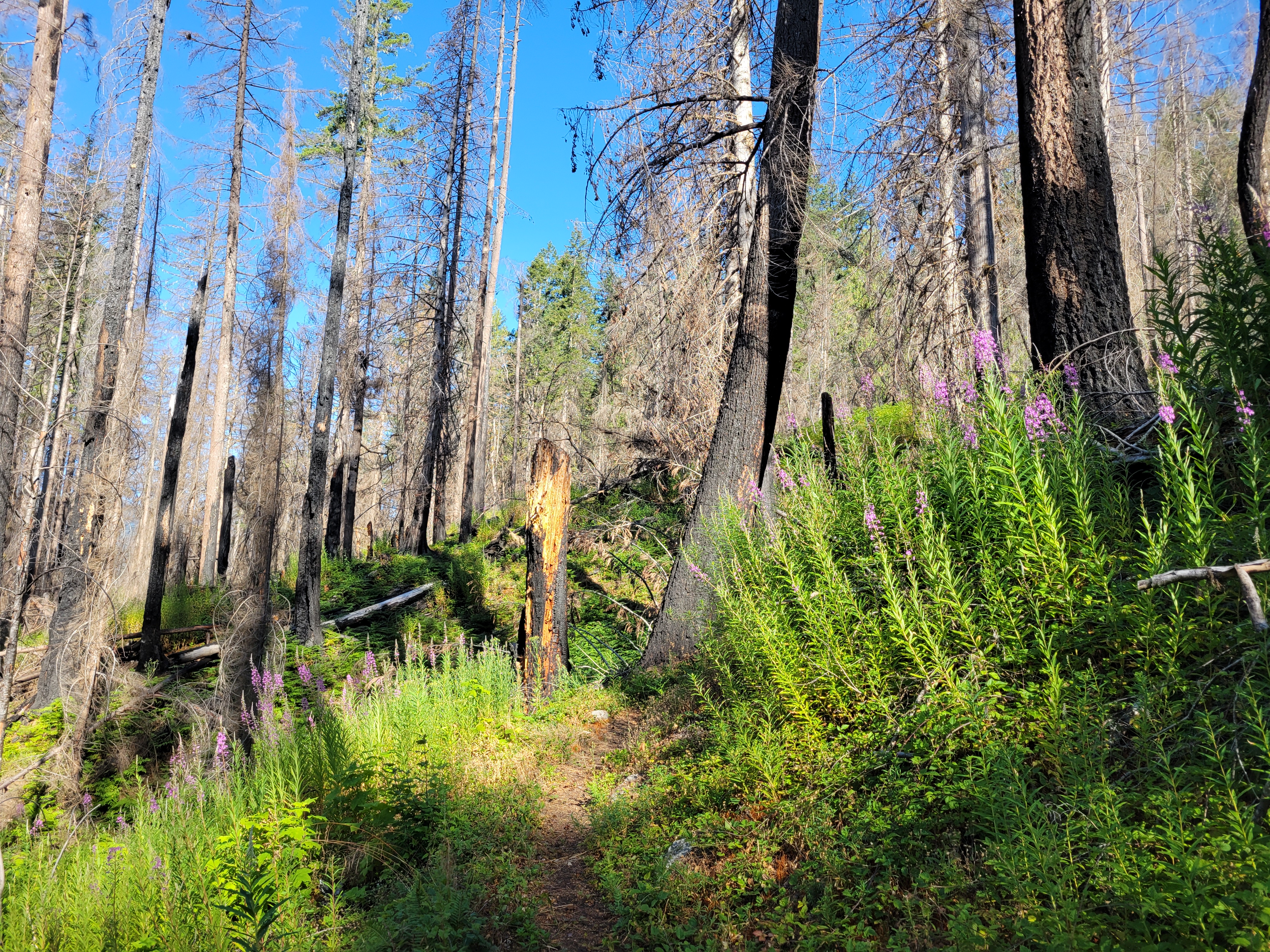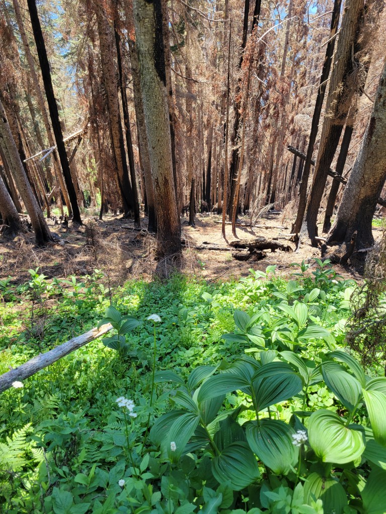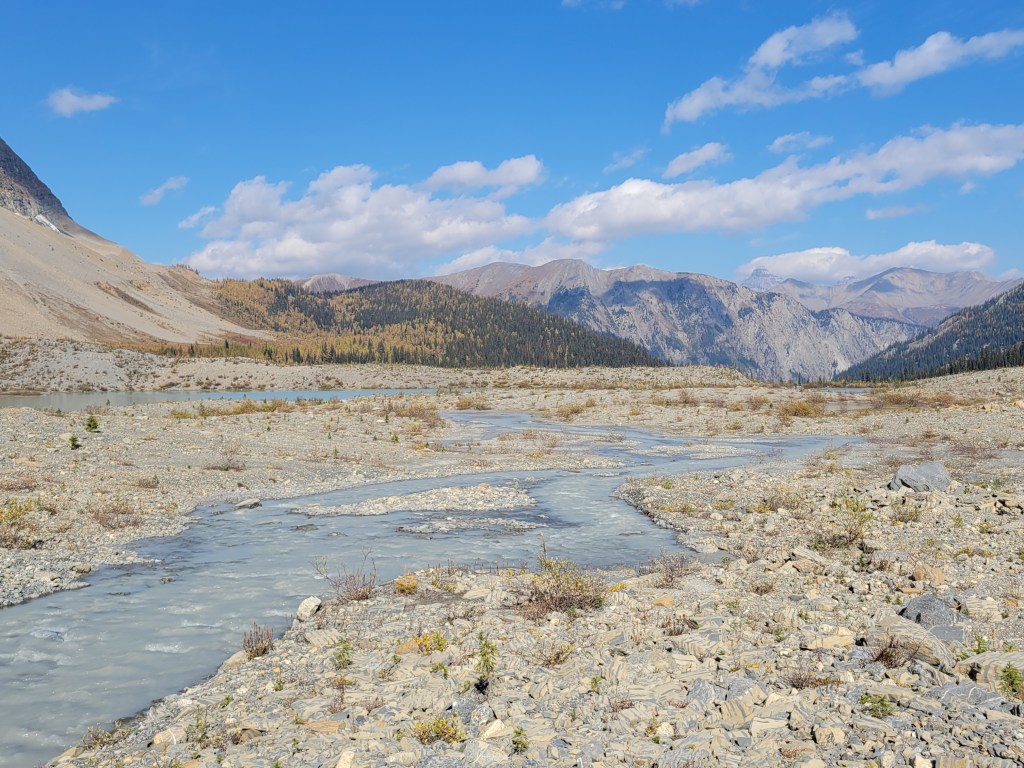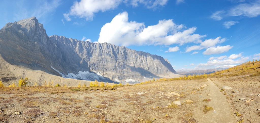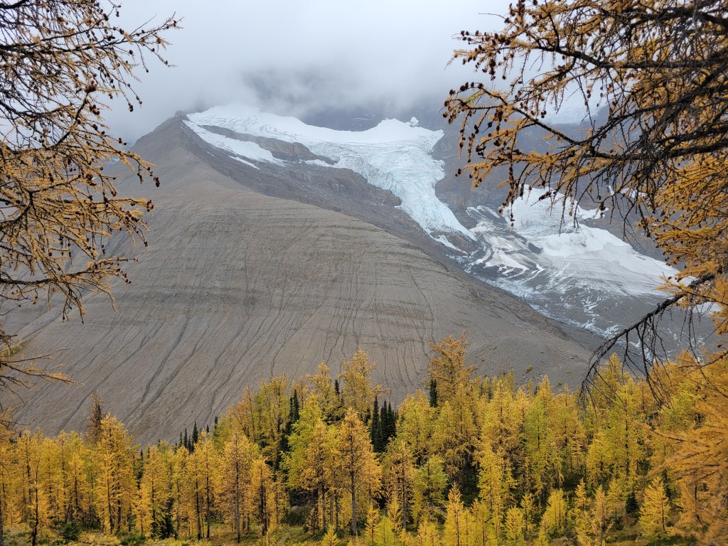 The hike up to Floe Lake was pleasant, a gradual gain for 6 miles through a wide open old burn zone. Most of the elevation gain was close to the lake. I looked up and said “that’s gotta be only like, 300ft” and Brad goes “yeah.. actually it’s like 300m, you’re only off by a factor of 3x.” Ah yes my uncalibrated city eyes complementing my tired city legs. Let’s just skip to the larches.