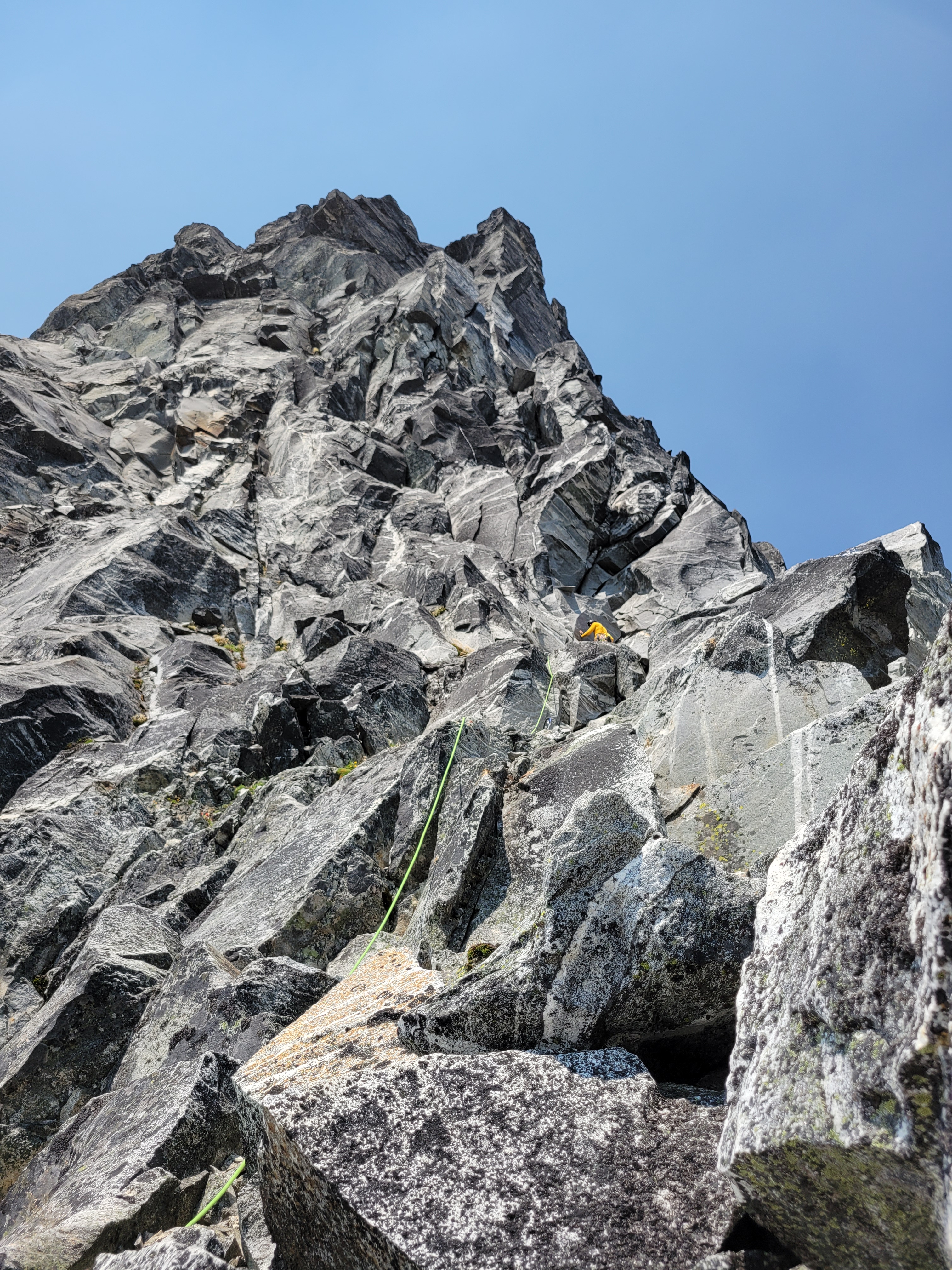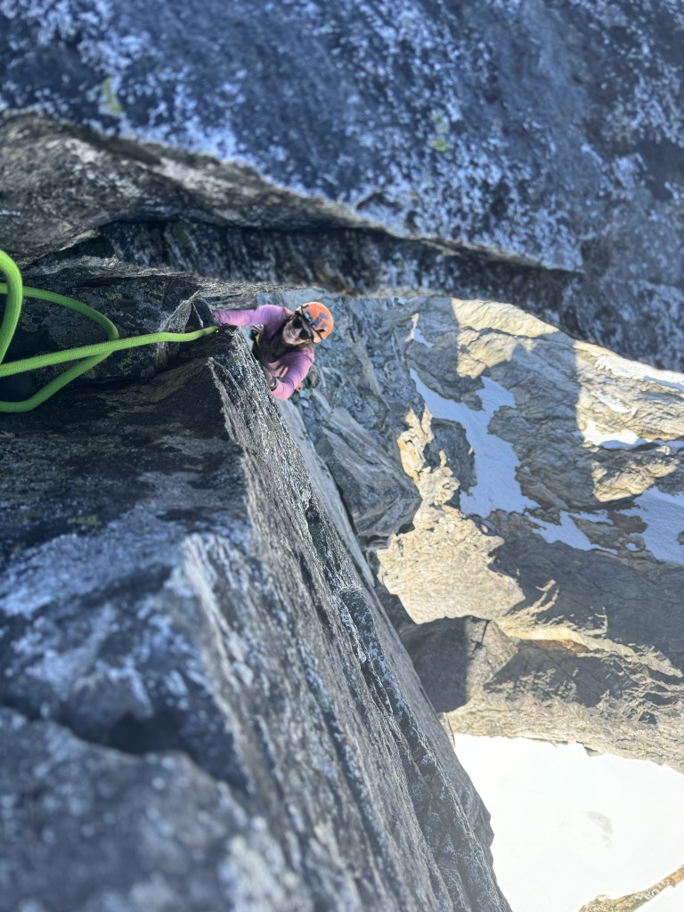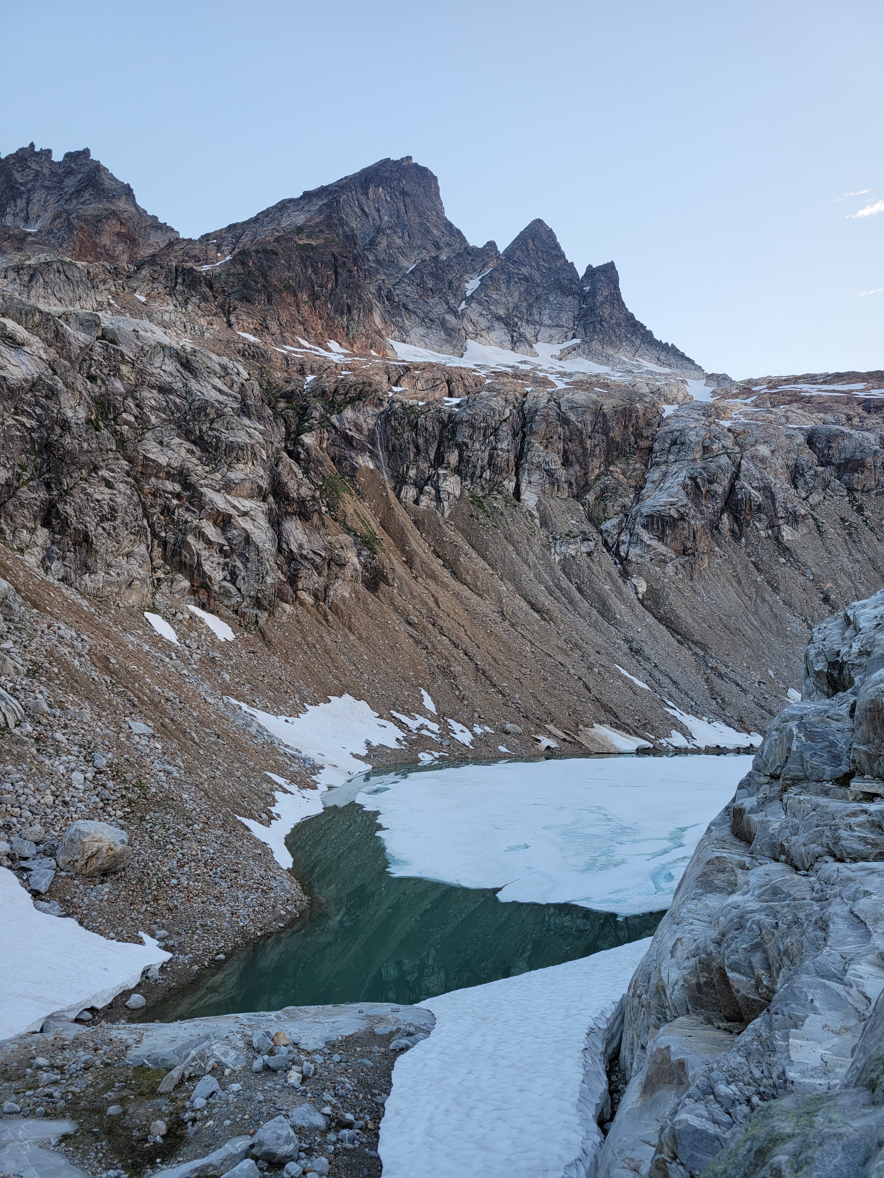 These peaks are absolutely giant. Totally different feel from the Cascades. We saw another moraine with a bright green lake behind it and looked at each other. Uhhh we need to go to this right? We need to go directly to this lake? We trotted off giggling through dense larches. Thank you, larches, for being so soft and not stubborn stiff evergreens that clothesline you when you try to rush through them. After some rambling we were able to get to the toe of the (very dirty) glacier and took a great lunch break in what felt like a foreign land. It’s truly like the rock walls of Moab meets North Cascades rock, with yellow aspen traded for yellow larches and the bonus of glaciers right next to you. Pictures will never do it justice, and I have to winder what this will look like in another 20 years of glacial recession and brush growth. It’s absolutely spectacular, will it be surrounded by trees in 50 years?