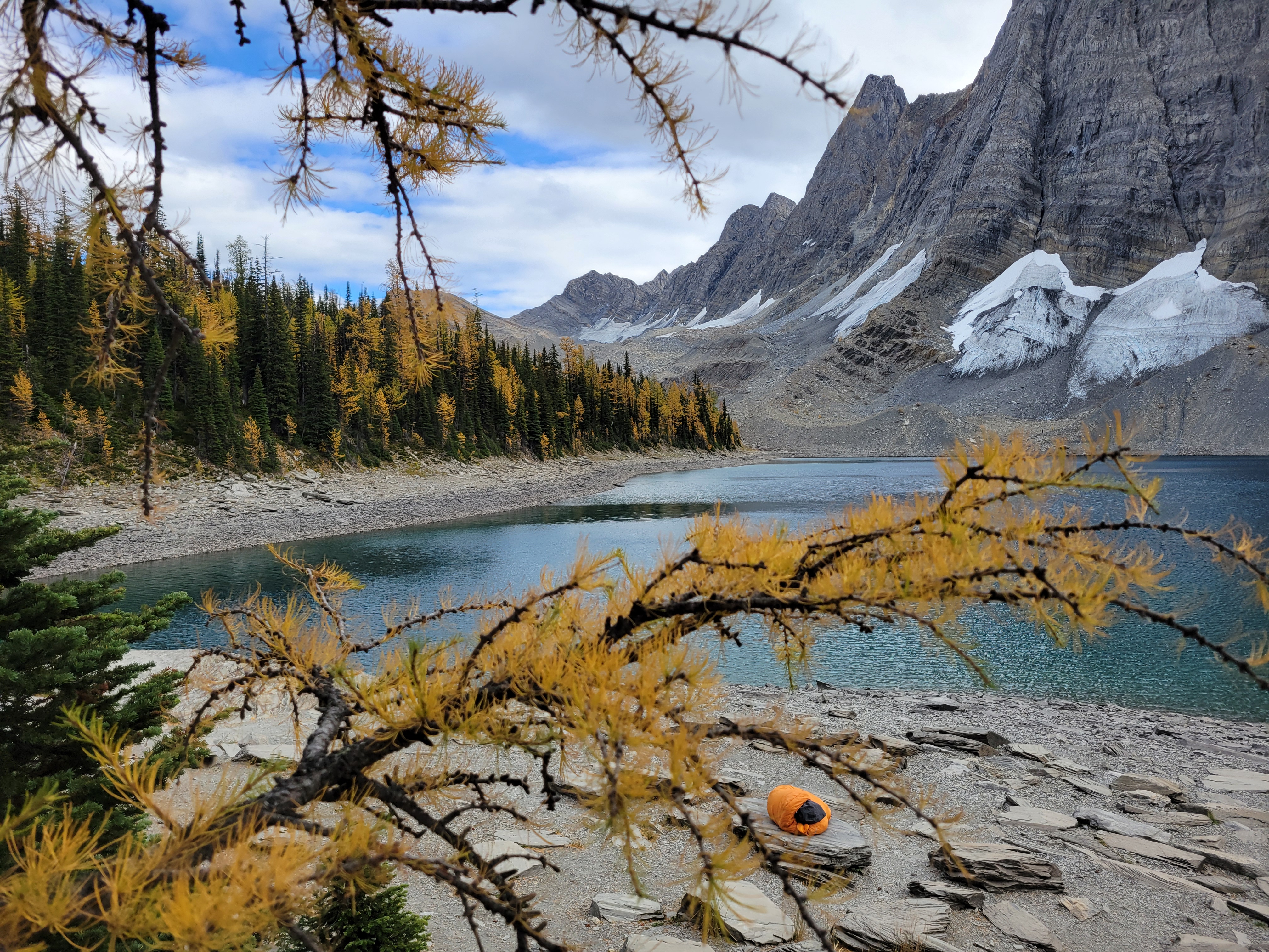 The larches got denser and denser as we climbed and suddenly we were on top of a wide open plateau with baby larches all around us and Floe Lake laid out below us beneath insane towering rock walls. This is where we started to realize maybe we were hiking the trail backwards because the views were always behind us. But anxious about getting to camp, and cold, we didn’t take much time to enjoy the views. Crazily enough, the elevation gain was pretty minimal, I think under 3kft for the whole day despite 12mi. But my city legs were tired.