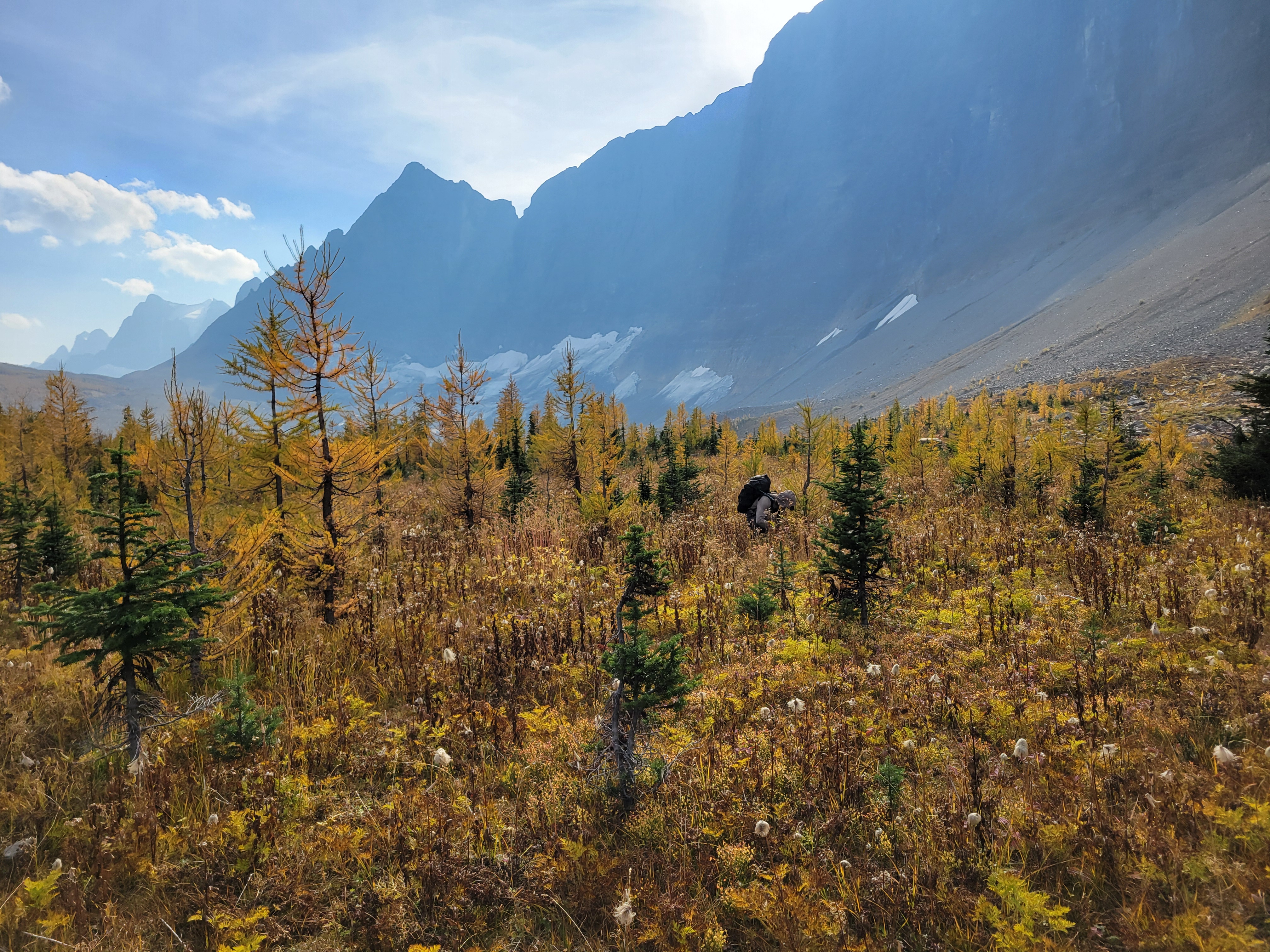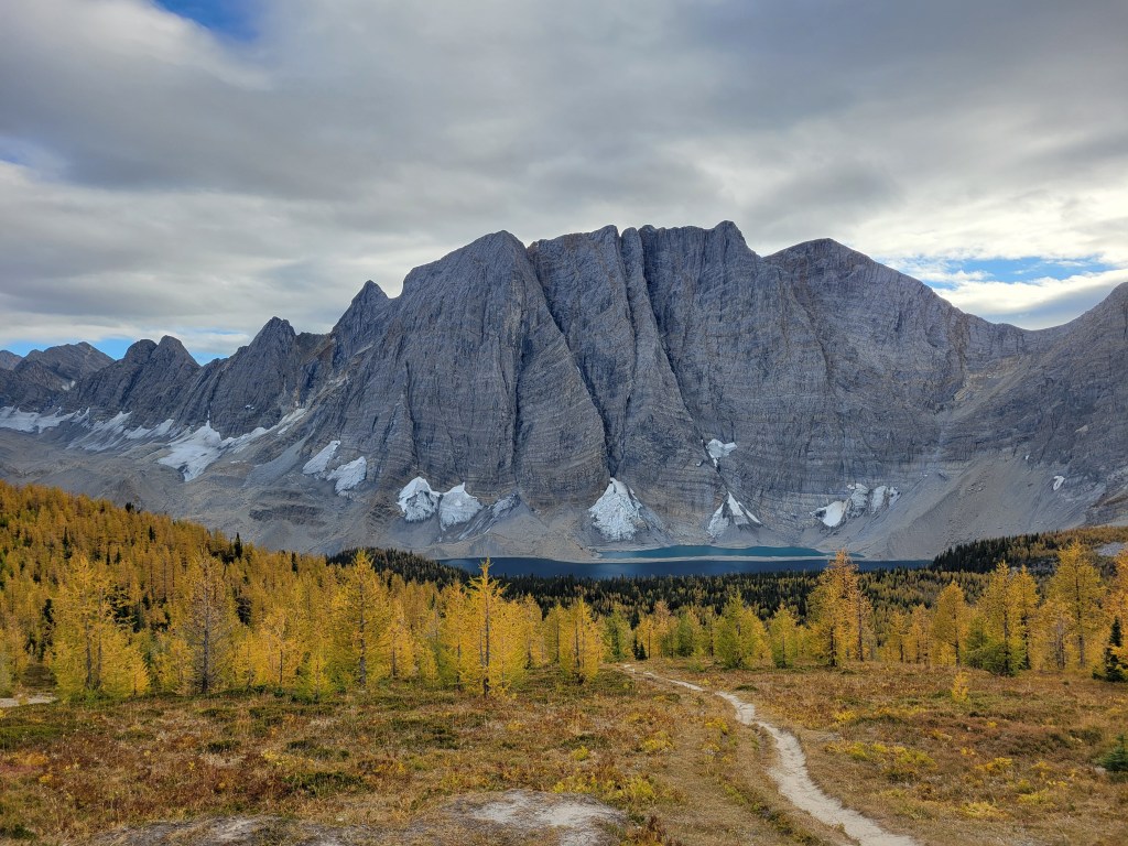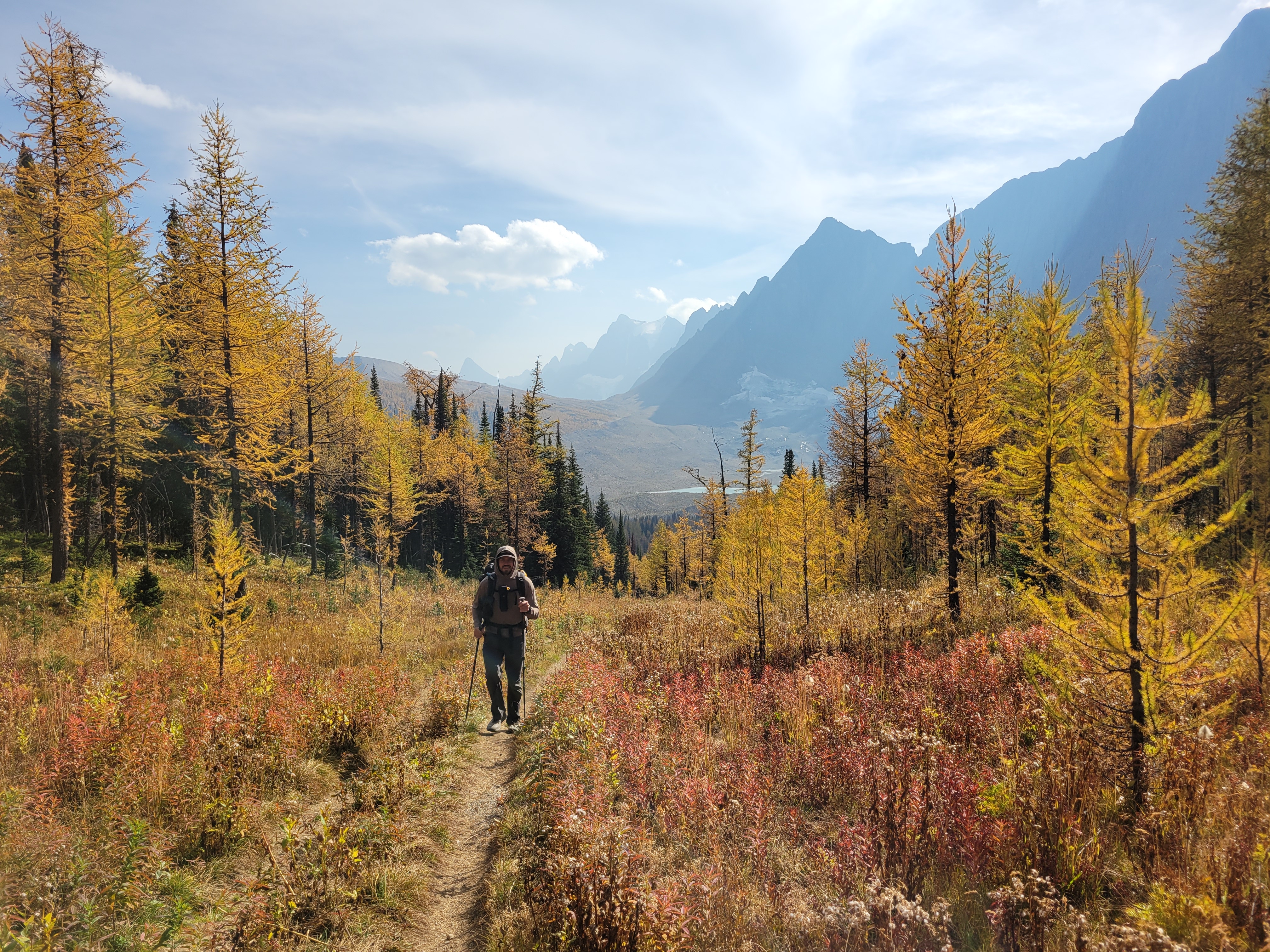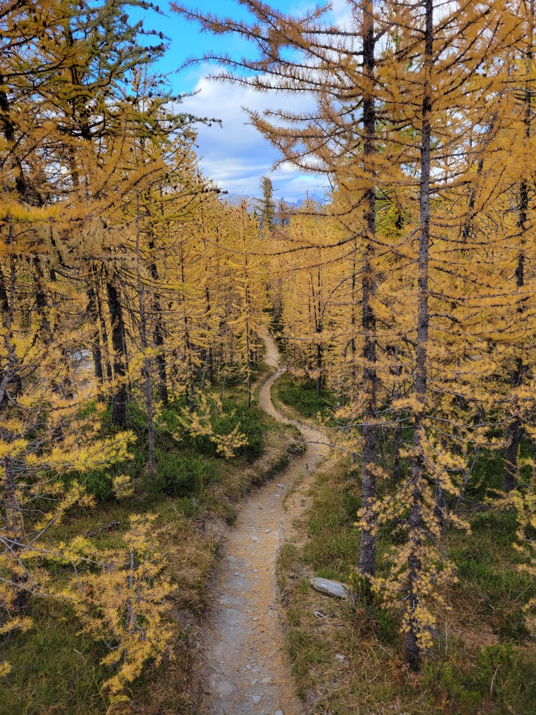 When we were close to the first pass, which was only a couple hundred feet of elevation gain from camp (phew) the sun started making moves. Suddenly the larches were backlit and we were in a cocoon of yellow and IT WAS FINALLY HAPPENING our pace slowed to like 1/10th of a mile per hour and we started basking. This was what we had been hoping for. A trail above 6000ft that just clung to the side of a valley covered in larches, maintained elevation rather than going up 2,000ft and then down 2,000ft, just a beautiful traverse on a warm sunny yellow day. There was another warden’s cabin up there too, which isn’t even fair. I always joked I wanted to retire and be a park ranger but maybe now I want to specifically be a Canadian park ranger if that’s where they’re patrolling.