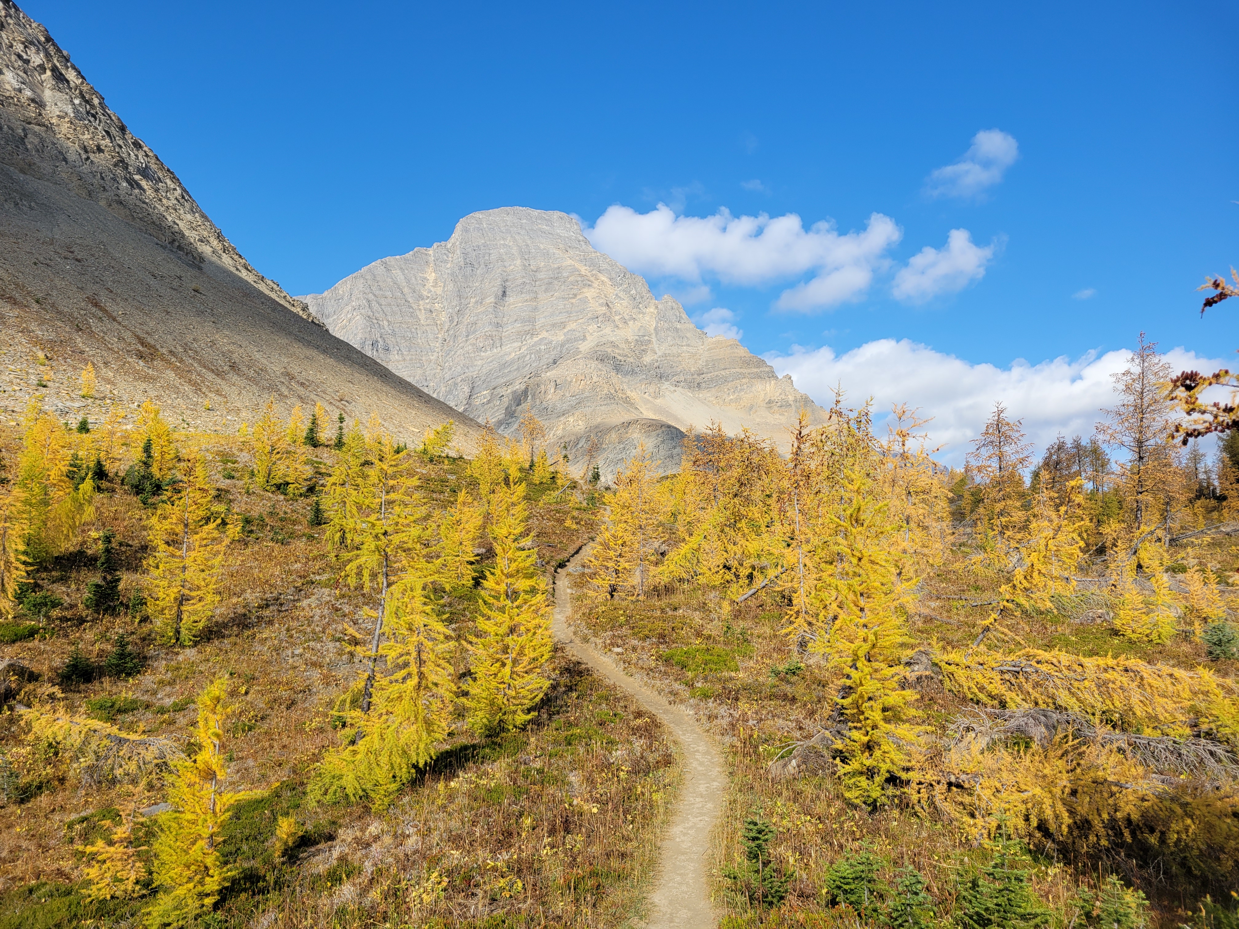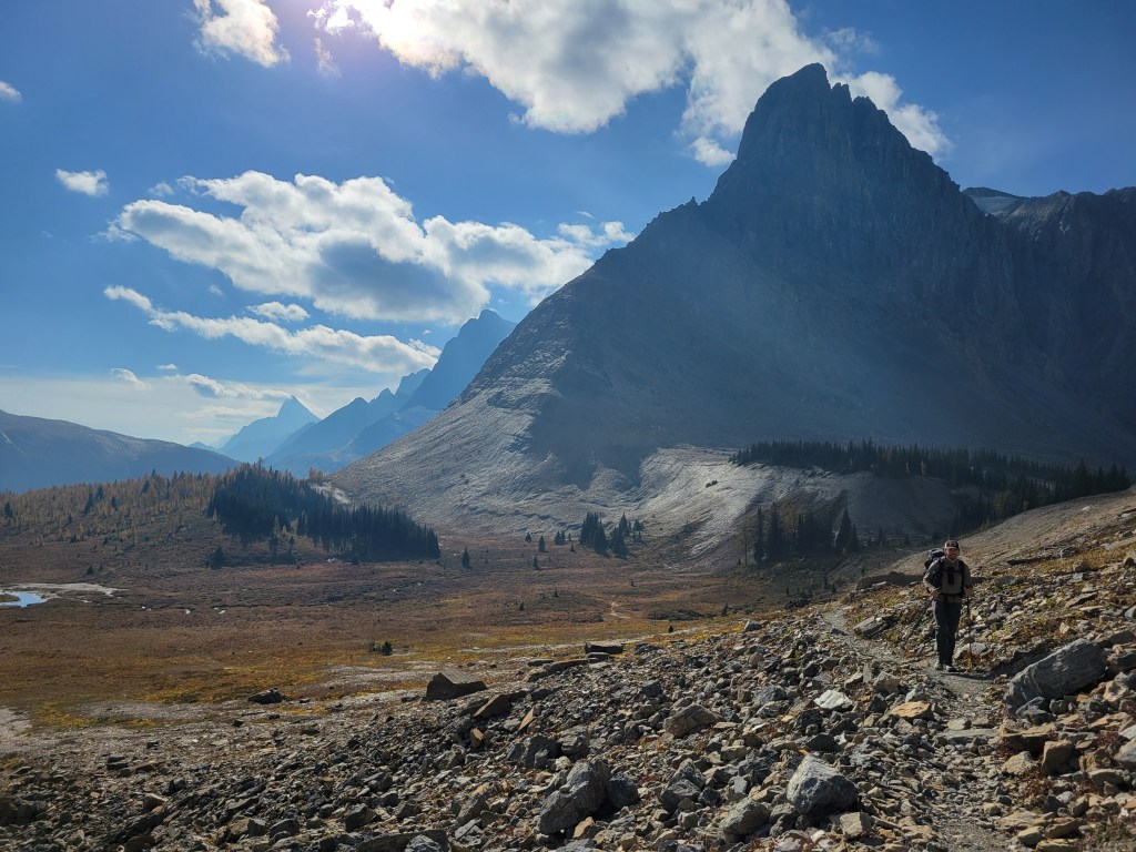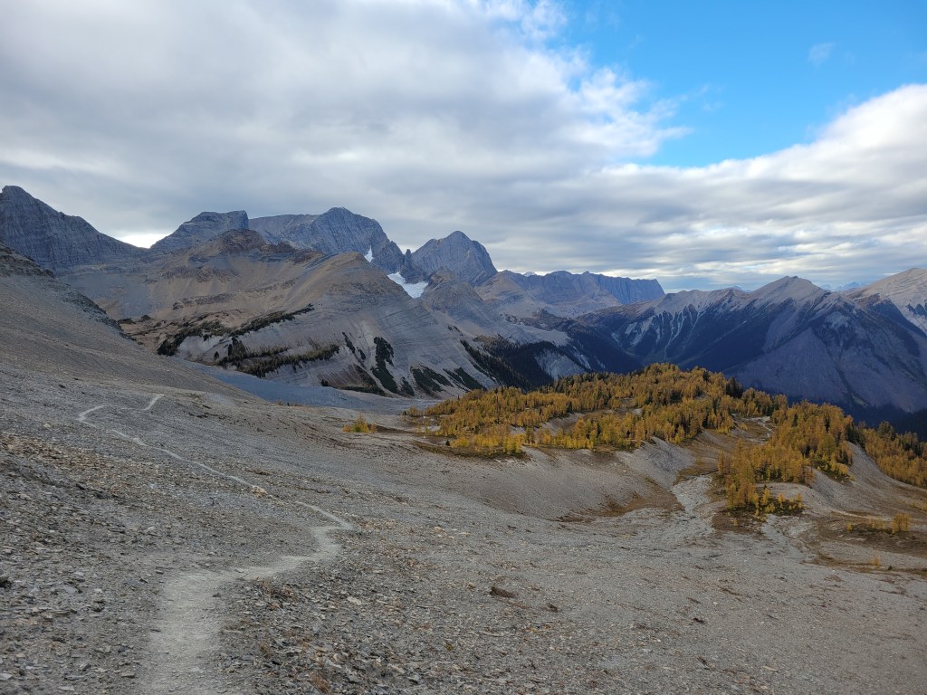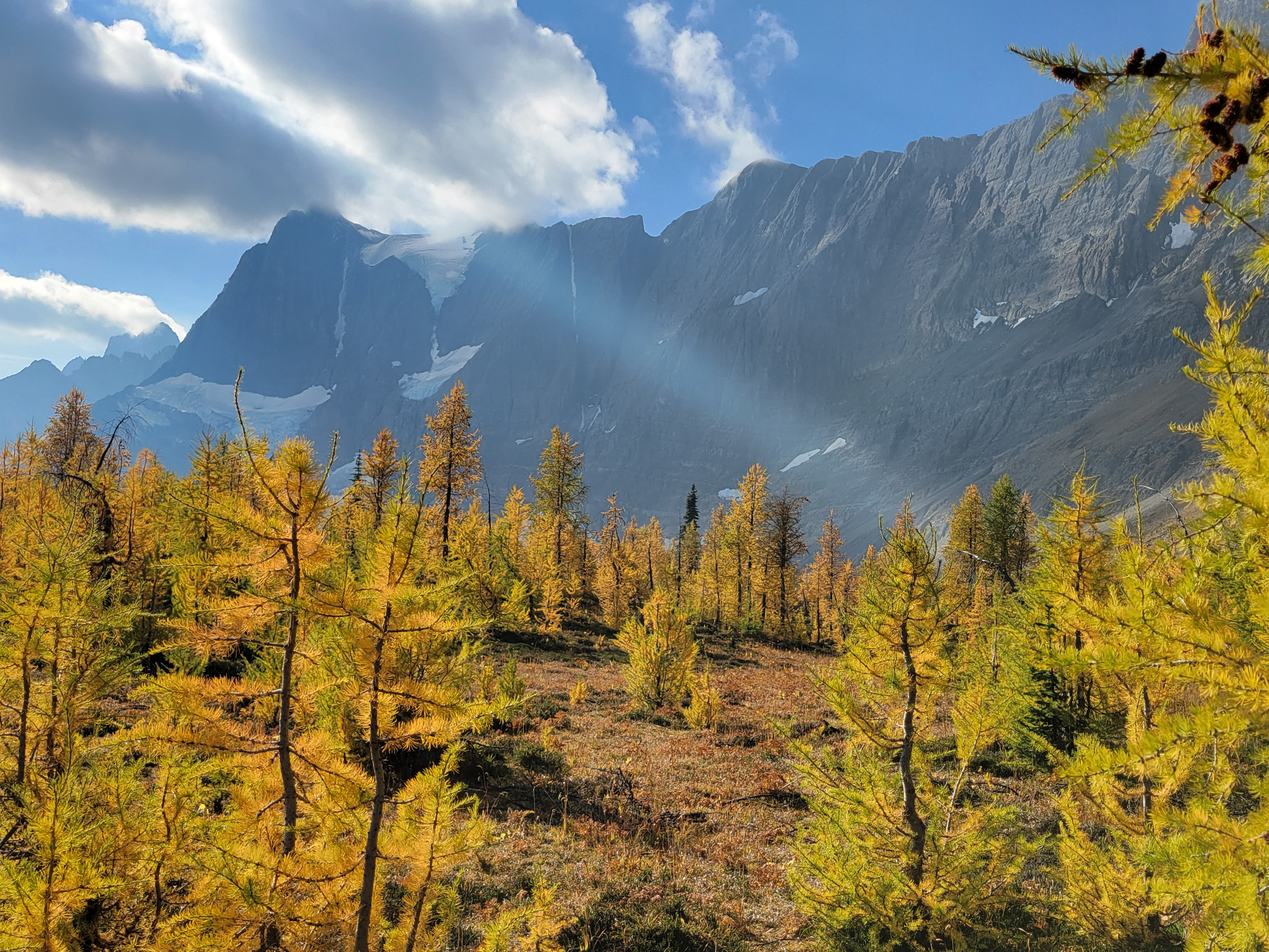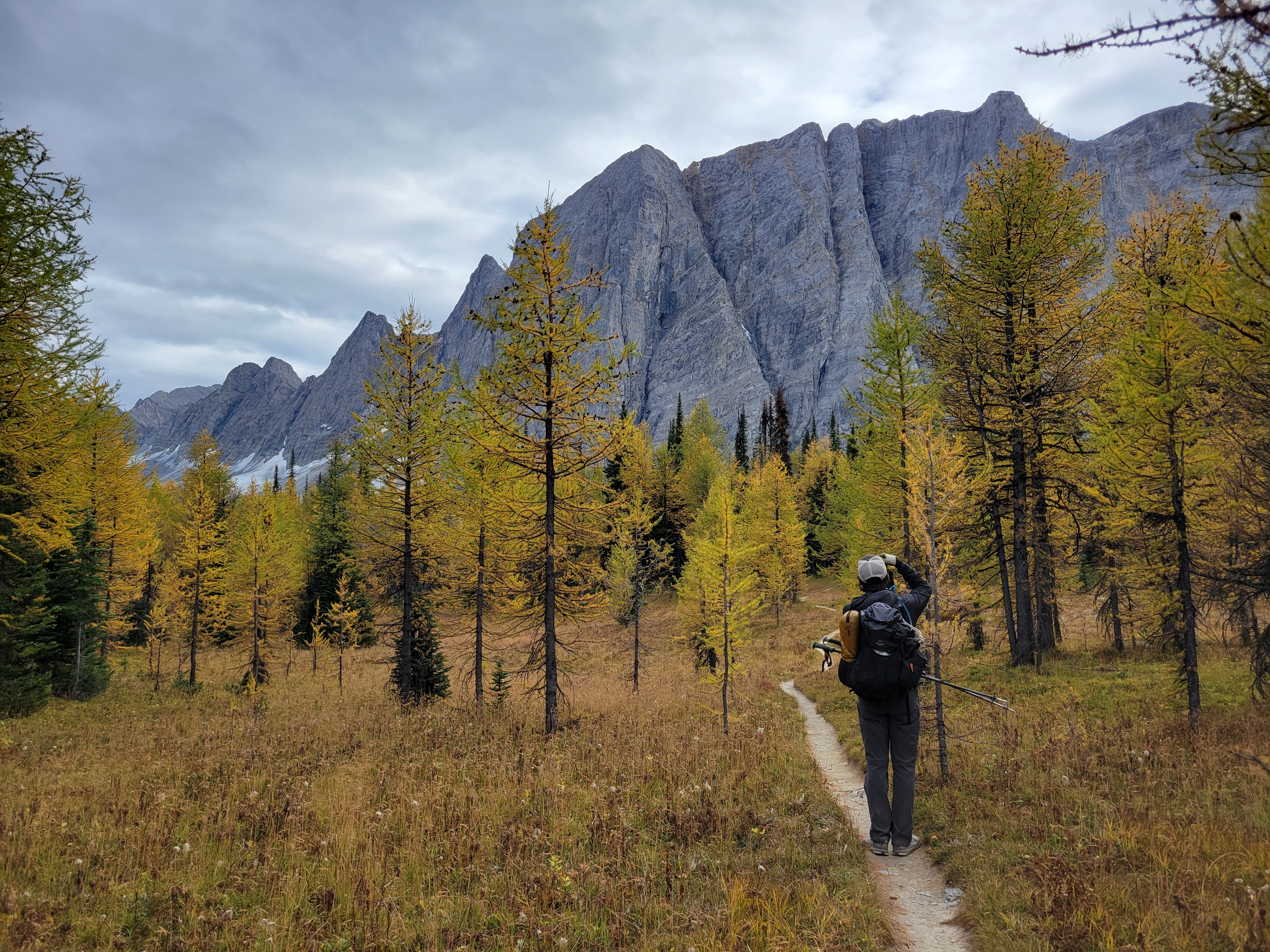 When we were close to the first pass, which was only a couple hundred feet of elevation gain from camp (phew) the sun started making moves. Suddenly the larches were backlit and we were in a cocoon of yellow and IT WAS FINALLY HAPPENING our pace slowed to like 1/10th of a mile per hour and we started basking. This was what we had been hoping for. A trail above 6000ft that just clung to the side of a valley covered in larches, maintained elevation rather than going up 2,000ft and then down 2,000ft, just a beautiful traverse on a warm sunny yellow day. There was another warden’s cabin up there too, which isn’t even fair. I always joked I wanted to retire and be a park ranger but maybe now I want to specifically be a Canadian park ranger if that’s where they’re patrolling.