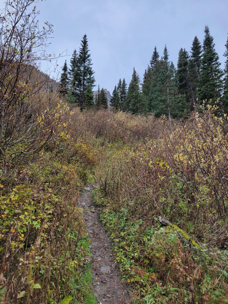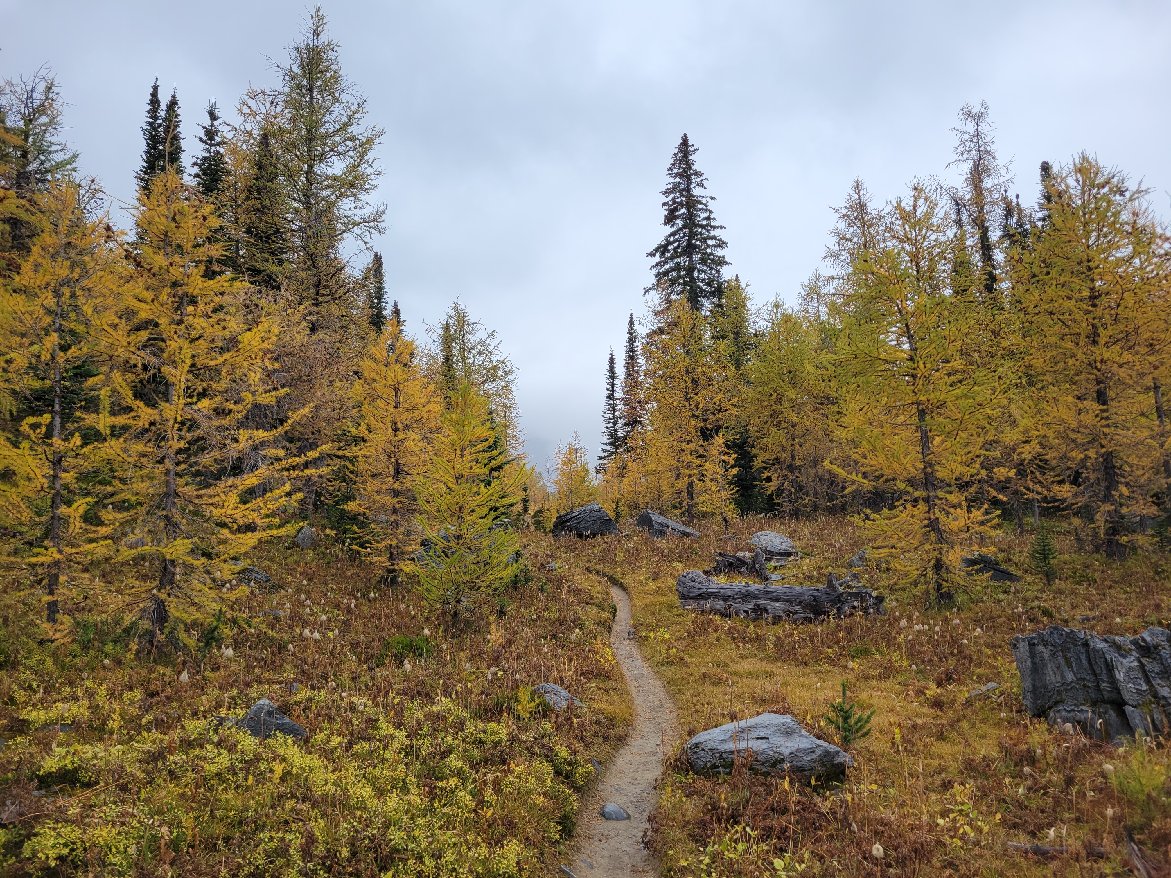 The lake itself was a mix of larches and evergreens, and by the time we got there it was cold, cloudy, and windy. There’s a warden’s cabin there (jealous). Unclear status of fish. We didn’t break for very long since it was cold and it was already 5pm and we wanted to get to the next camp 6mi away before dark. My legs were burning and I wanted to get the rest of the elevation out of the way. On to the larches! Larches, Legs, Lac Floe.