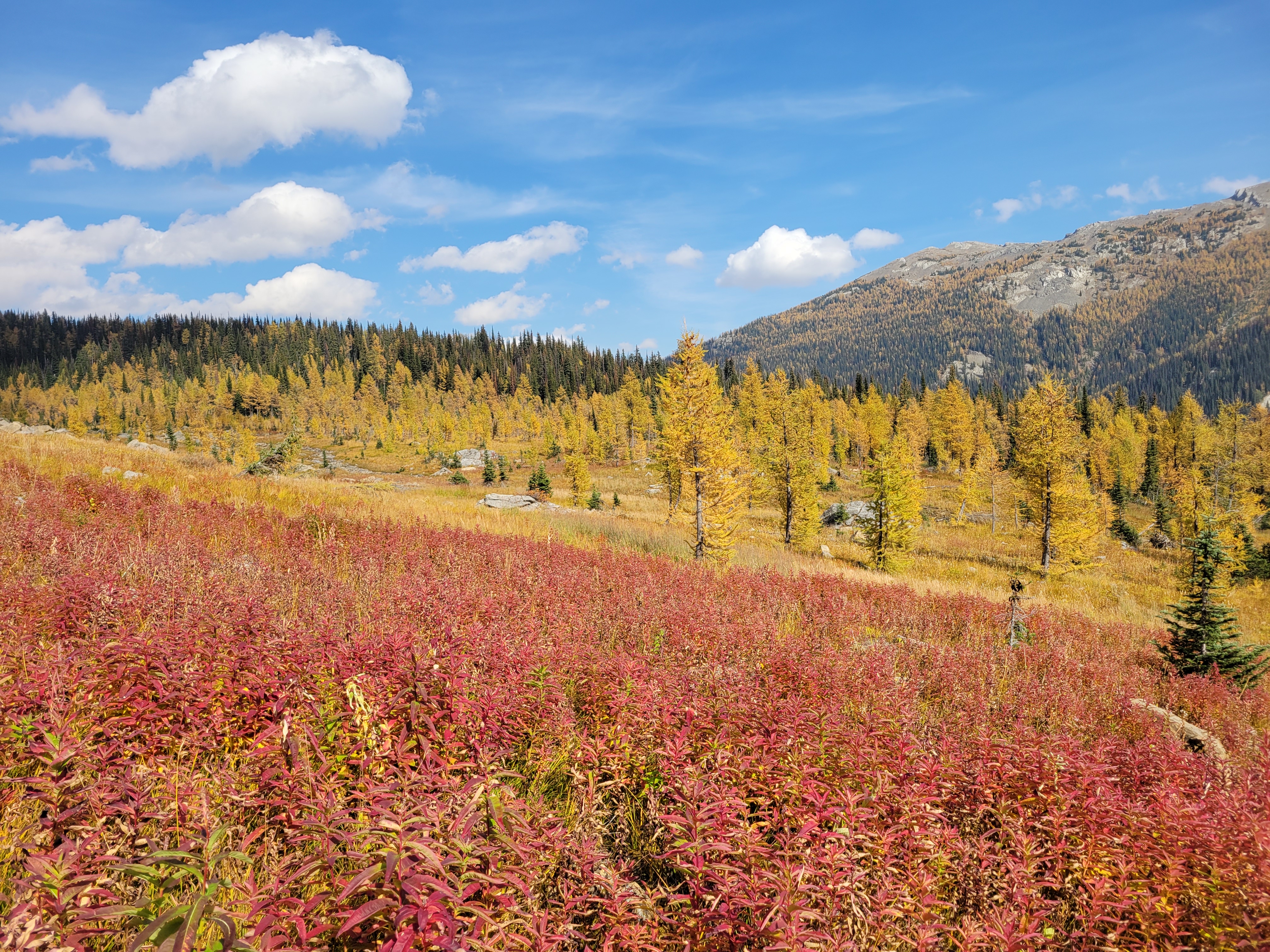 We took our sweet time from the lake up to the final pass. The land transitioned abruptly from glacial moraine to grassy meadow as if the moraine had been pushed onto the meadow just yesterday. The meadow travel was easy, small springs and bright red fireweed and yellow larches and blue skies. Brad has also developed a rare talent: the ability to sniff blueberries from miles away. I’d be walking a trail with seemingly no vegetation and I’d hear “wait. I smell them. blueberries.” and two minutes later “found them!!” and we’d have a small feast. Alpine super sniffer. I couldn’t believe there even were still blueberries.