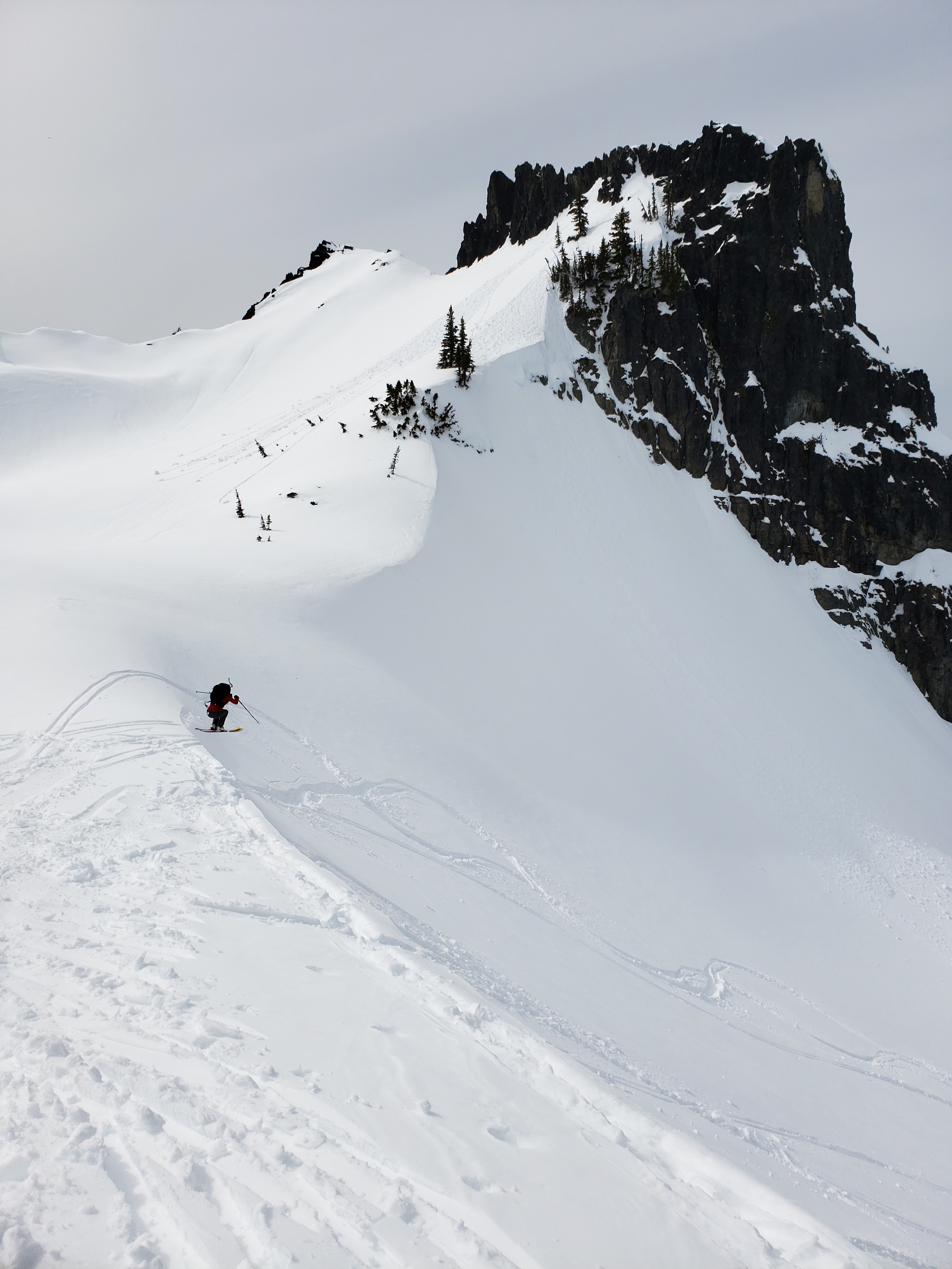 Except by the bottom of the ridge, the crust was getting softer. And 100ft below that, it was feeling a little corny. And Brad shouted back up to me. It only gets better!! I stopped and clicked into my skis. Bring on the corn baby!