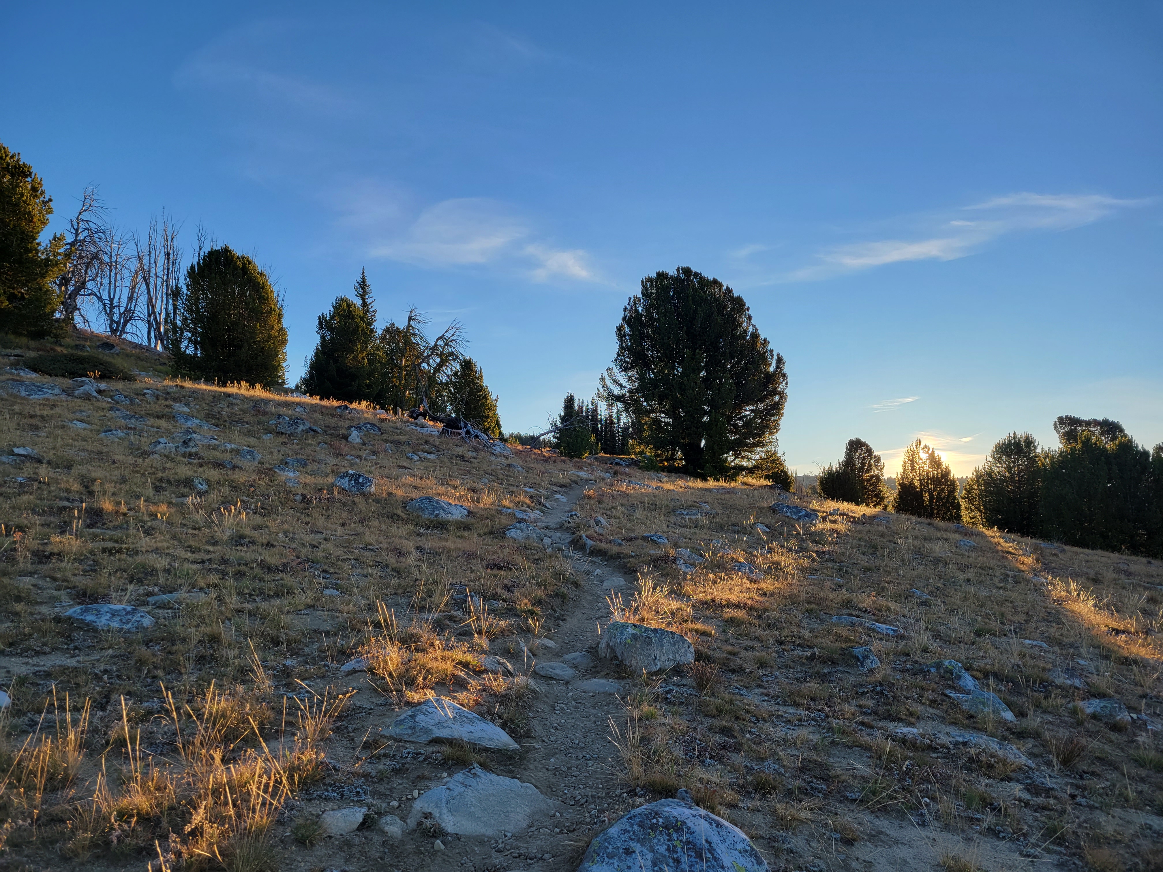 I was up around 6:30 and got my running stuff together. The skies were much less smoky than the prior day, thank god. My legs were tight and sore, but I hadn’t come out here to hang out, so I figured I could at least hike Tiffany. I told Eric as much. “You might beat me back to the car in that case,” he warned. I figured I had a book, food to cook, it was a beautiful day, I’d be fine. Eric had started the book the prior day while waiting for me. “Whoever gets back first gets to read the book!!” I wished Eric luck on his adventure across the road (the peak northeast of Spur Peak, Peak 6970) and started hiking up the Freezeout Ridge trail. Eric is an OG peakbagger and was aiming to climb 1,000 unique peaks, and had already done Tiffany and Clark. He was also dealing with deteriorating health due to a degenerative lung disease called pulmonary hypertension among other things, and was choosing simpler objectives, like this numbered peak that only gained ~500ft elevation off the road.