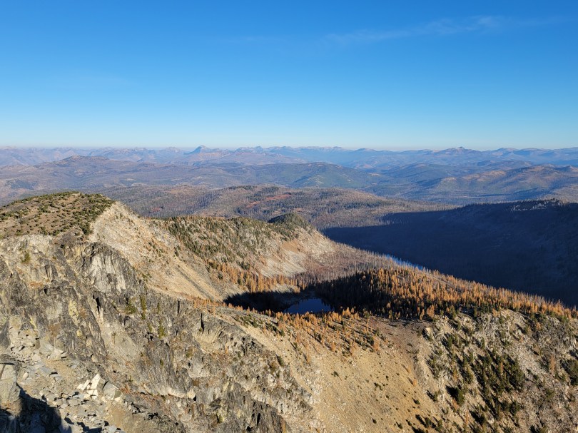 You’re starting at almost 7,000ft already, and pretty much above treeline. The area had burned decades ago, but the trail was clear, and I was crossing grassy fields within no time. The sun lit up the few larches that I could see, past prime but still yellow! The turn off to Tiffany Peak came up in about 1.5 miles and I quickly started up it, my legs complaining the whole time. It was reminiscent of the top of Maude actually, or Amphitheater. Broad grassy slopes, that ancient empty Pasayten feel. Finally I was at the top, looking down a sheer rock face drop down to Tiffany Lakes and munching on my pb&j.
