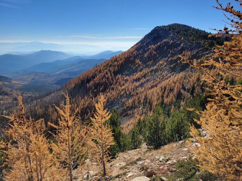 The lakes were surrounded by larches! I tagged both ends of the summit to snap photos. What a pleasant surprise! The larch groves had been burned in the fire decades ago, larch carnage everywhere. But those that remained were perfectly lit up in the sun. Across Whistler Pass from me was a beautifully dense slope of larches, so rather than backtrack, I jogged down the southeast side of the peak, stumbling across a trail that faintly, very faintly switchbacked from the pass up to Tiffany’s summit like some untouched high country adventure. What a treat. For a top peak by prominence this seems to get surprisingly few boots.