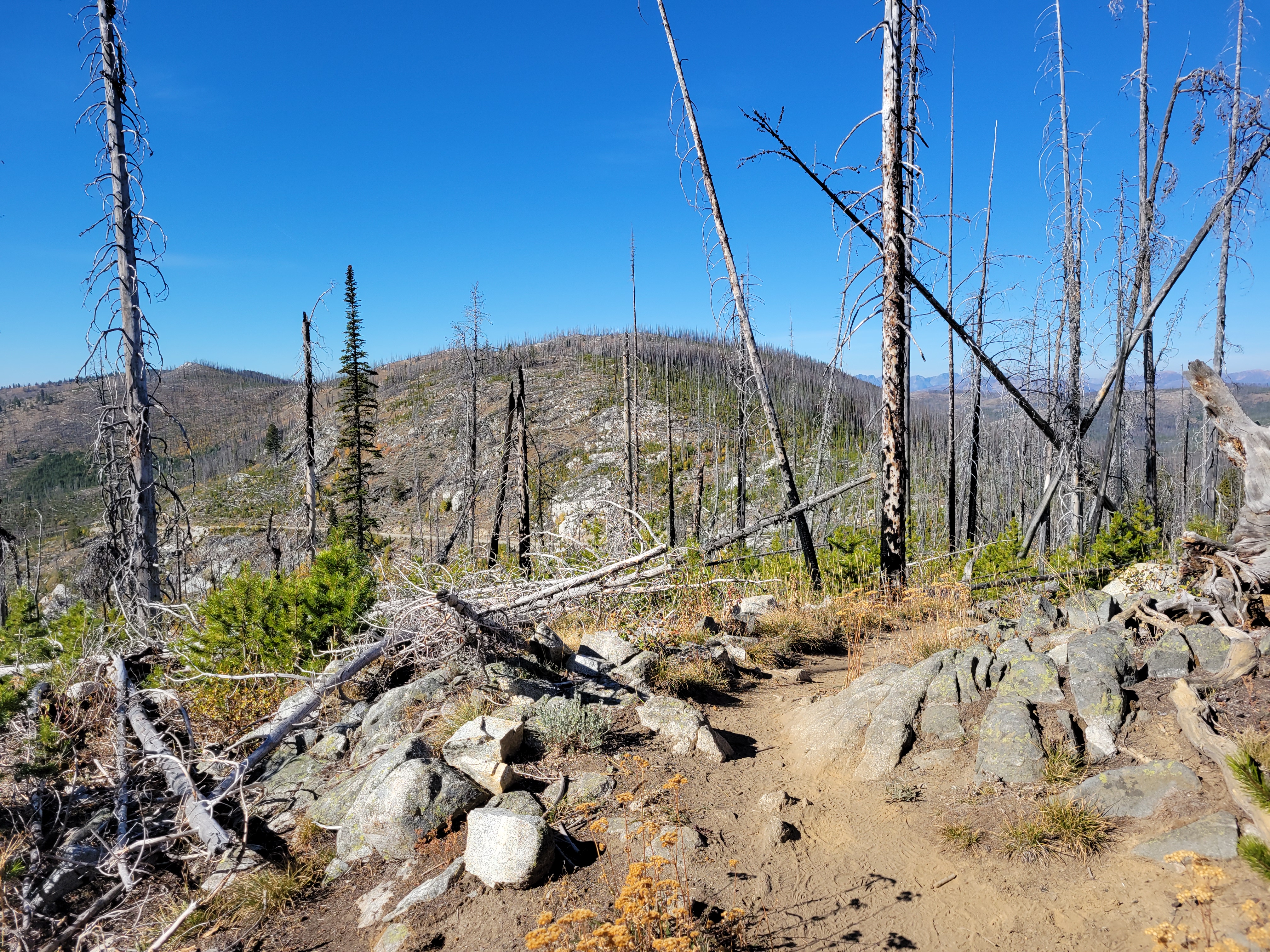 The trail is like 1000 short uphill switchbacks forever. My grouchiness dissipated as I had to focus on trucking uphill. However, the scenery changes every mile or so, keeping you interested. Open forest (I took no pics of that), then burn zone but with tall bushes, then BOOM DISNEY PRINCESS WILDFLOWERS I was bewildered! I had NO idea this was even a wildflower objective. I giggled at one switchback realizing it meant I’d get to go right back through an enormous field of flowers. I was in disbelief. A friend pointed out years ago that part of an awesome hike/climb/anything is being surprised by the scenery, and how that makes a 7/10 trail a 11/10 because you didn’t see it coming. This definitely fell into that.