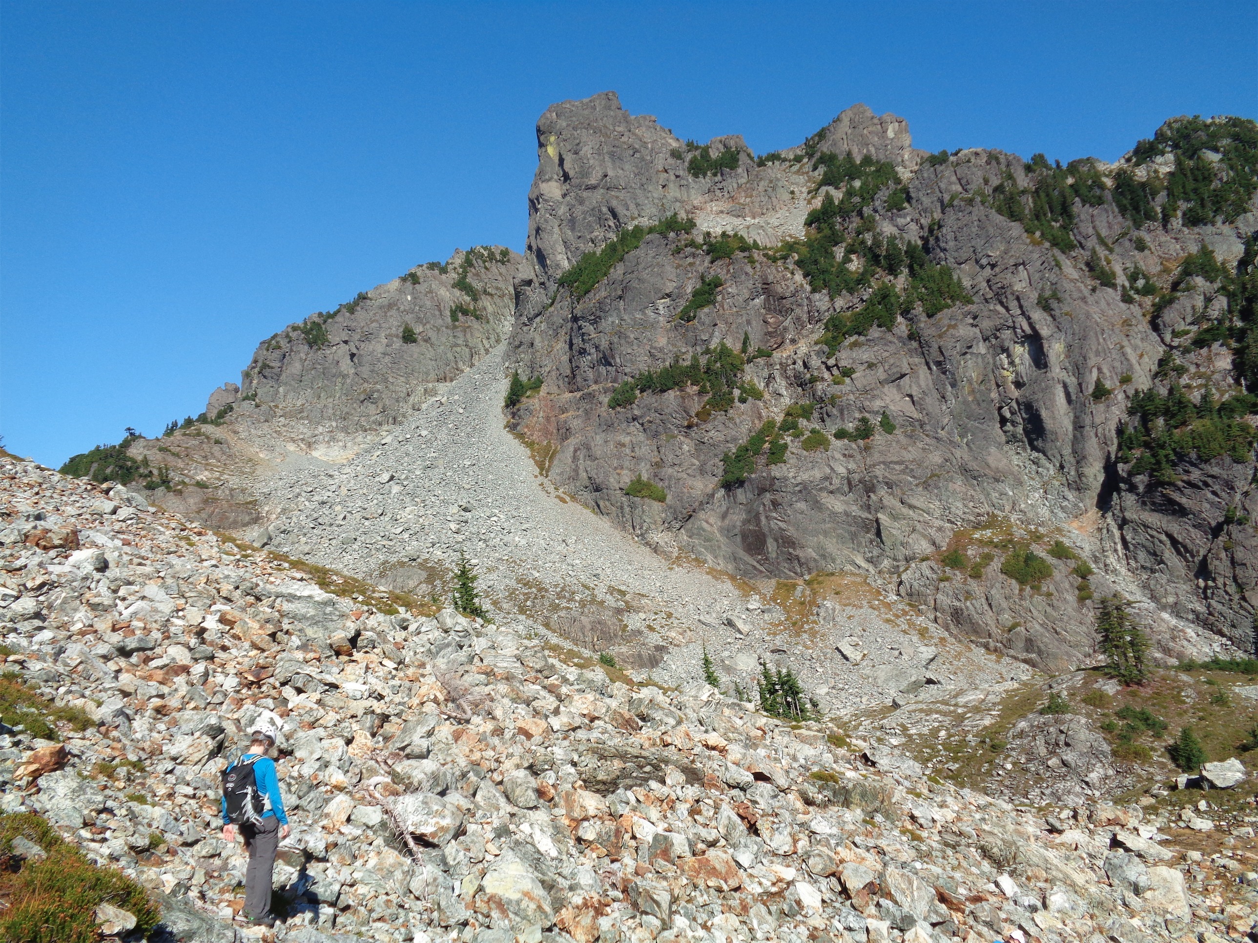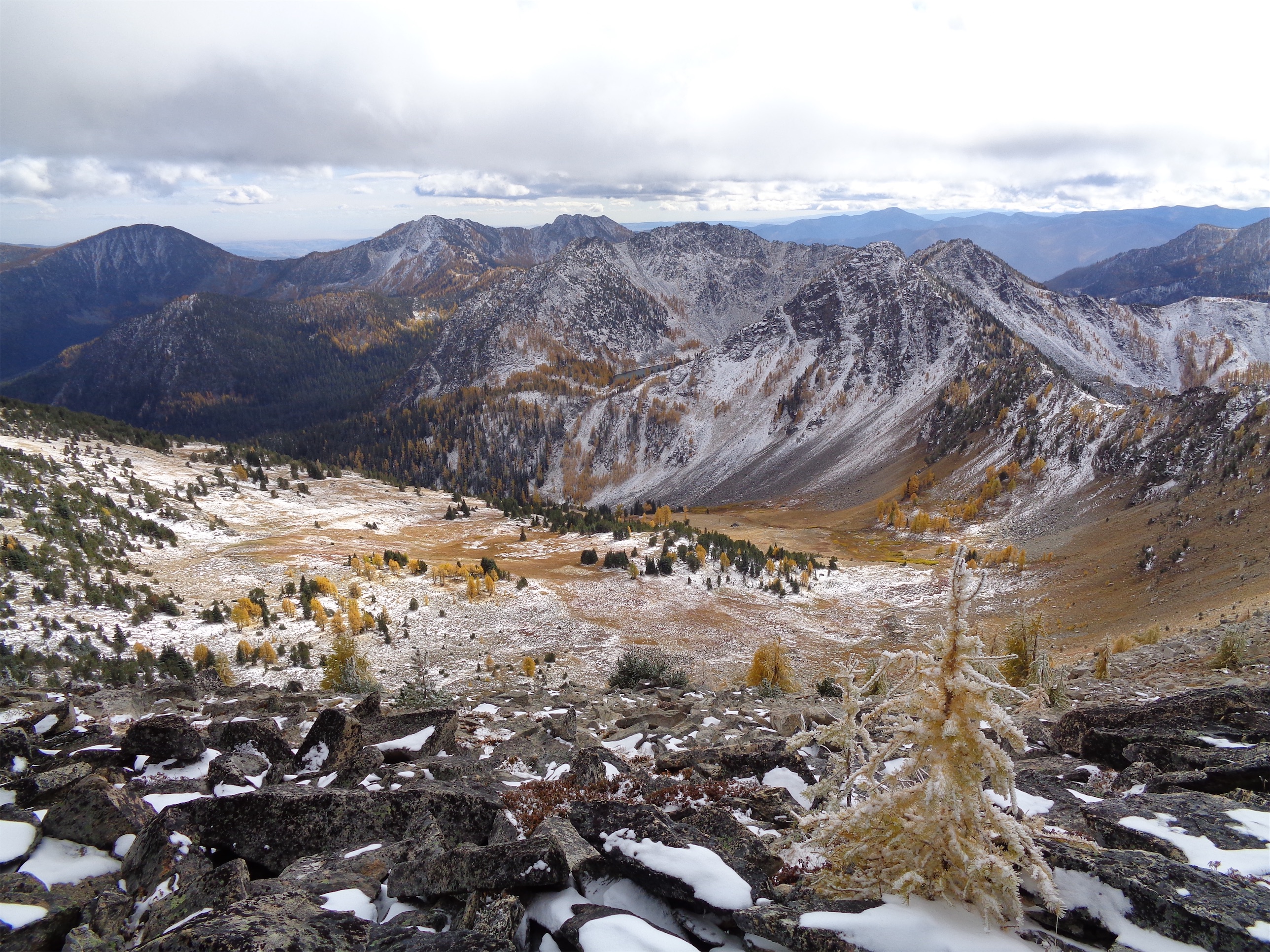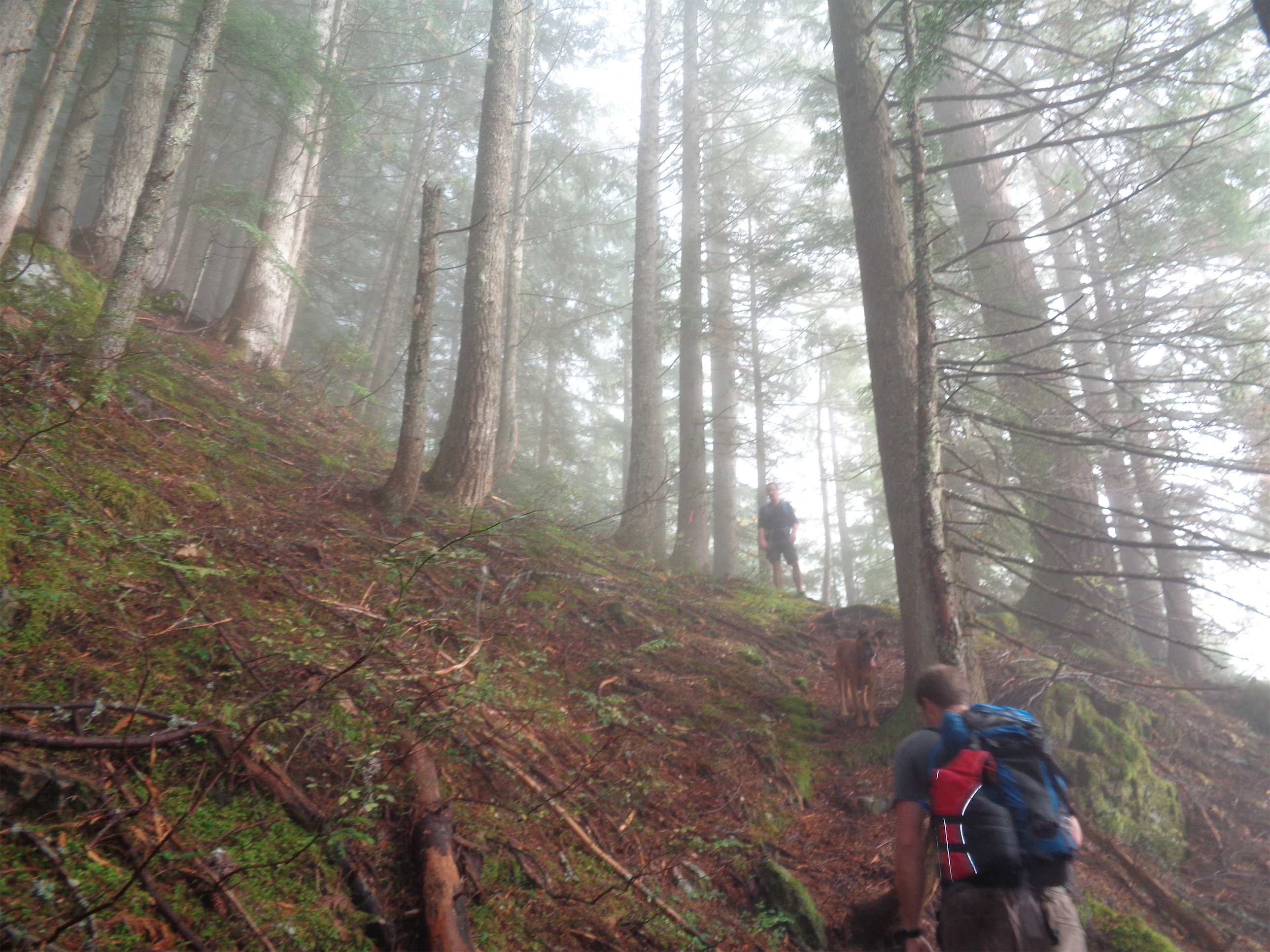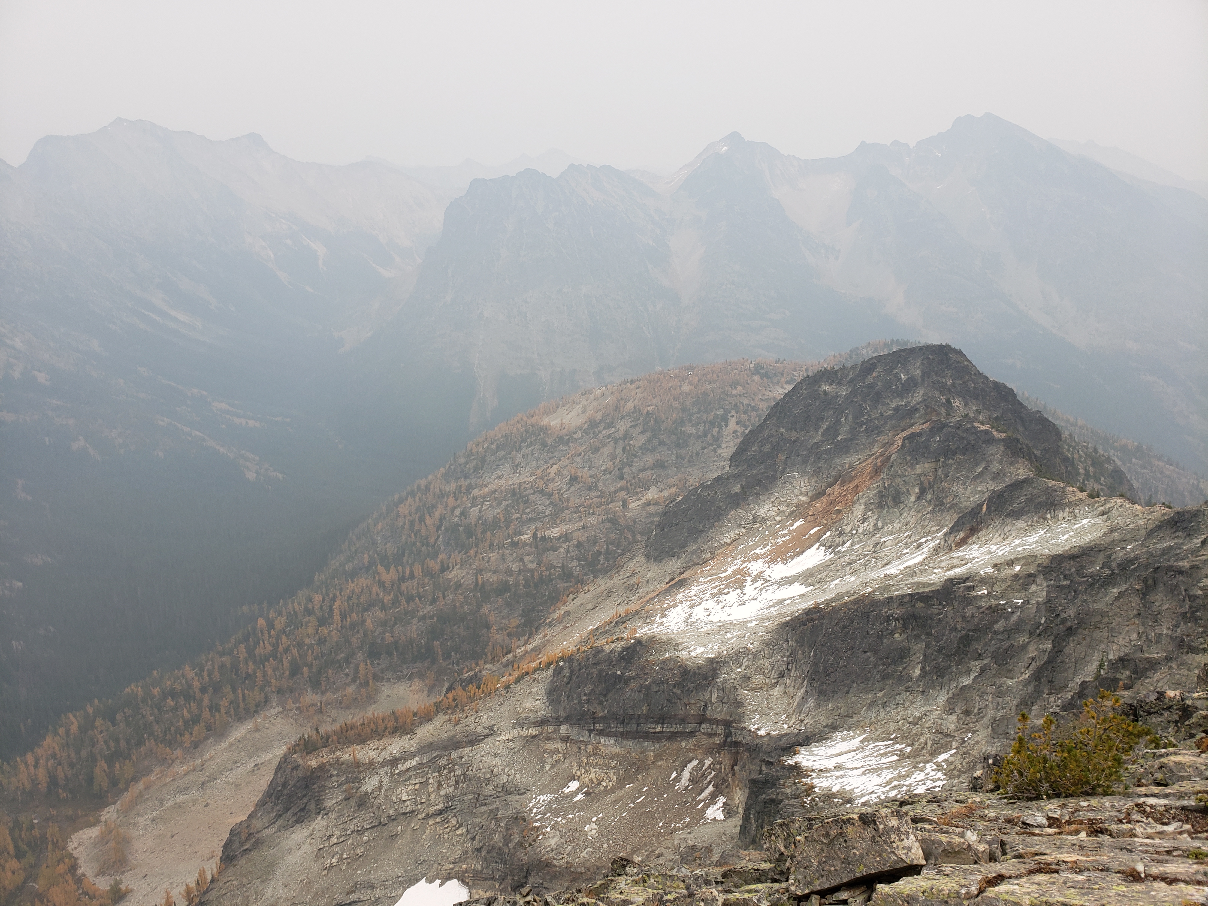 It had backed off to a drizzle. I strapped my soaking wet tent to the outside of my pack to spare everything on the inside and we took off. The first mile or two was stupid, generic slopes in the mist. And then we crested the next pass and hit larches and holy crap the glimpses we got were such teases. Toes of glaciers hanging down rock walls between larches! A huge moraine, with a lake I’d have demanded we hike to if it hadn’t been raining. The rolling slope to the east that we could have hiked up easily for better views, if we hadn’t been socked in by clouds. Oh man. But at least we only had to go four miles. Four miles of +2000ft and then -2000ft. Because of these below-treeline-only-campsites.