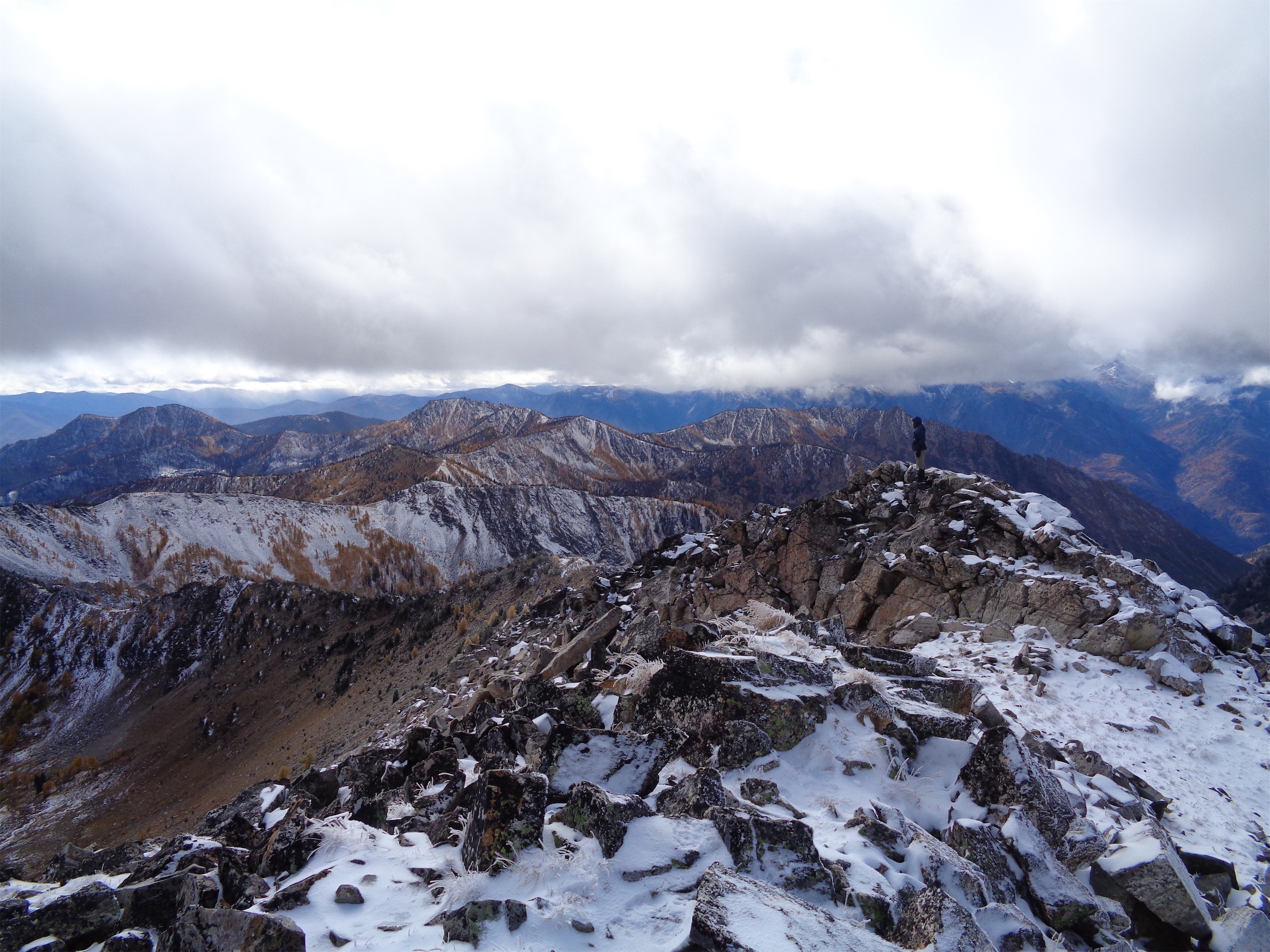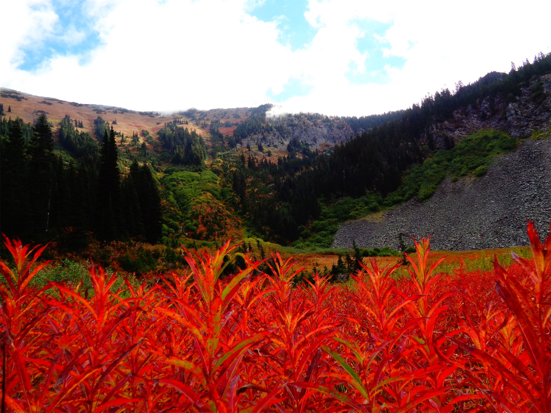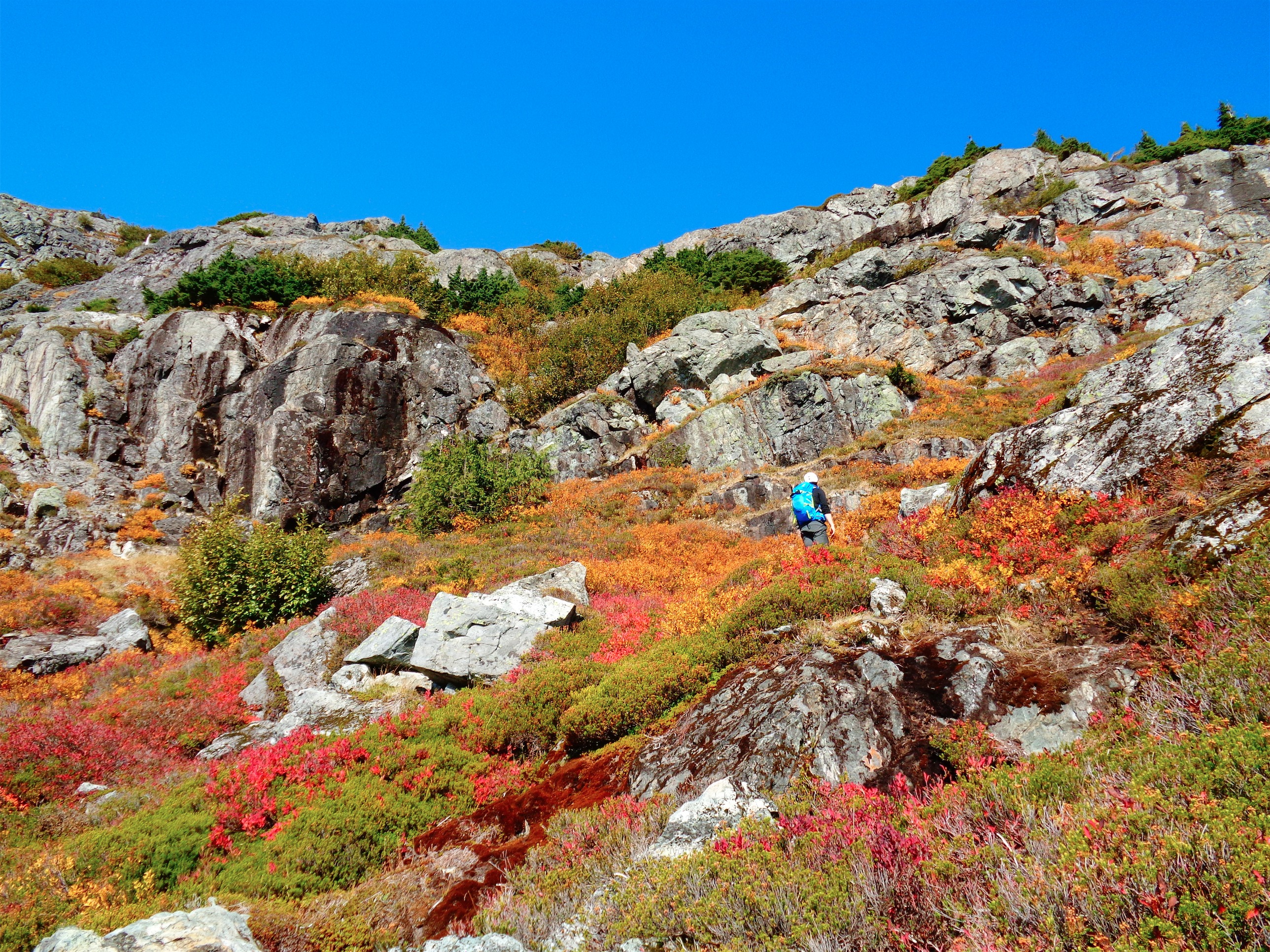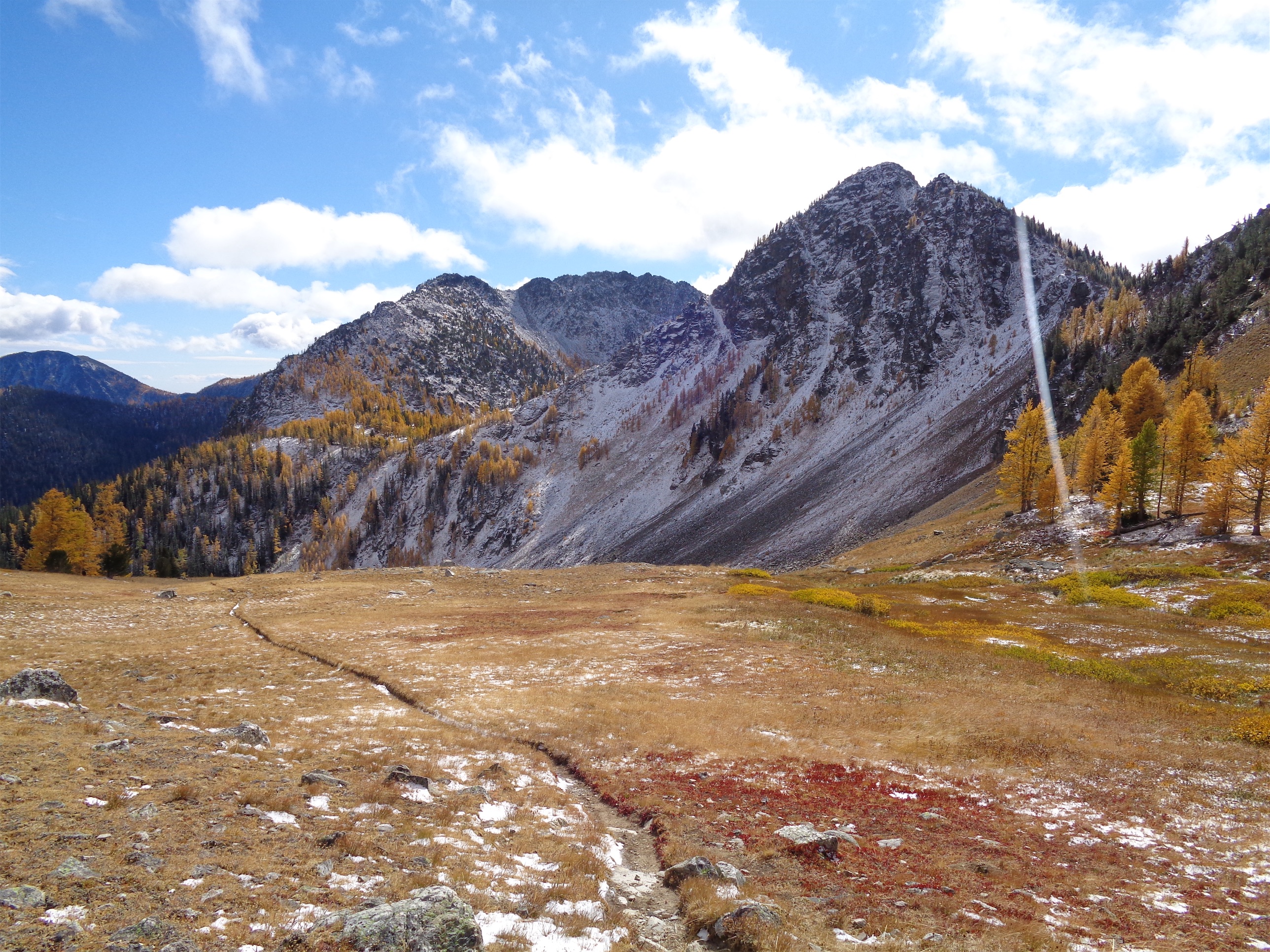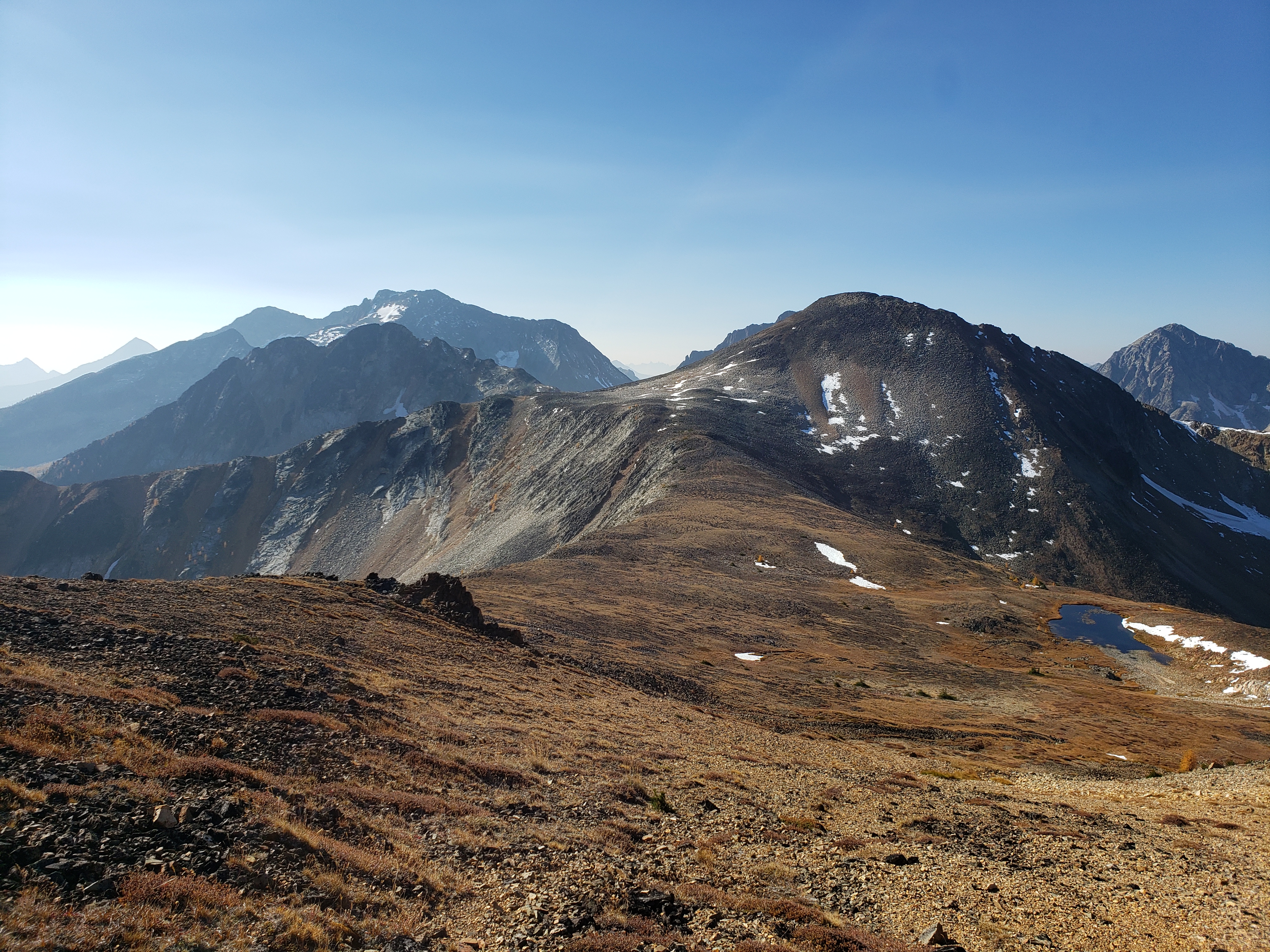 We took our sweet time from the lake up to the final pass. The land transitioned abruptly from glacial moraine to grassy meadow as if the moraine had been pushed onto the meadow just yesterday. The meadow travel was easy, small springs and bright red fireweed and yellow larches and blue skies. Brad has also developed a rare talent: the ability to sniff blueberries from miles away. I’d be walking a trail with seemingly no vegetation and I’d hear “wait. I smell them. blueberries.” and two minutes later “found them!!” and we’d have a small feast. Alpine super sniffer. I couldn’t believe there even were still blueberries.