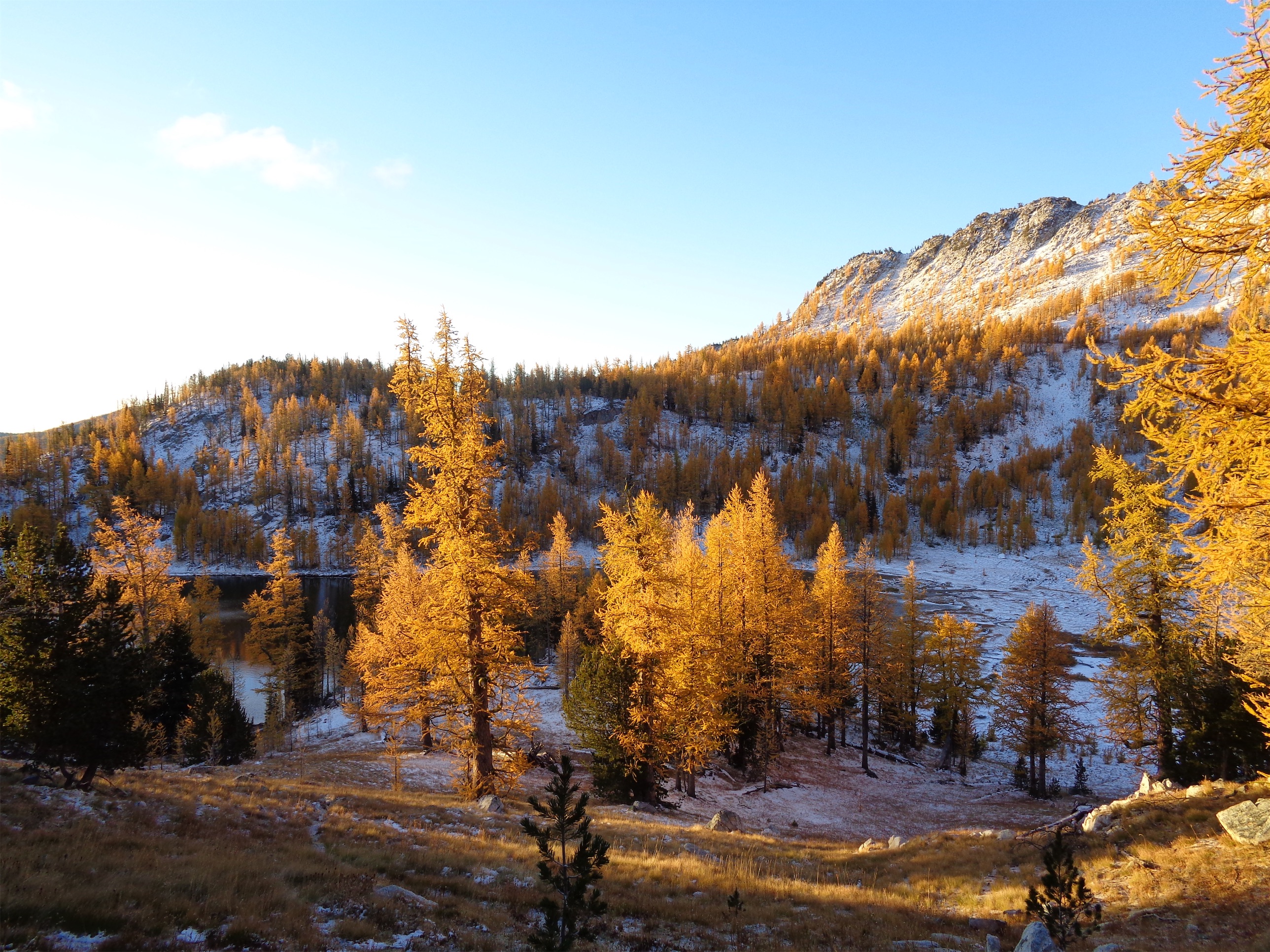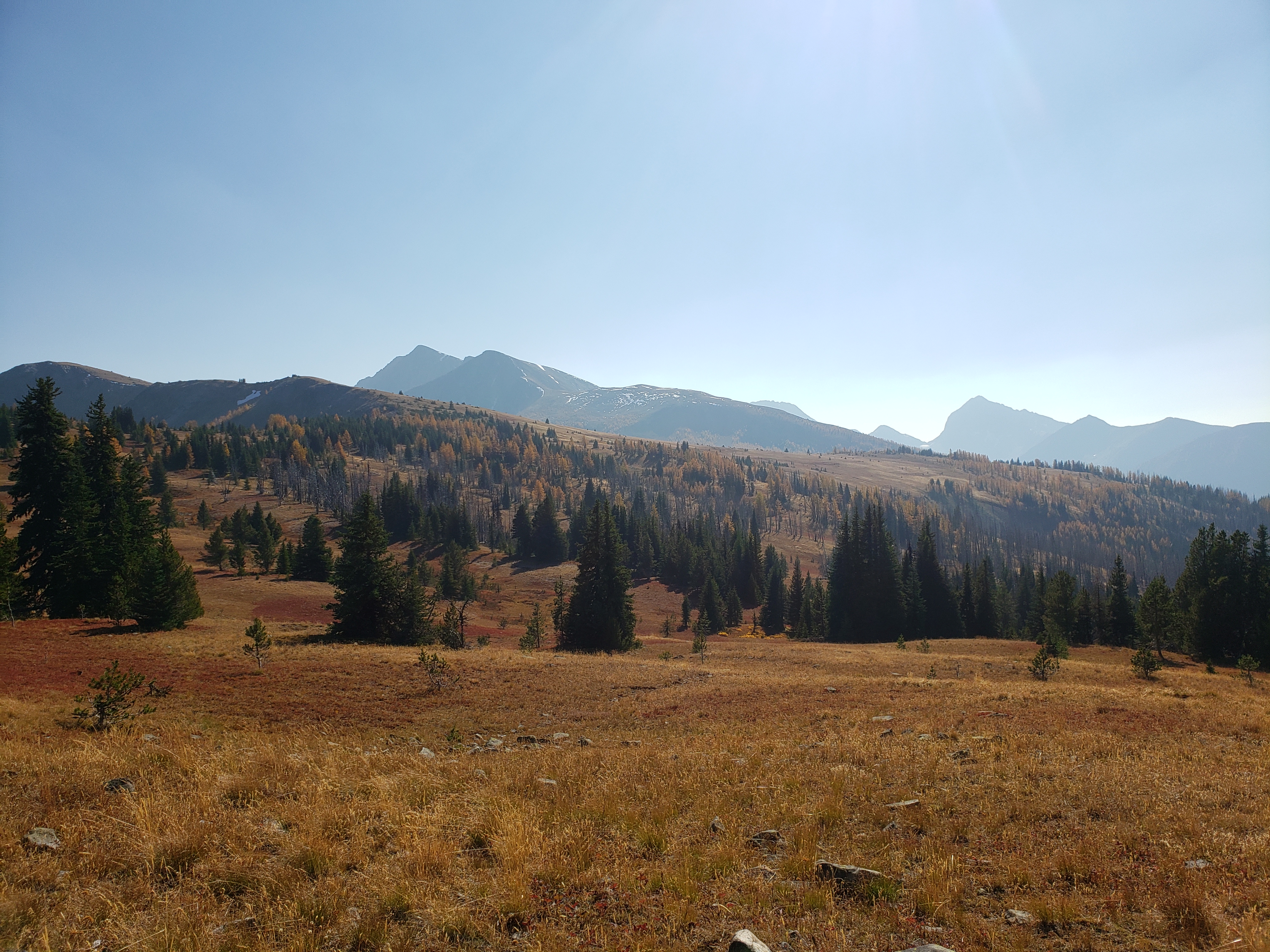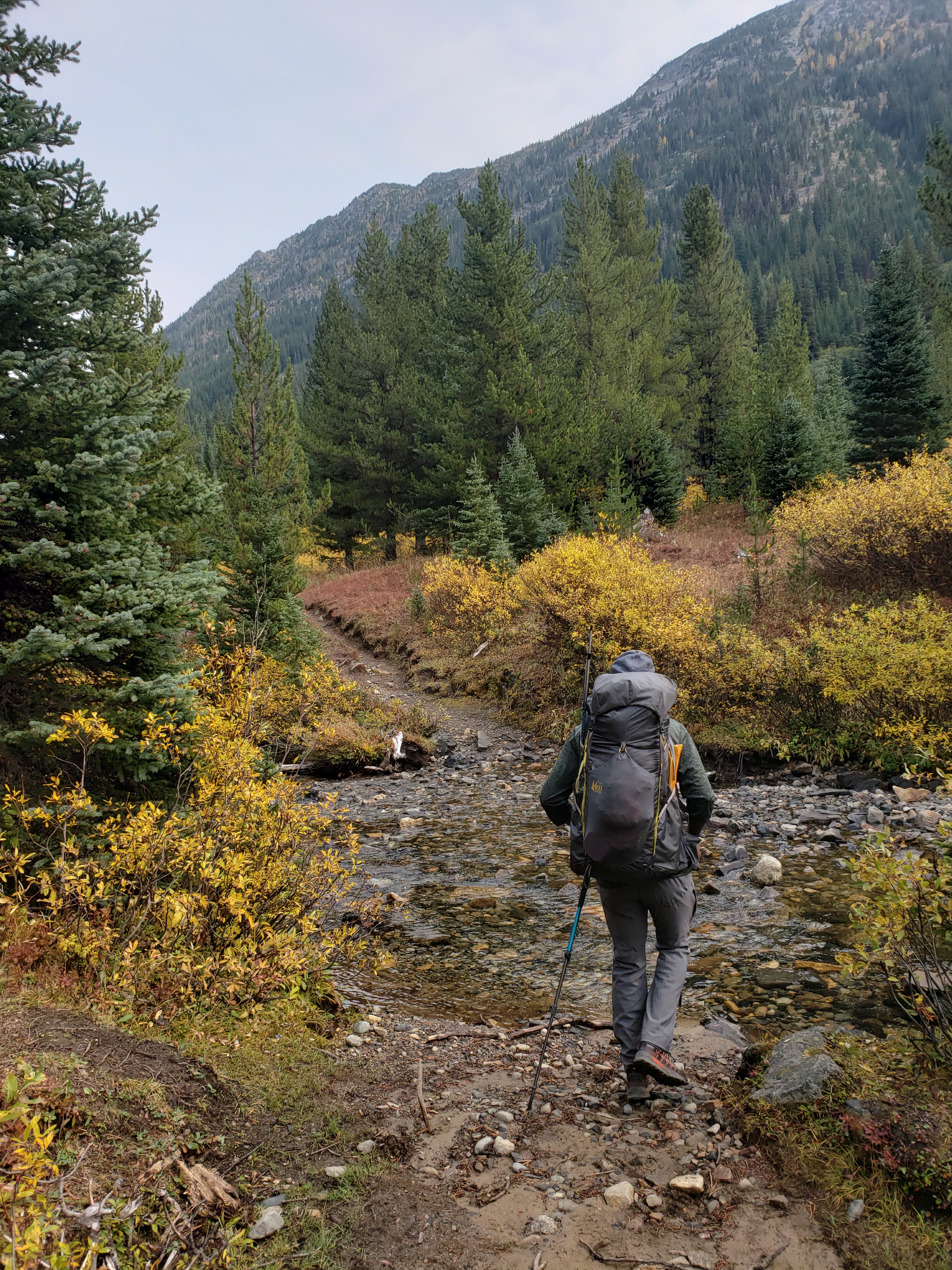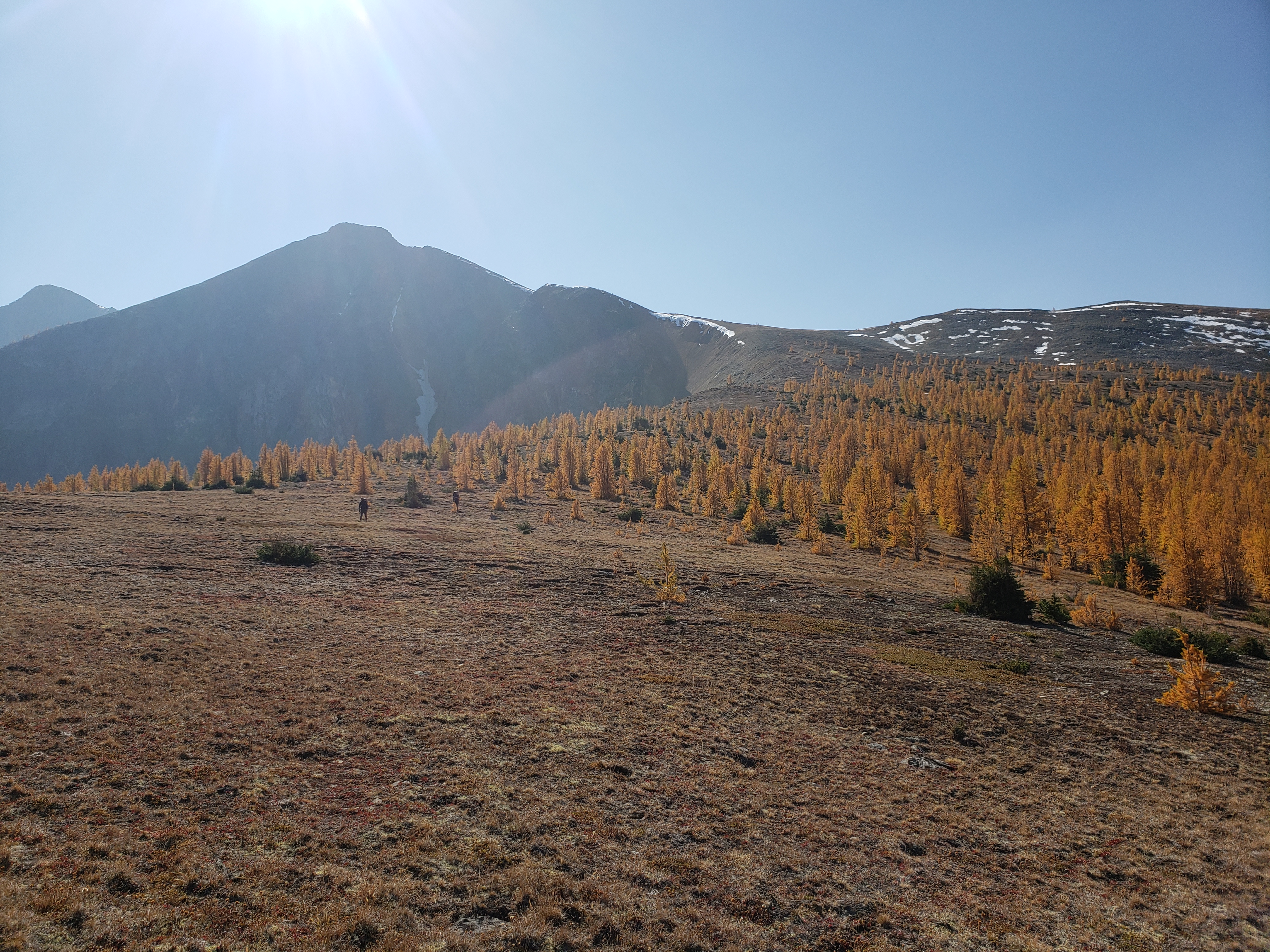 When we were close to the first pass, which was only a couple hundred feet of elevation gain from camp (phew) the sun started making moves. Suddenly the larches were backlit and we were in a cocoon of yellow and IT WAS FINALLY HAPPENING our pace slowed to like 1/10th of a mile per hour and we started basking. This was what we had been hoping for. A trail above 6000ft that just clung to the side of a valley covered in larches, maintained elevation rather than going up 2,000ft and then down 2,000ft, just a beautiful traverse on a warm sunny yellow day. There was another warden’s cabin up there too, which isn’t even fair. I always joked I wanted to retire and be a park ranger but maybe now I want to specifically be a Canadian park ranger if that’s where they’re patrolling.