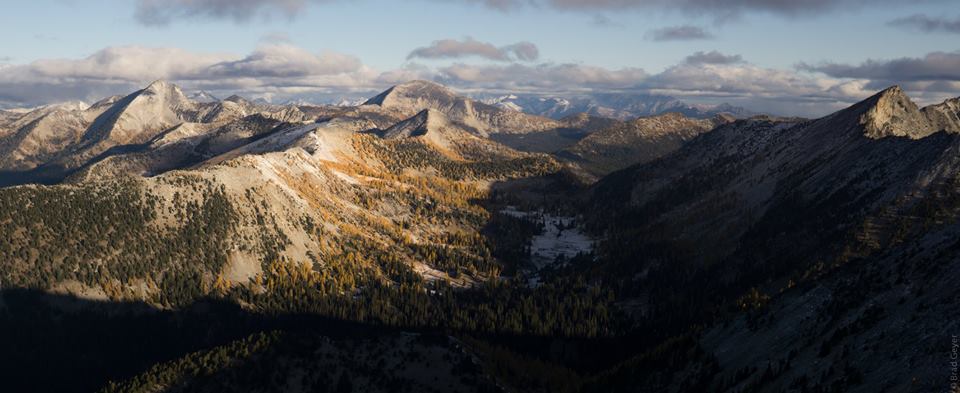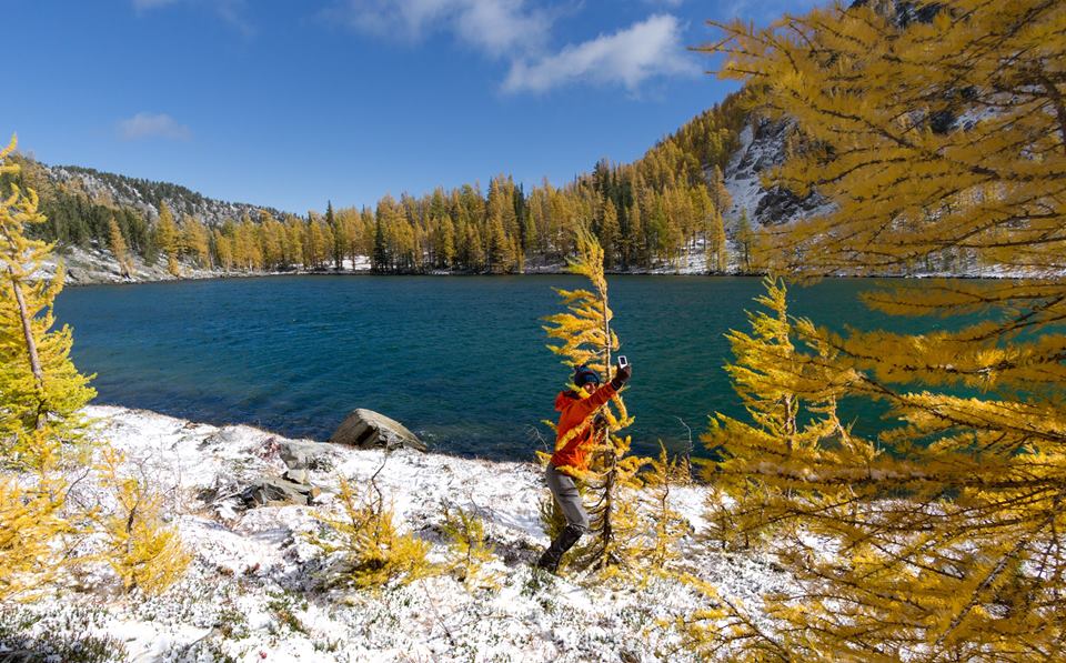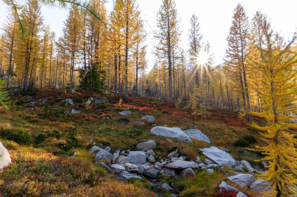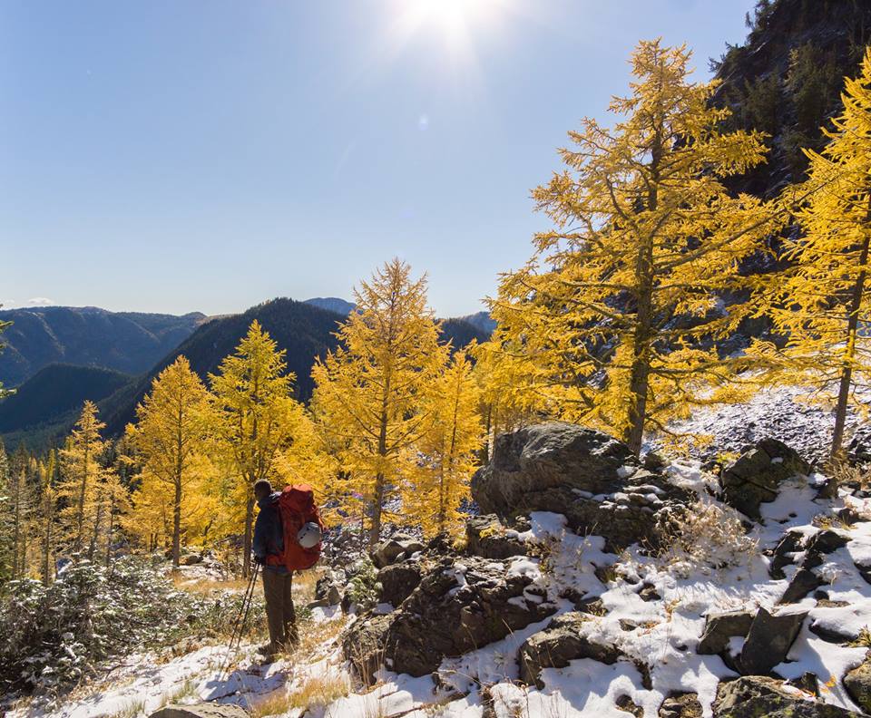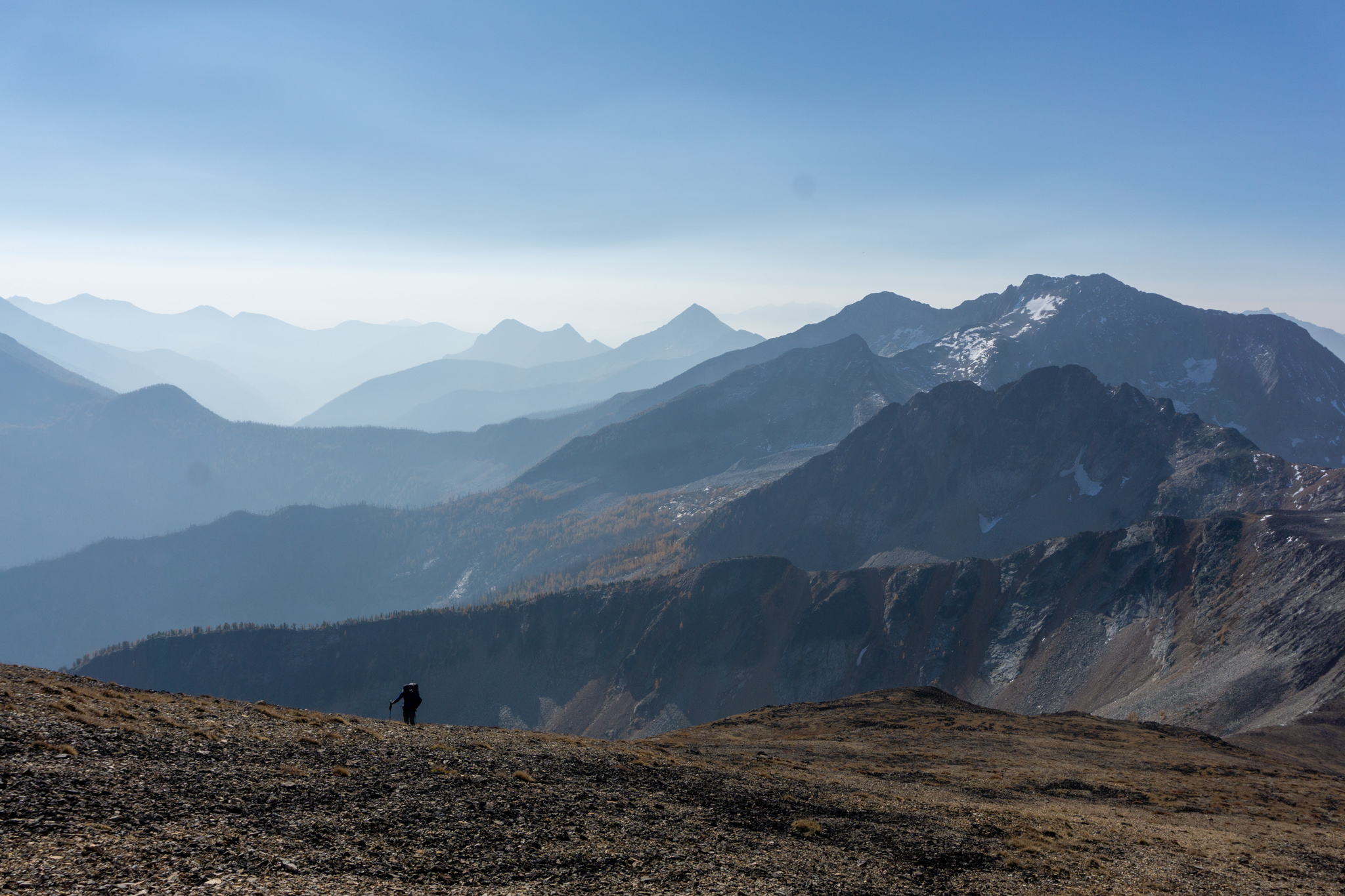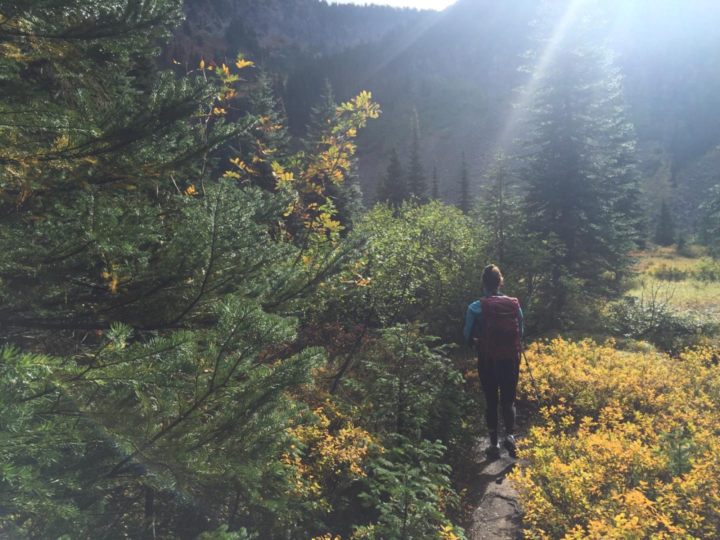 When we were close to the first pass, which was only a couple hundred feet of elevation gain from camp (phew) the sun started making moves. Suddenly the larches were backlit and we were in a cocoon of yellow and IT WAS FINALLY HAPPENING our pace slowed to like 1/10th of a mile per hour and we started basking. This was what we had been hoping for. A trail above 6000ft that just clung to the side of a valley covered in larches, maintained elevation rather than going up 2,000ft and then down 2,000ft, just a beautiful traverse on a warm sunny yellow day. There was another warden’s cabin up there too, which isn’t even fair. I always joked I wanted to retire and be a park ranger but maybe now I want to specifically be a Canadian park ranger if that’s where they’re patrolling.