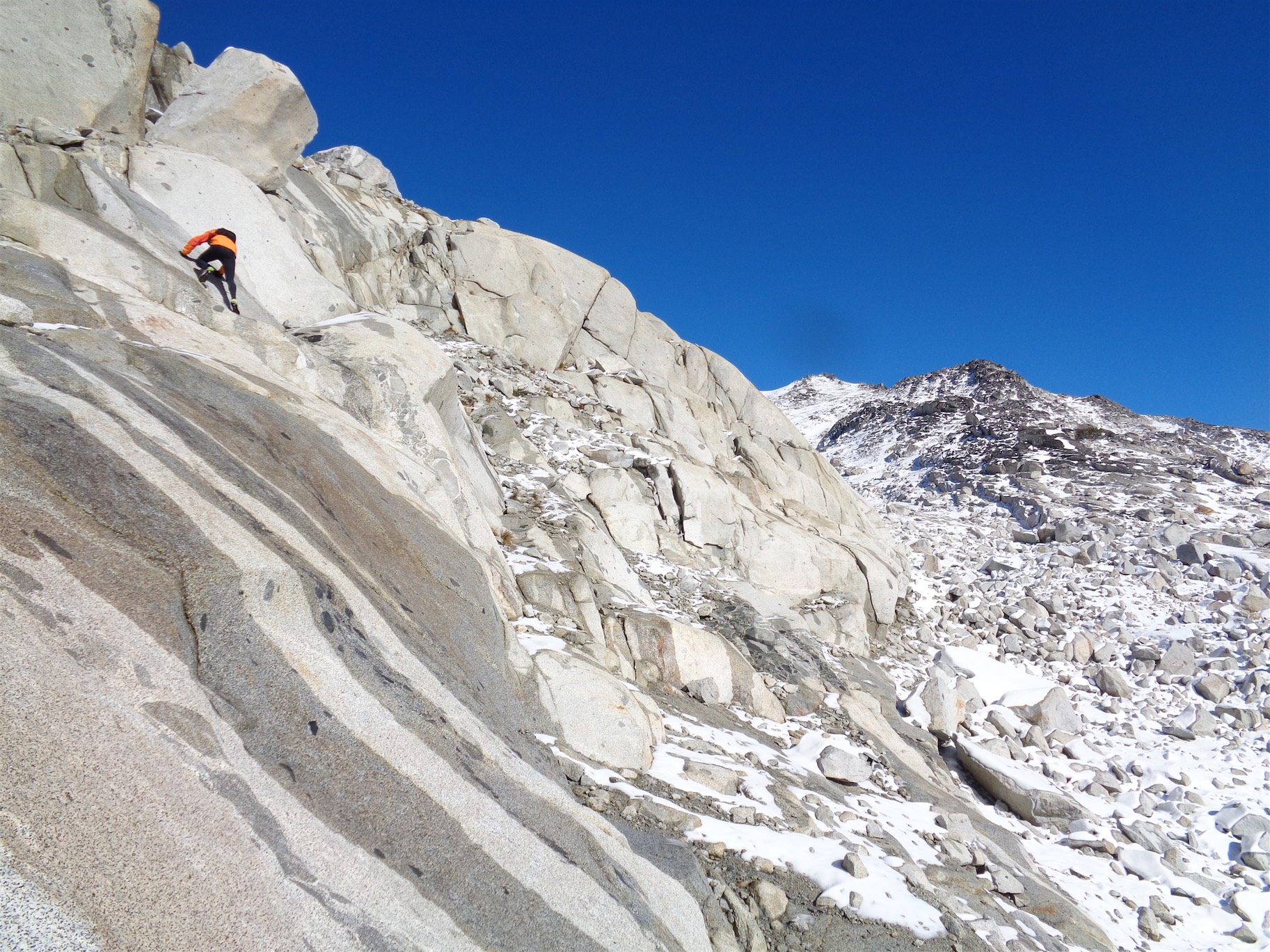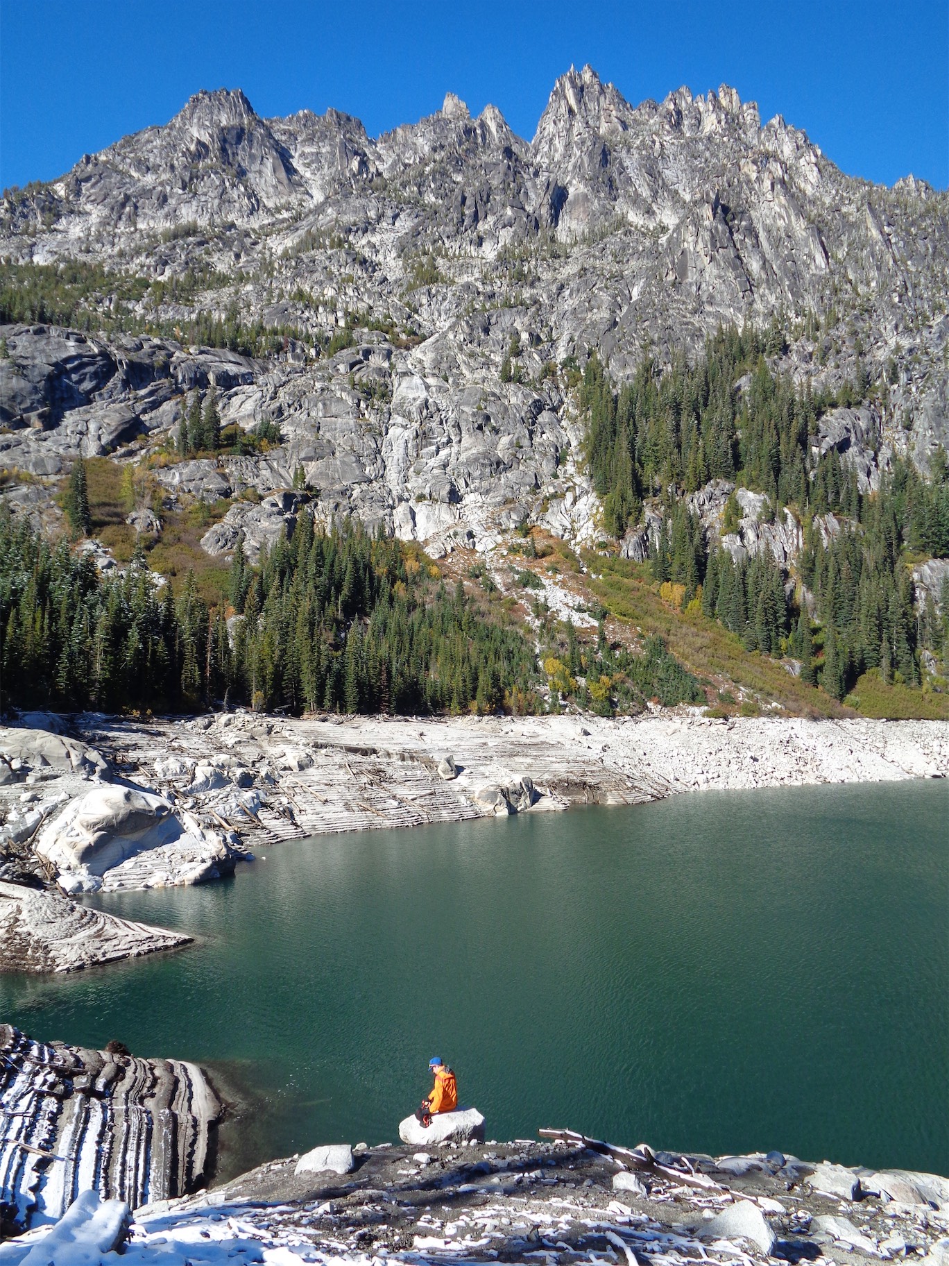 These peaks are absolutely giant. Totally different feel from the Cascades. We saw another moraine with a bright green lake behind it and looked at each other. Uhhh we need to go to this right? We need to go directly to this lake? We trotted off giggling through dense larches. Thank you, larches, for being so soft and not stubborn stiff evergreens that clothesline you when you try to rush through them. After some rambling we were able to get to the toe of the (very dirty) glacier and took a great lunch break in what felt like a foreign land. It’s truly like the rock walls of Moab meets North Cascades rock, with yellow aspen traded for yellow larches and the bonus of glaciers right next to you. Pictures will never do it justice, and I have to winder what this will look like in another 20 years of glacial recession and brush growth. It’s absolutely spectacular, will it be surrounded by trees in 50 years?