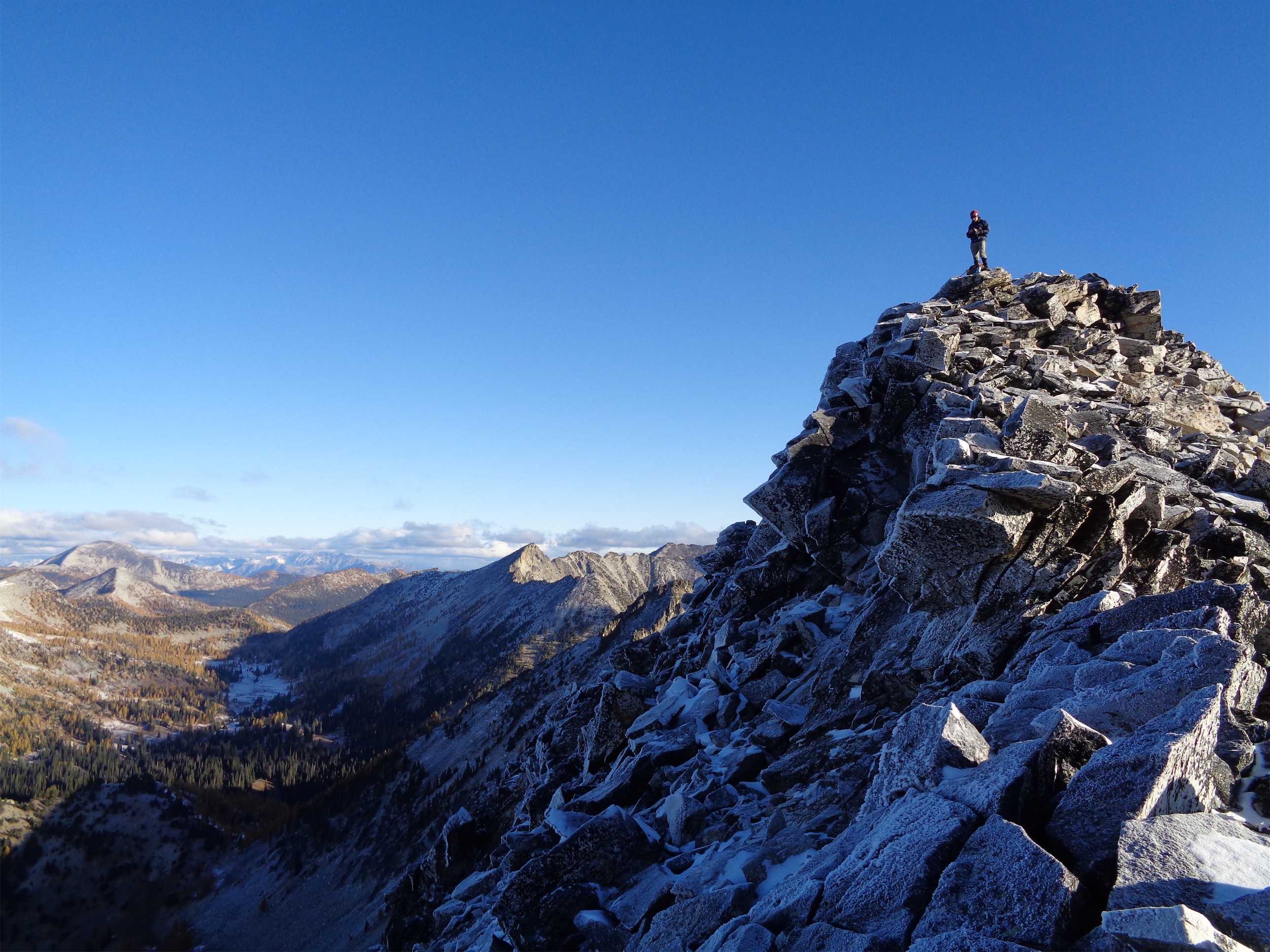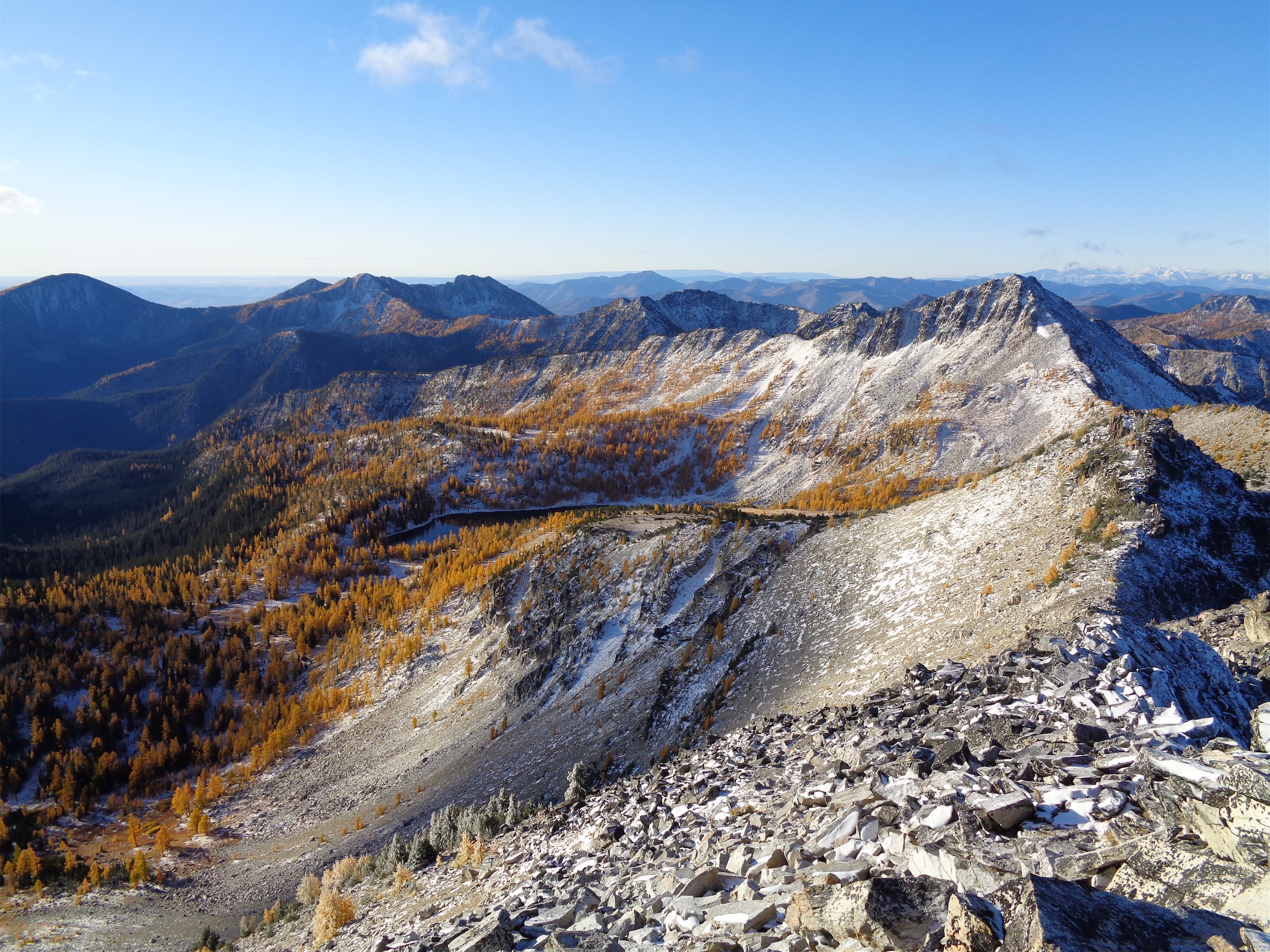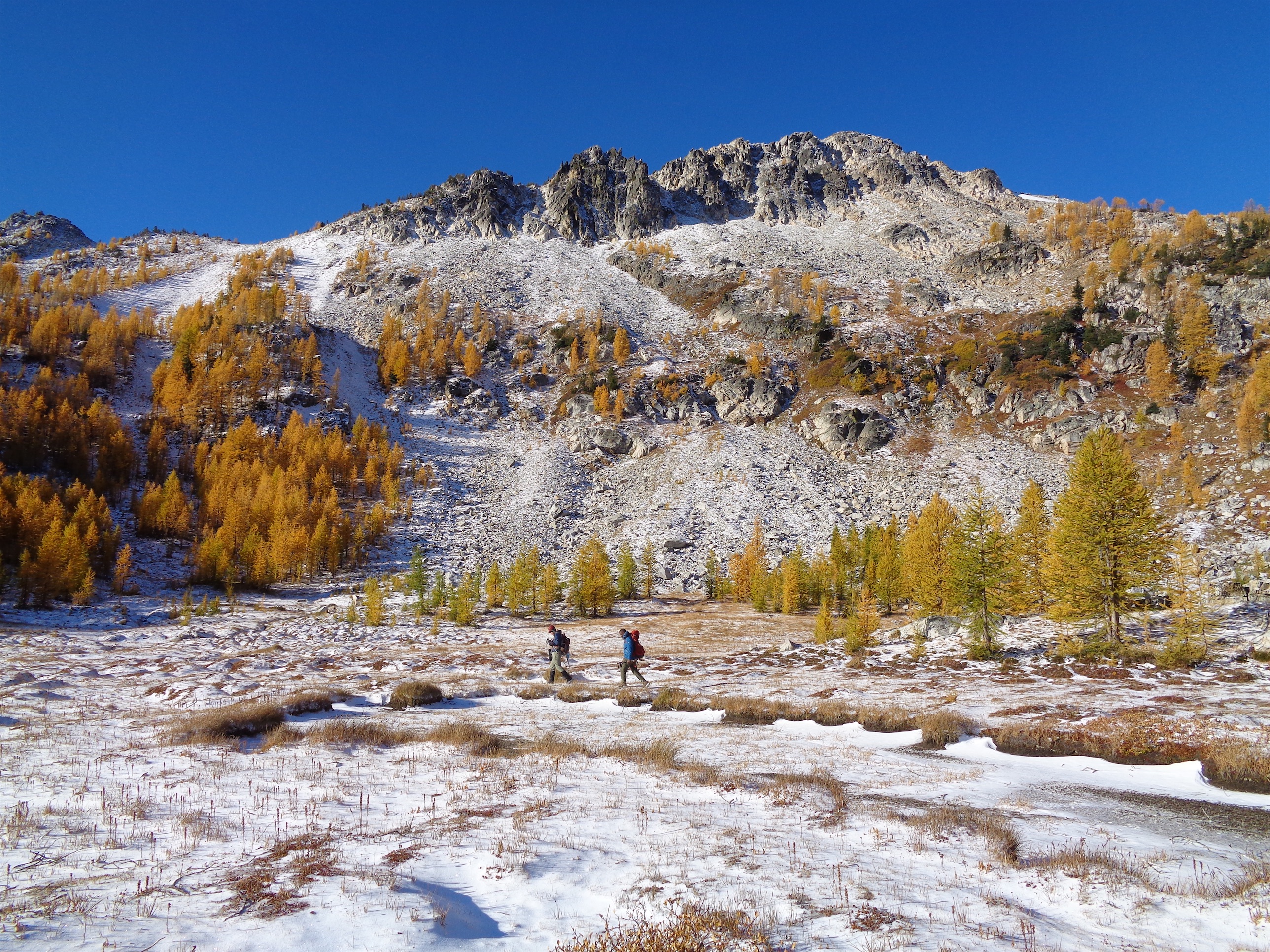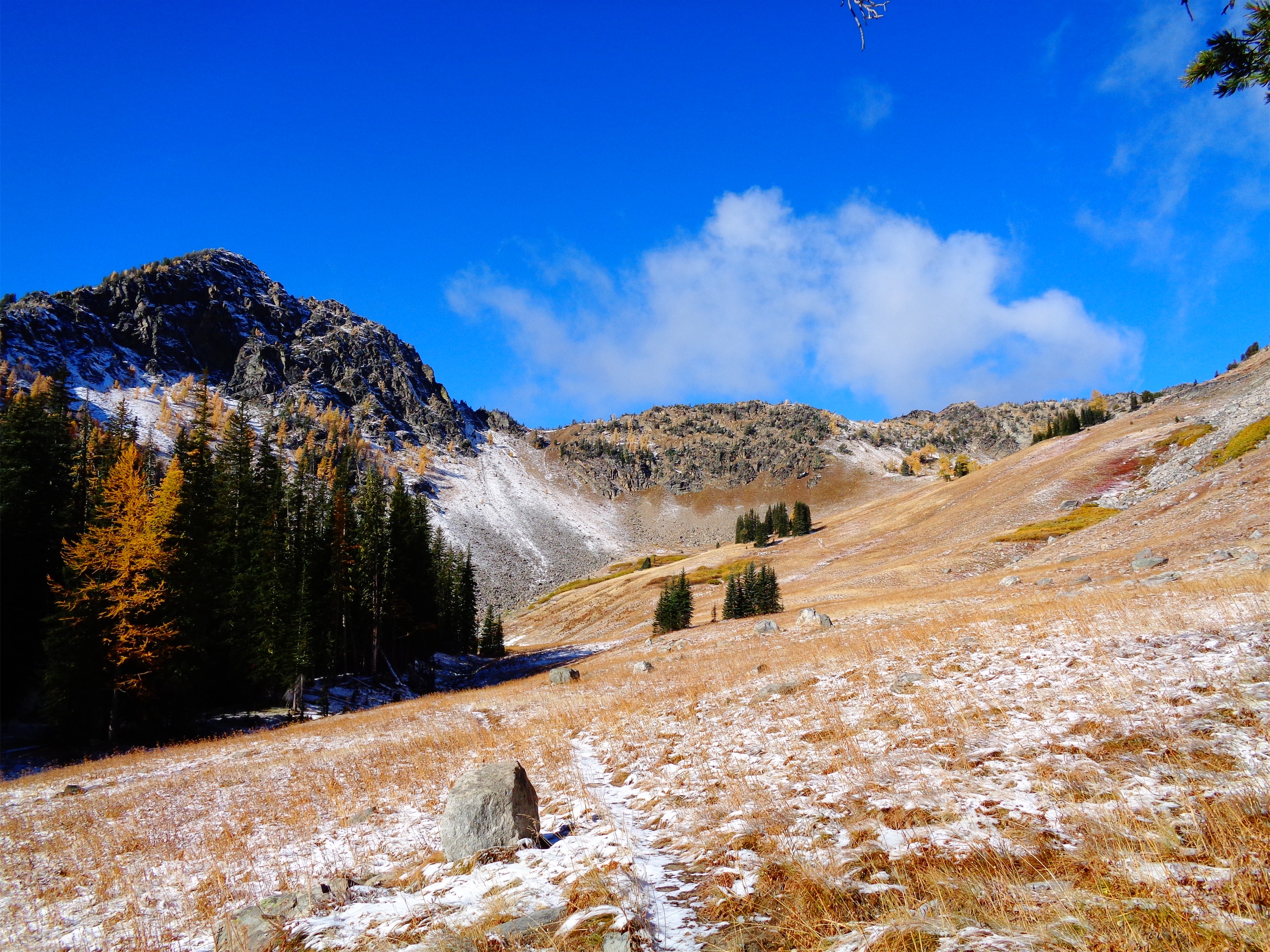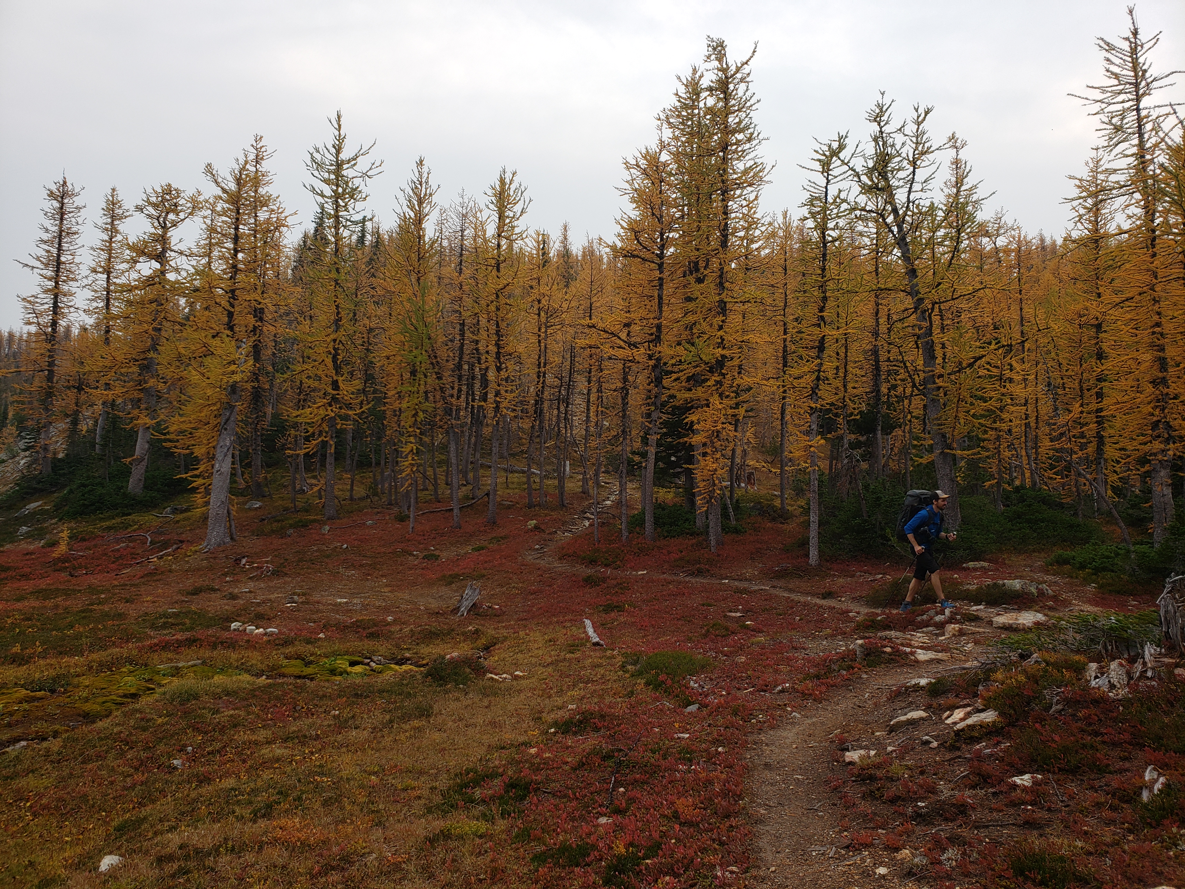 And we crested the pass and what did we see?! Was it more larches?? You bet your ass it was more larches. The trail snaked along the gravelly hillside (tease!) before turning straight into the next grove of larches. Trail optimized for larches.