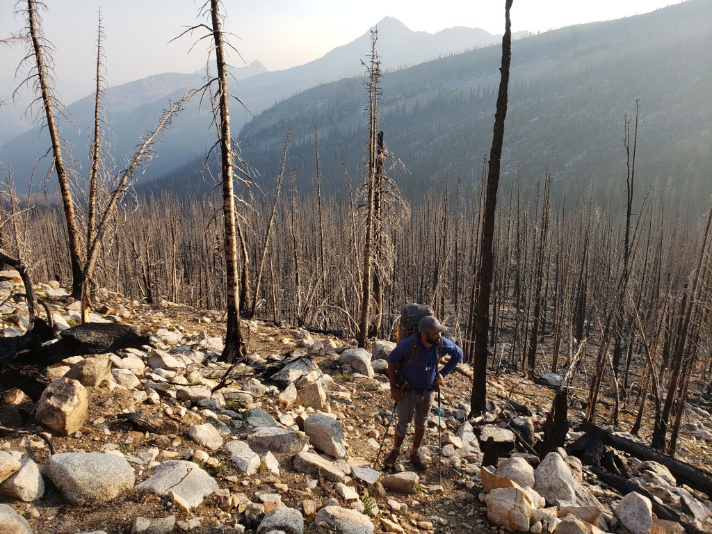 The gradual hill to the pass was hell on my trashed city legs, it went forever gaining one foot per minute or something stupid like that. It was smoky, you could smell it, but the views were still elite. I’m used to cramped steep valleys in the Cascades, not these huge broad ridges and wide open valleys with massive mountains on either side. I was almost depressed rolling into camp knowing that was our one day of glory. Helmet falls took me by surprise – it’s hundreds of feet long. Not just a cute little thing in the forest. But yes, the campsite was yet another campsite well below treeline next to a river with no views. Only bears.
