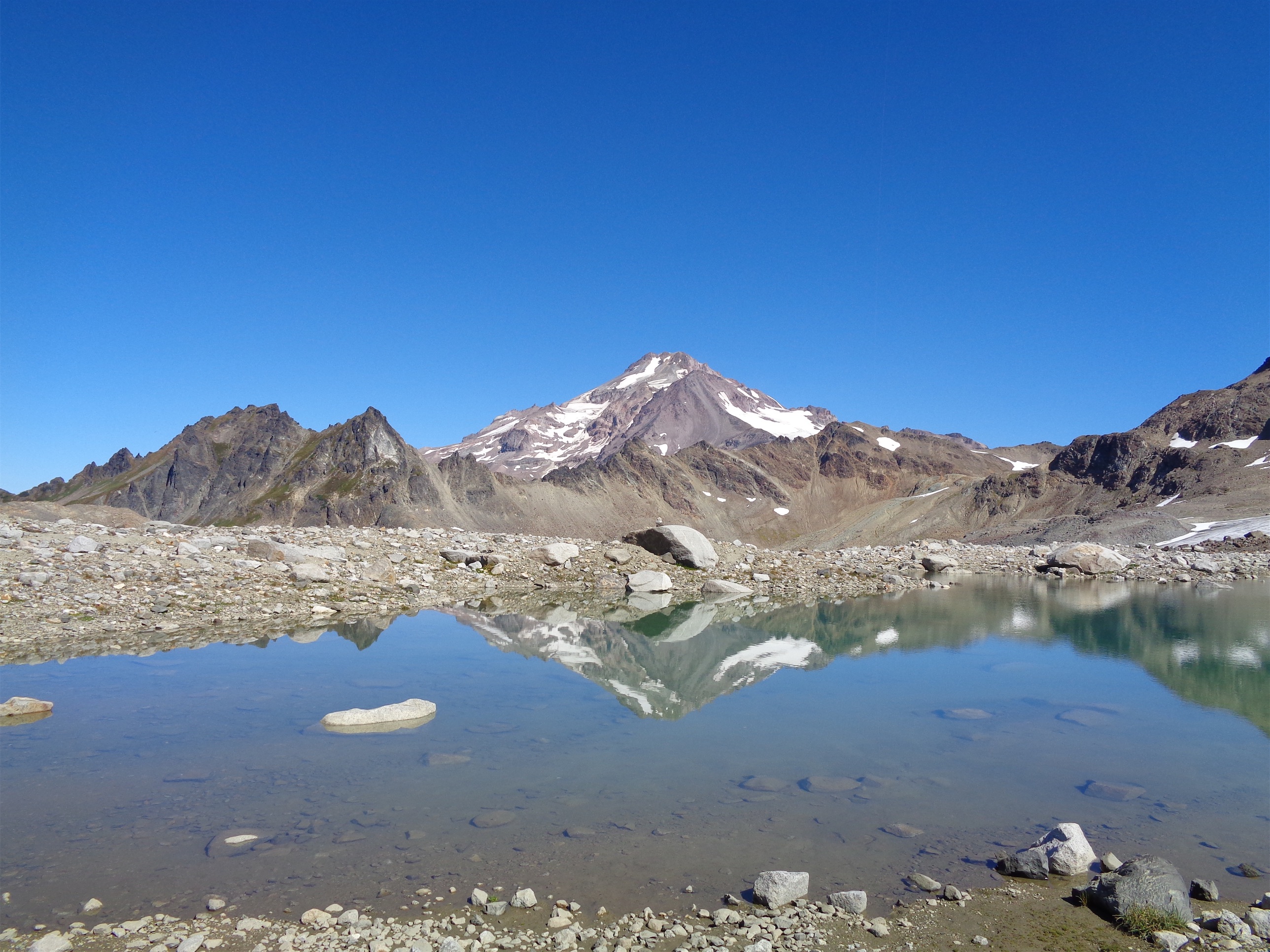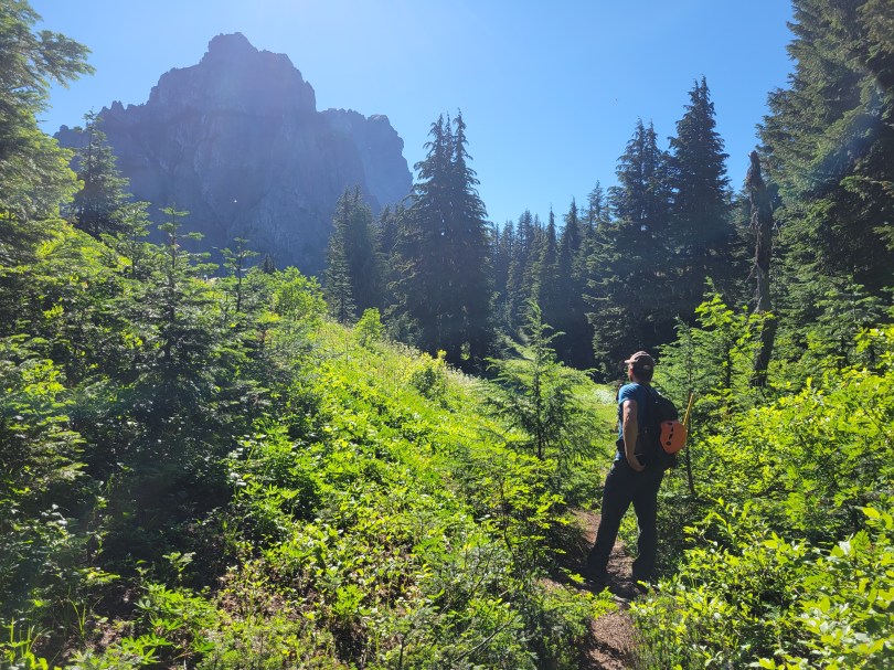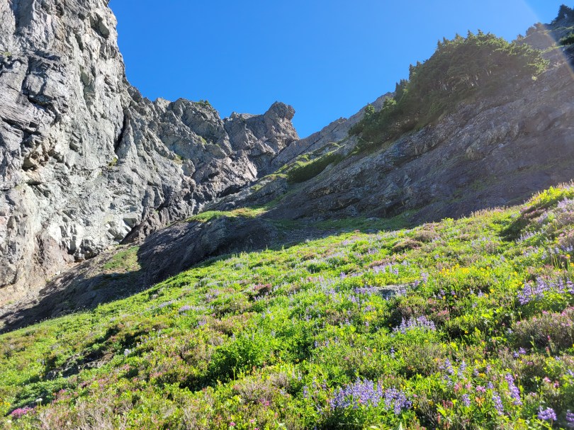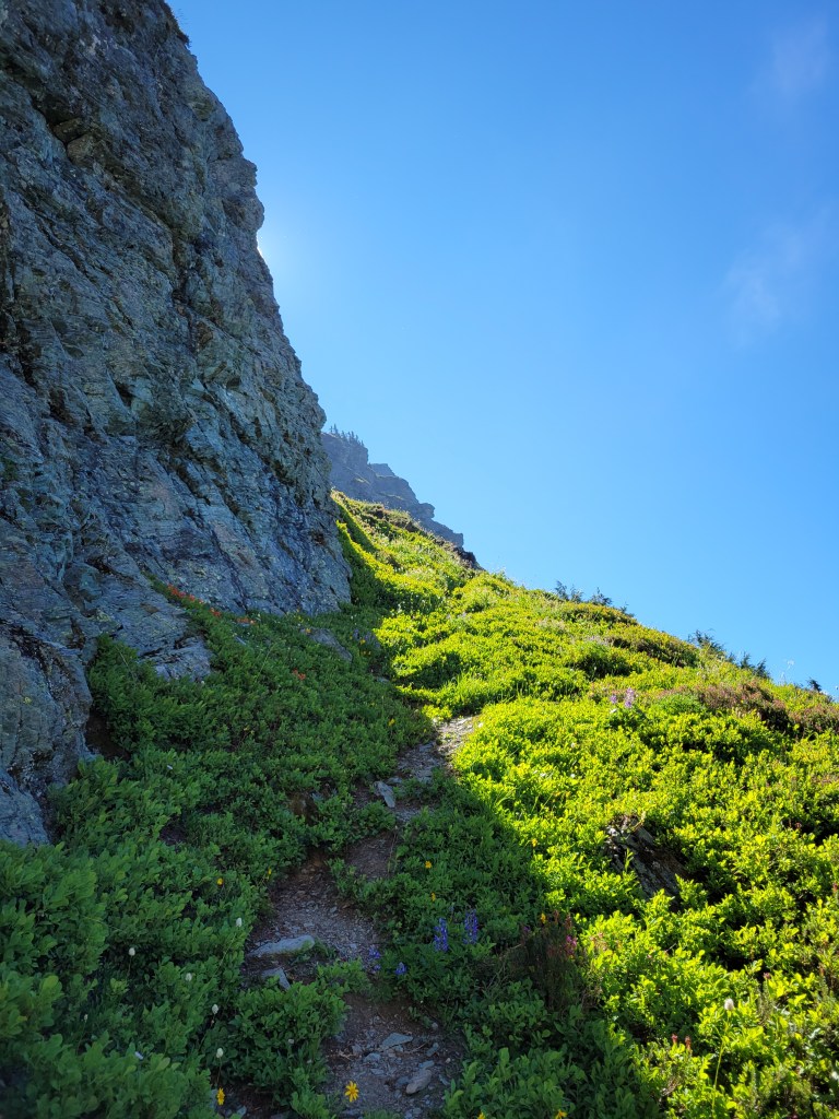 The next half mile is a crazy mix of desolate burn and thick green brush with zero gradient, just a 0-100 type swap within an inch of ground. The contrast is crazy. The trail is on a super steep slope and has been eroding, so you’re walking on some 6″ at BEST tread mostly under brush. I imagine this will be shoveled/widened/rebuilt in time once whoever is crushing the trail building down low gets to it. After this mildly tedious traversing you break into a meadow (with no flowers, add insult to injury) and probably promptly lose the trail. Welcome to the wilderness. The meadow is easy. Walk straight across and up the shoulder and you’ll recatch a section of trail along the edge of the trees above you. In another 100ft you’ll lose it. Drop some elevation to skirt obvious cliff bands. Maybe you’ll hit a flat meadow with a meandering stream, maybe you won’t. It’s a good landmark though. At the meadow start to re-gain elevation, you won’t find a trail anywhere so just look for the path of least resistance, which will be knee-to-thigh-high huckleberries (that don’t have berries yet). They aren’t bad, unless your legs are already covered in stinging nettle burns because your dumb ass wore shorts.