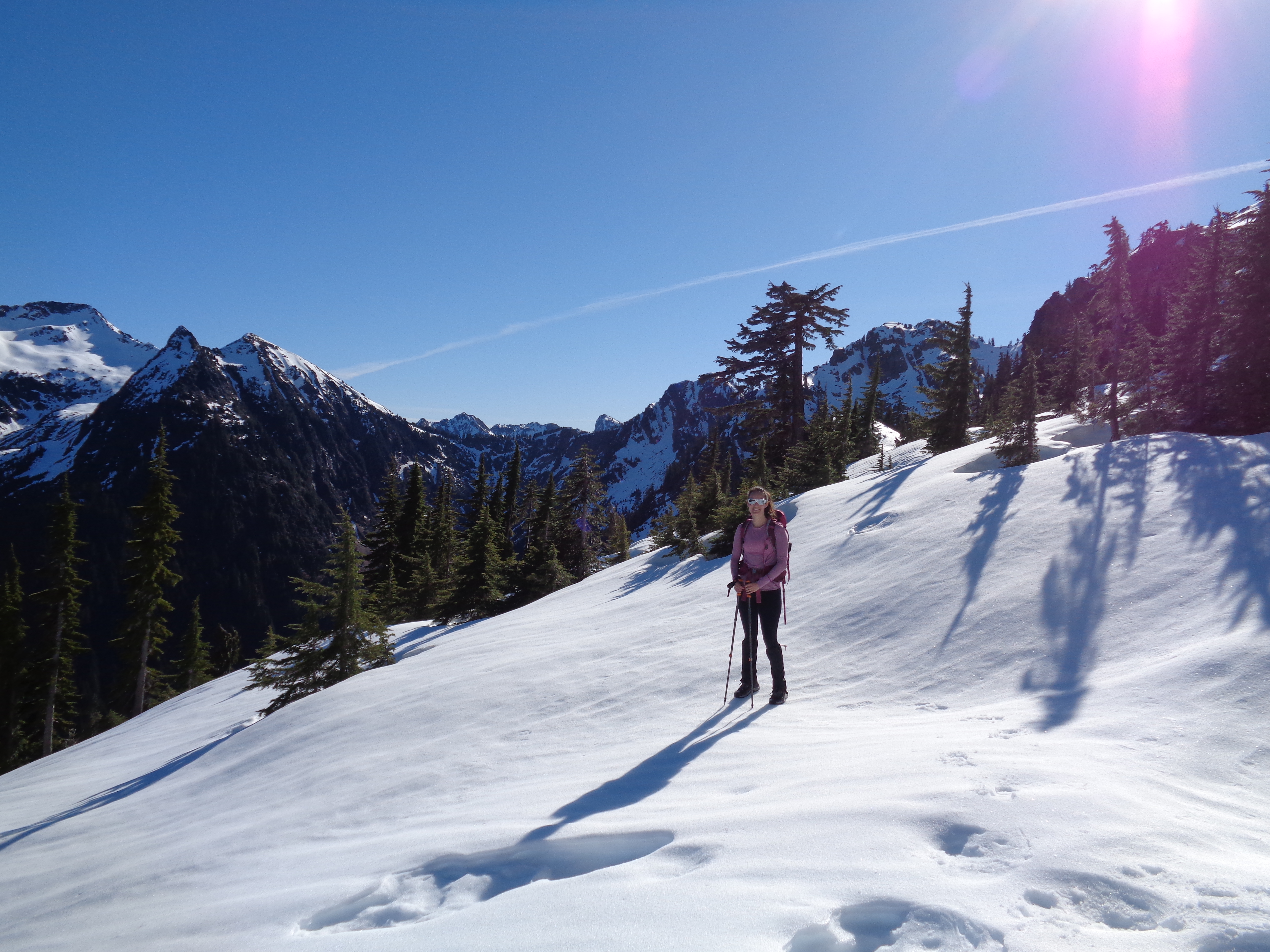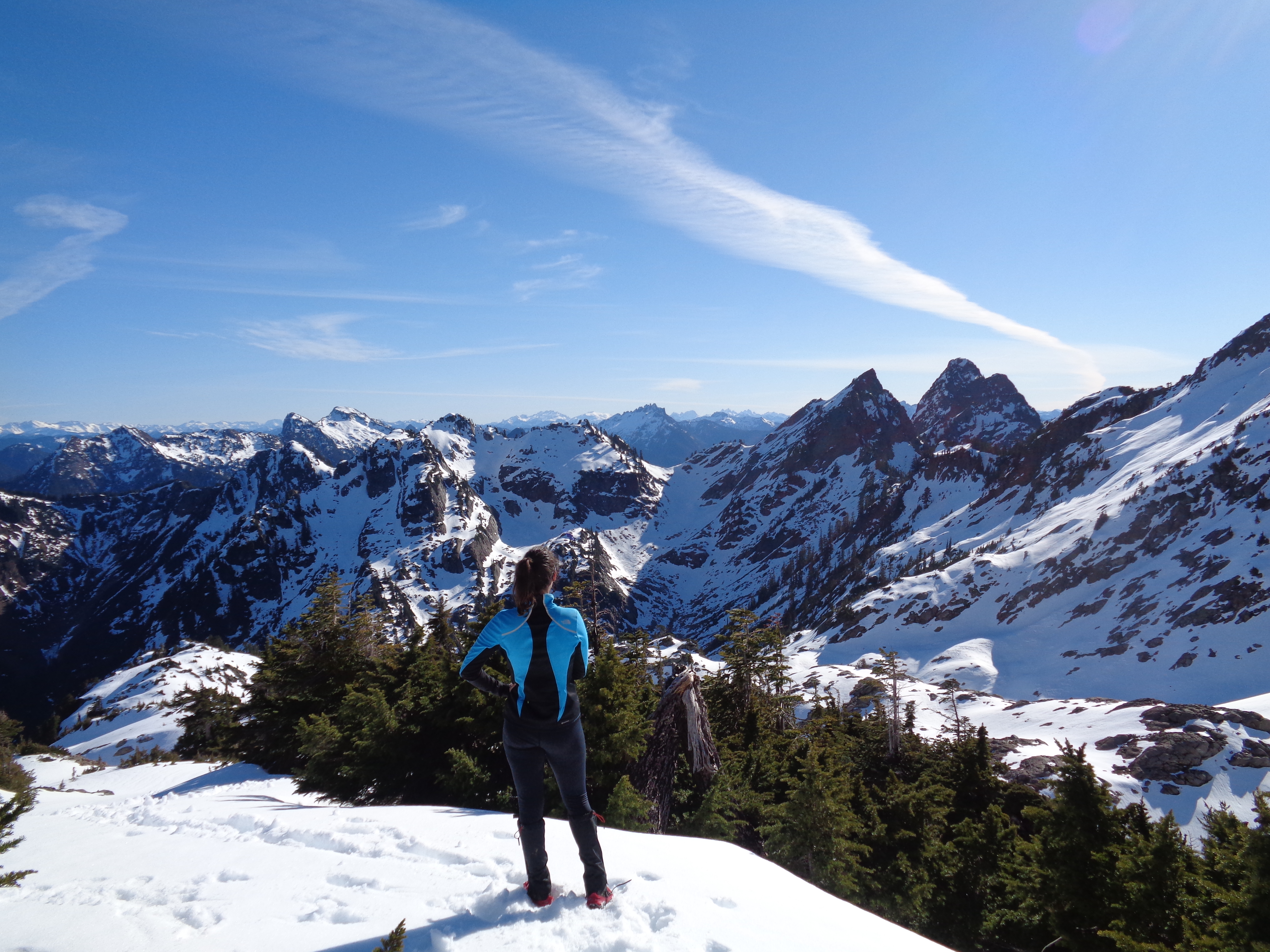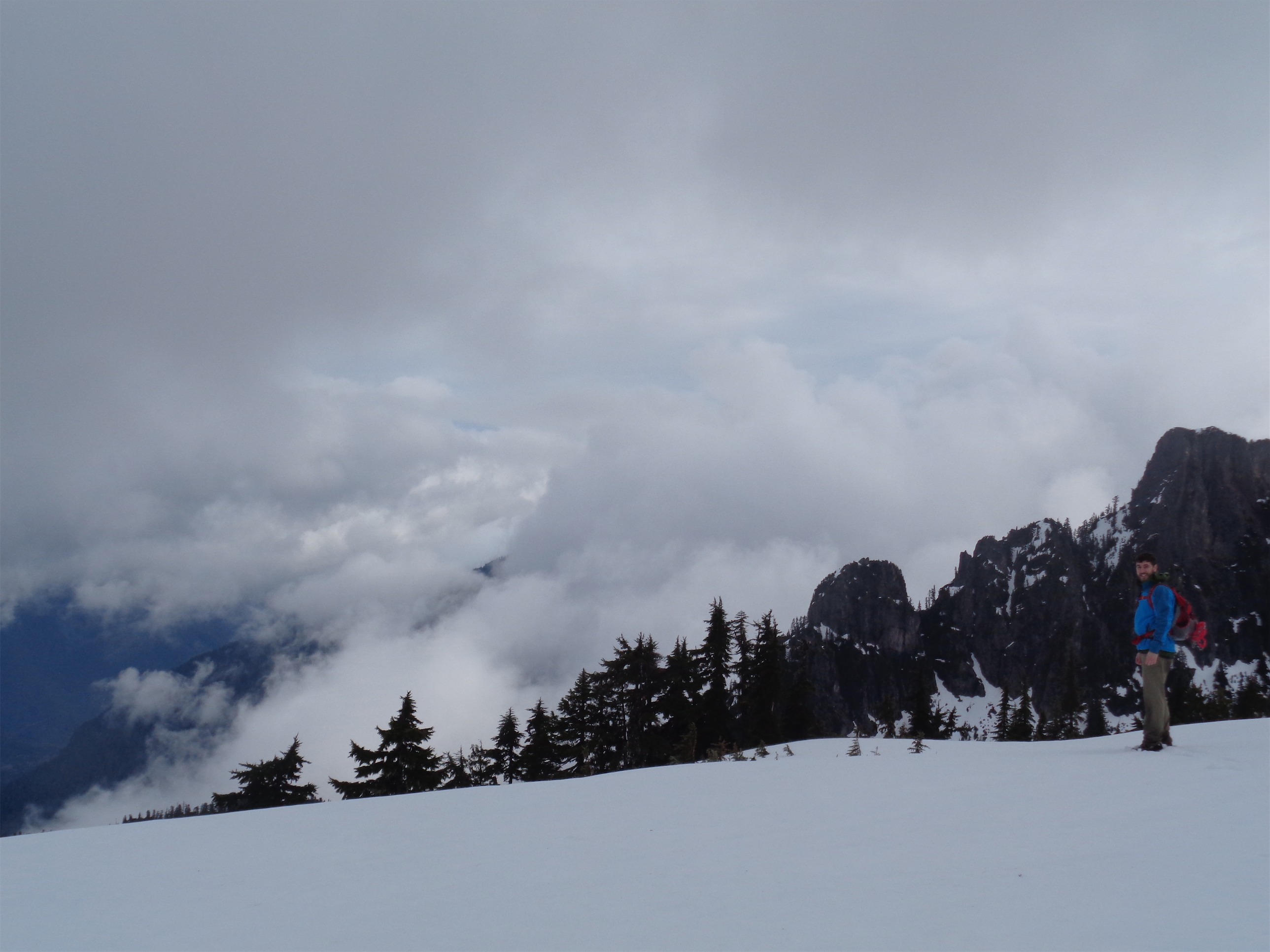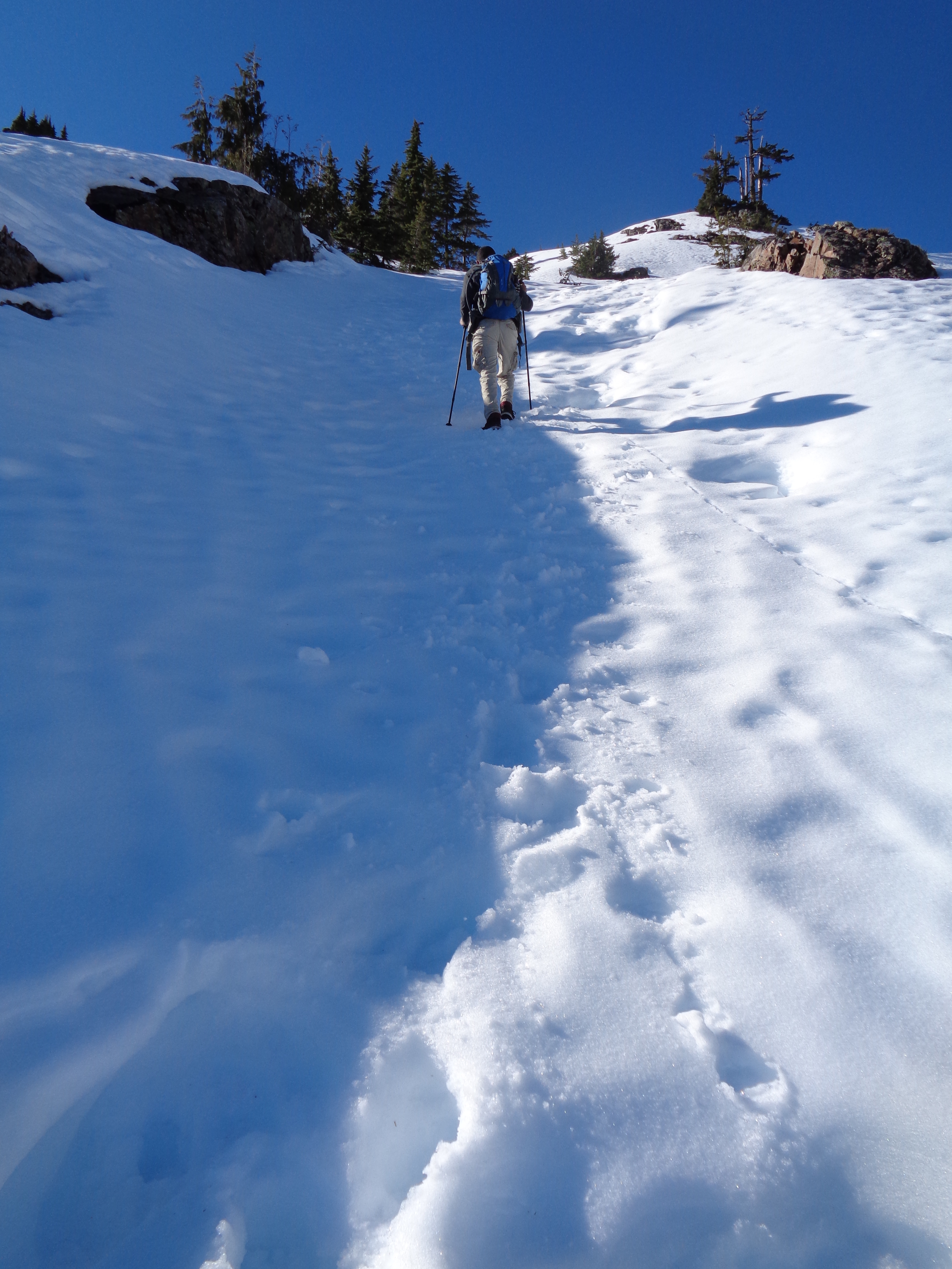 I had no issues in my new La Sportiva Synthesis – shameless plug because they won the Editor’s choice award in Backpacker Magazine, and I was fortunate to receive a pair for testing thanks to Goretex. I don’t have a big sample size, but they’re the most breathable waterproof boots I’ve ever tried. No sweaty feet, and the water that did spill over the edges occasionally actually dried up. Which is insane. Usually I just keep hiking with water in my boots. It’s going to be tough going back to my usual pair, but when it comes to steep, icy, snowy terrain, I stick with my stiffer boots. The Synthesis is very flexible, which is great for lighter hikes (I was carrying around 20 lbs in my pack) but I don’t know if I’d push it on more technical trails. Though I will say (from Defiance a day earlier) the soles grip snow surprisingly well. I was having a much easier time without microspikes than Lee in her Oboz when we were on fresh snow. So we’ll see just how much of a beating these guys can take.