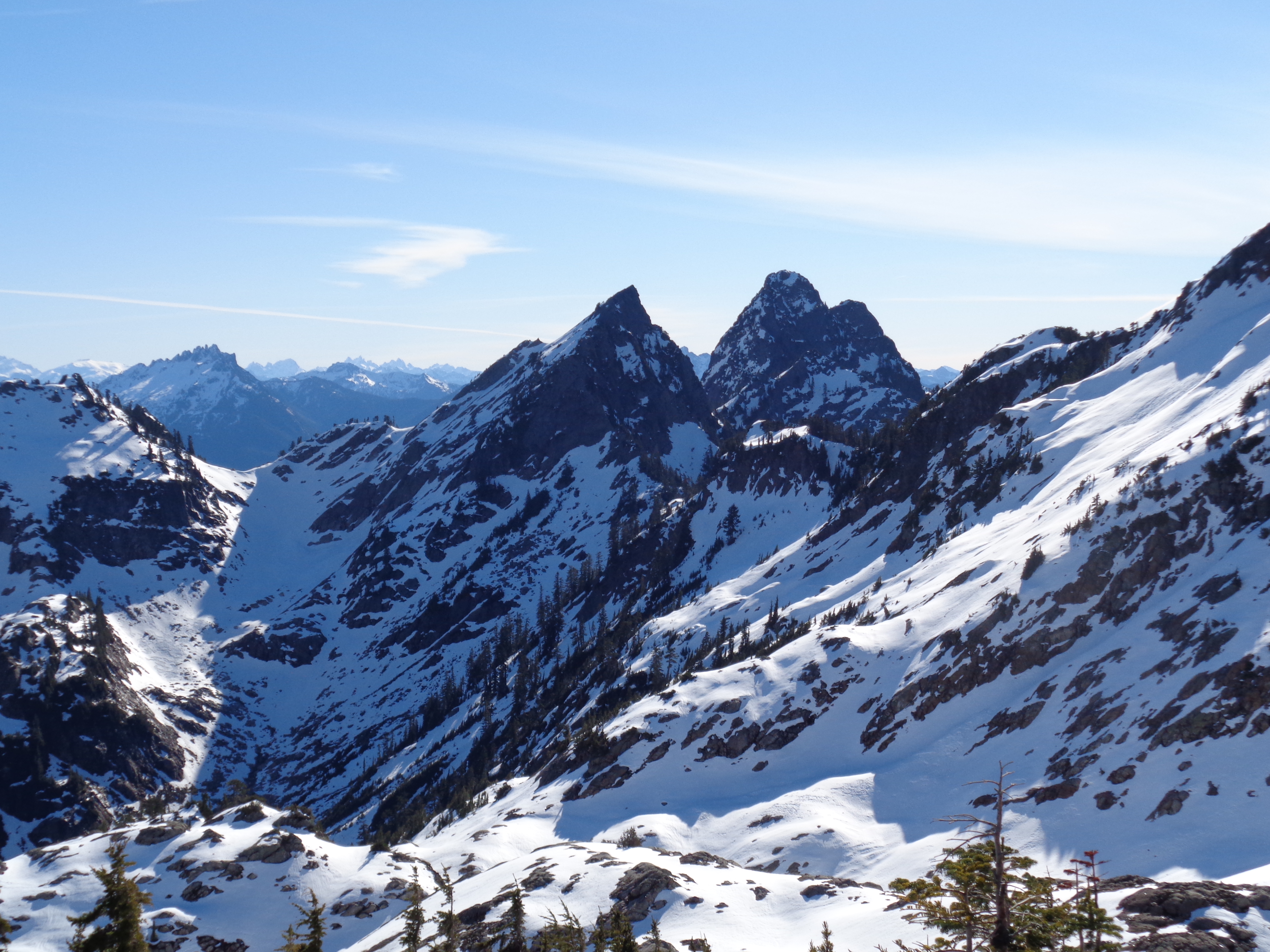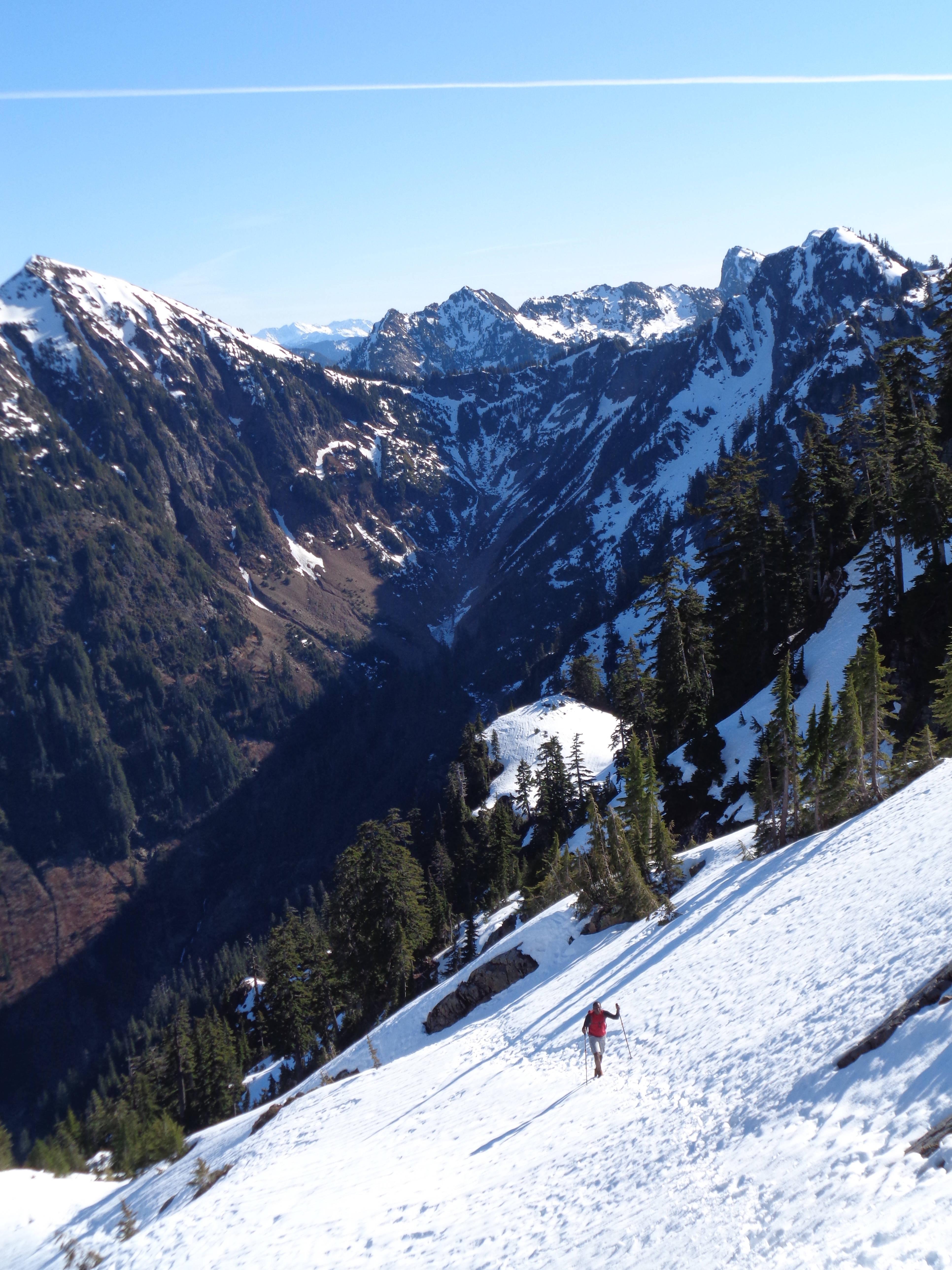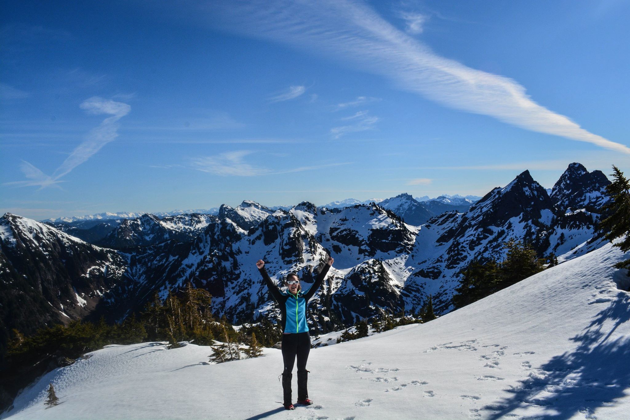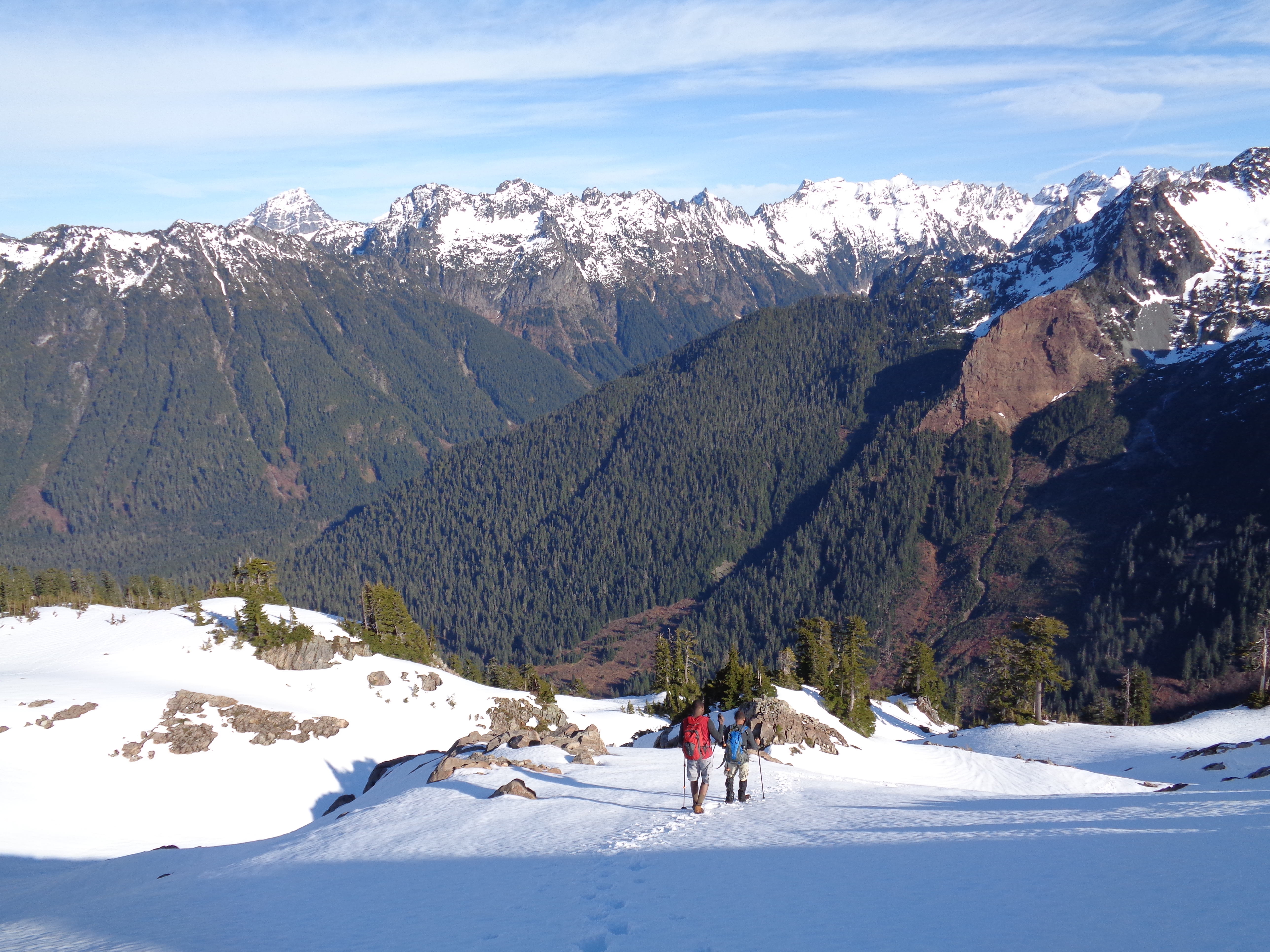 I had no issues in my new La Sportiva Synthesis – shameless plug because they won the Editor’s choice award in Backpacker Magazine, and I was fortunate to receive a pair for testing thanks to Goretex. I don’t have a big sample size, but they’re the most breathable waterproof boots I’ve ever tried. No sweaty feet, and the water that did spill over the edges occasionally actually dried up. Which is insane. Usually I just keep hiking with water in my boots. It’s going to be tough going back to my usual pair, but when it comes to steep, icy, snowy terrain, I stick with my stiffer boots. The Synthesis is very flexible, which is great for lighter hikes (I was carrying around 20 lbs in my pack) but I don’t know if I’d push it on more technical trails. Though I will say (from Defiance a day earlier) the soles grip snow surprisingly well. I was having a much easier time without microspikes than Lee in her Oboz when we were on fresh snow. So we’ll see just how much of a beating these guys can take.
