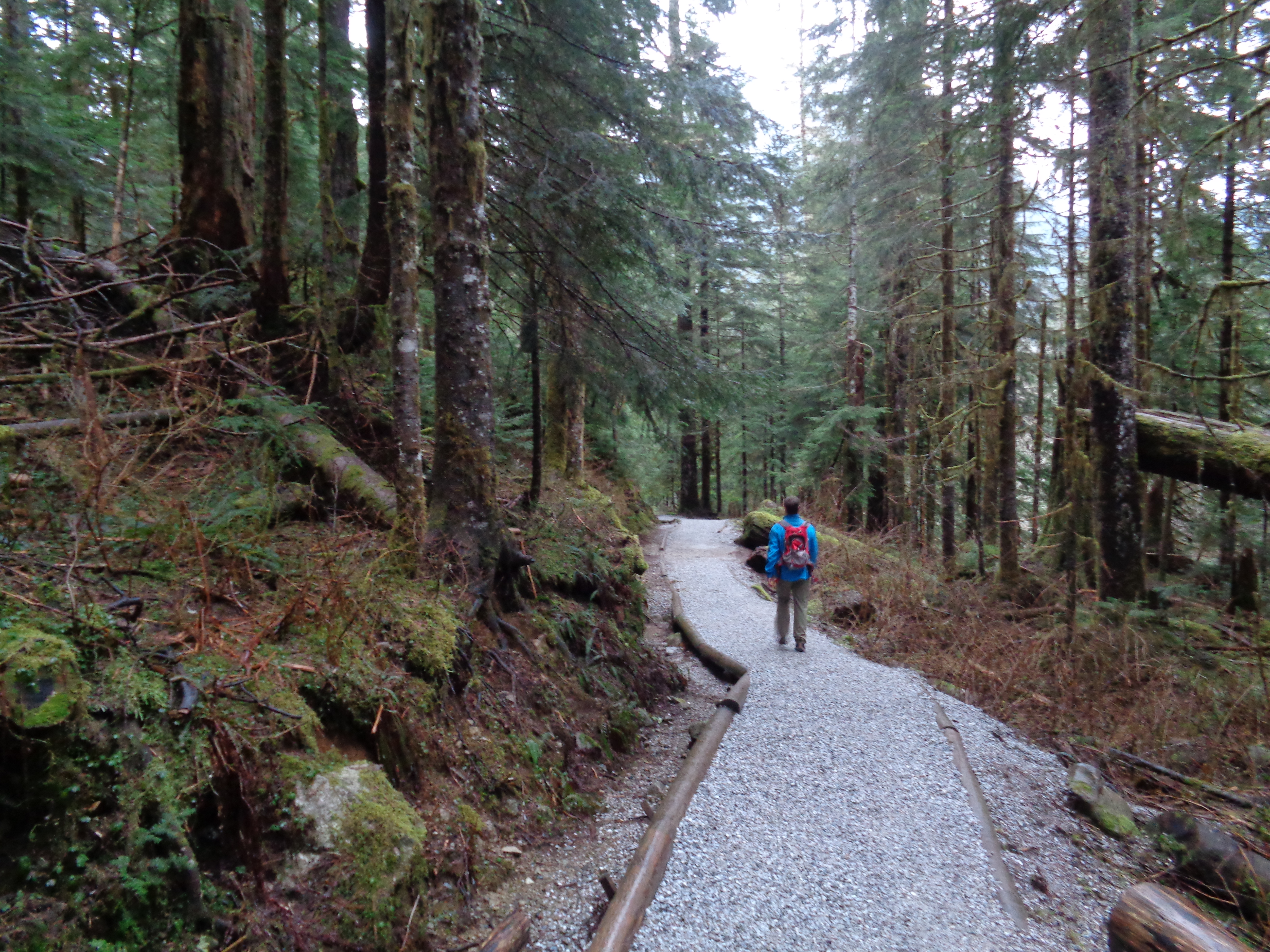 So the road wasn’t quite as exciting as the road to Mason Lake. At least until the way home, but we’ll discuss that later. Accessible to all vehicles, no big potholes, easy road to follow. Trail starts out on an old logging road. Very flat and very wide, and I can see why people trail run it. It’d be a great easy run. It was pouring, so we threw on rain pants and our shells and got started.