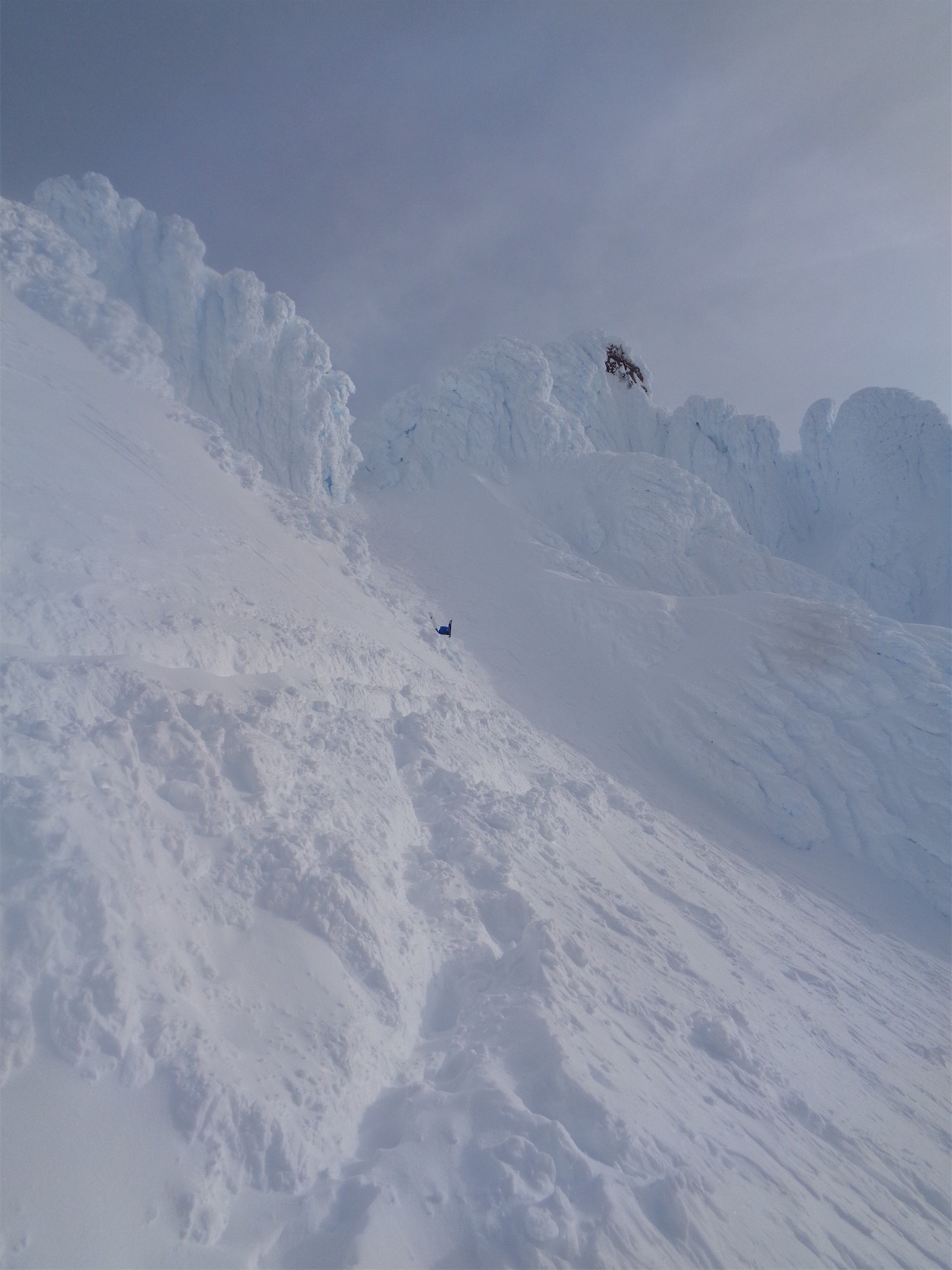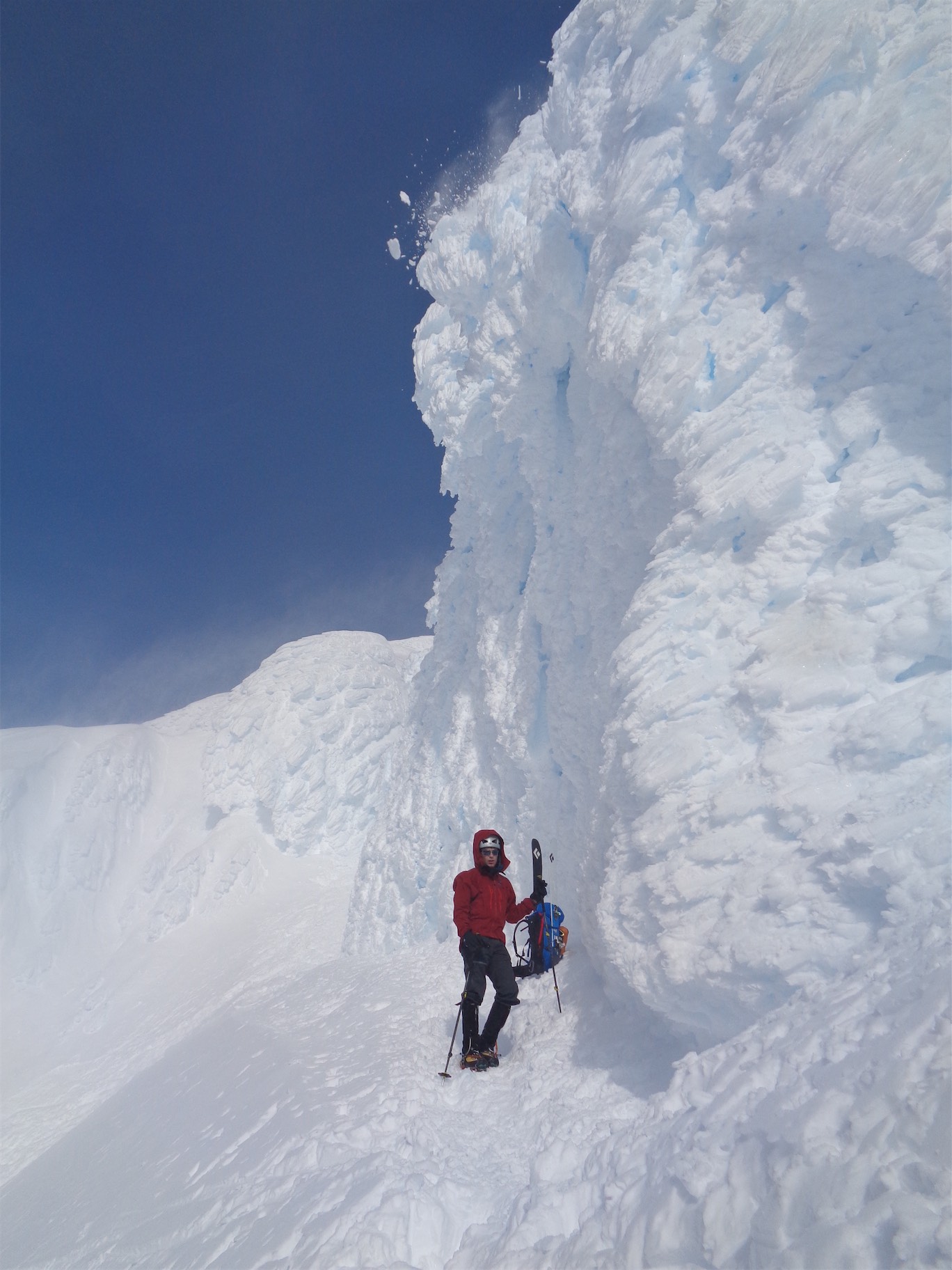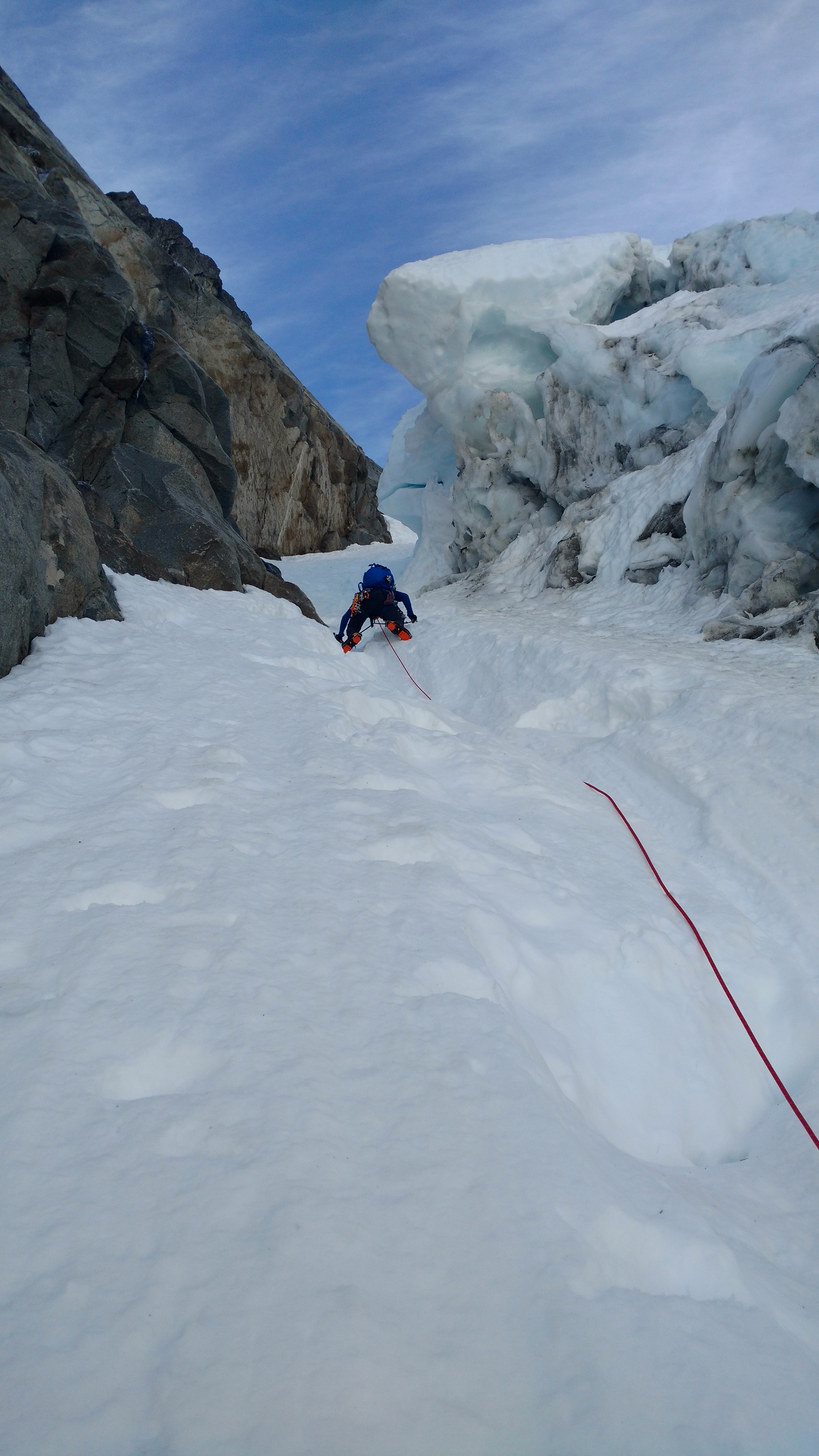 Well the rope stretch was just enough, and I managed to hit the downsloping ledge with my ass. It was sheer except for one tiny crimpy foothold, and the wall next to me had no handholds. Shit. So I was held in place by my autoblock. I prussiked my pack onto the rope so I wouldn’t drop it into the dark black yonder below me and took it off my back so I could put on crampons and get my ice axe. I needed to get onto the snow ledge. With some wriggling and one-handed-crampon-strapping action, I pulled a bunch of slack through the autoblock and scooted over to get my frontpoints onto the one crimpy hold on the slab and kicked a toe hold on the vertical snow. It should only take two moves, I should be able to basically stem it, god dammit why don’t I do more yoga, if I could do a split this would be so much easier. Deep Warrior II. If I fell I’d only go like 10ft down the moat, it would just suck and I’d have to prussik back up the rope to get onto my slab ledge and try again. I was too exhausted for that.