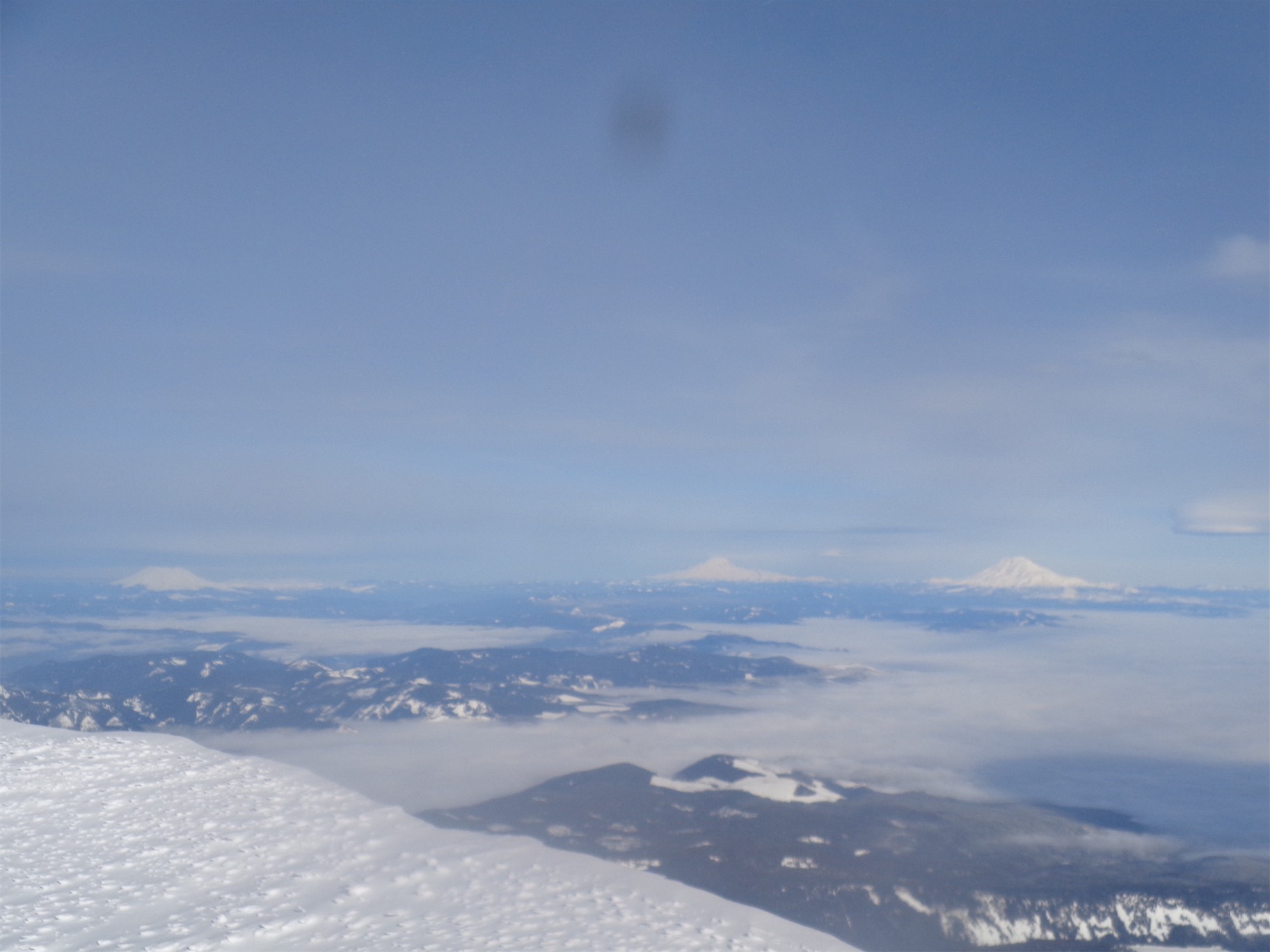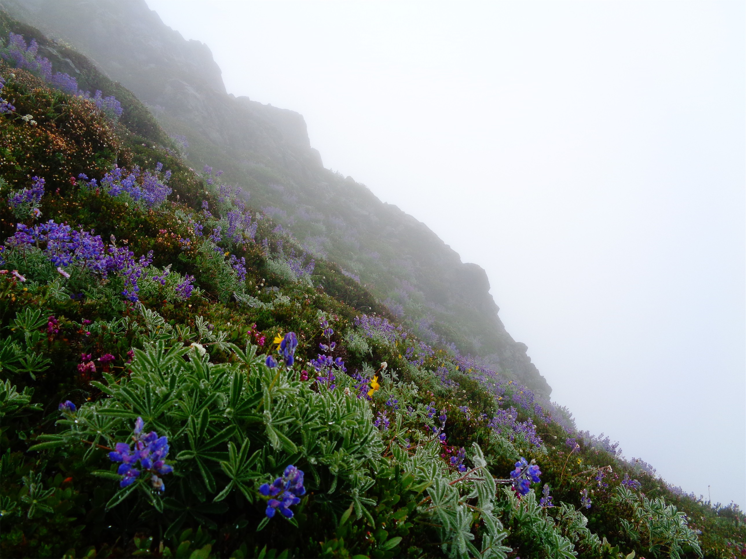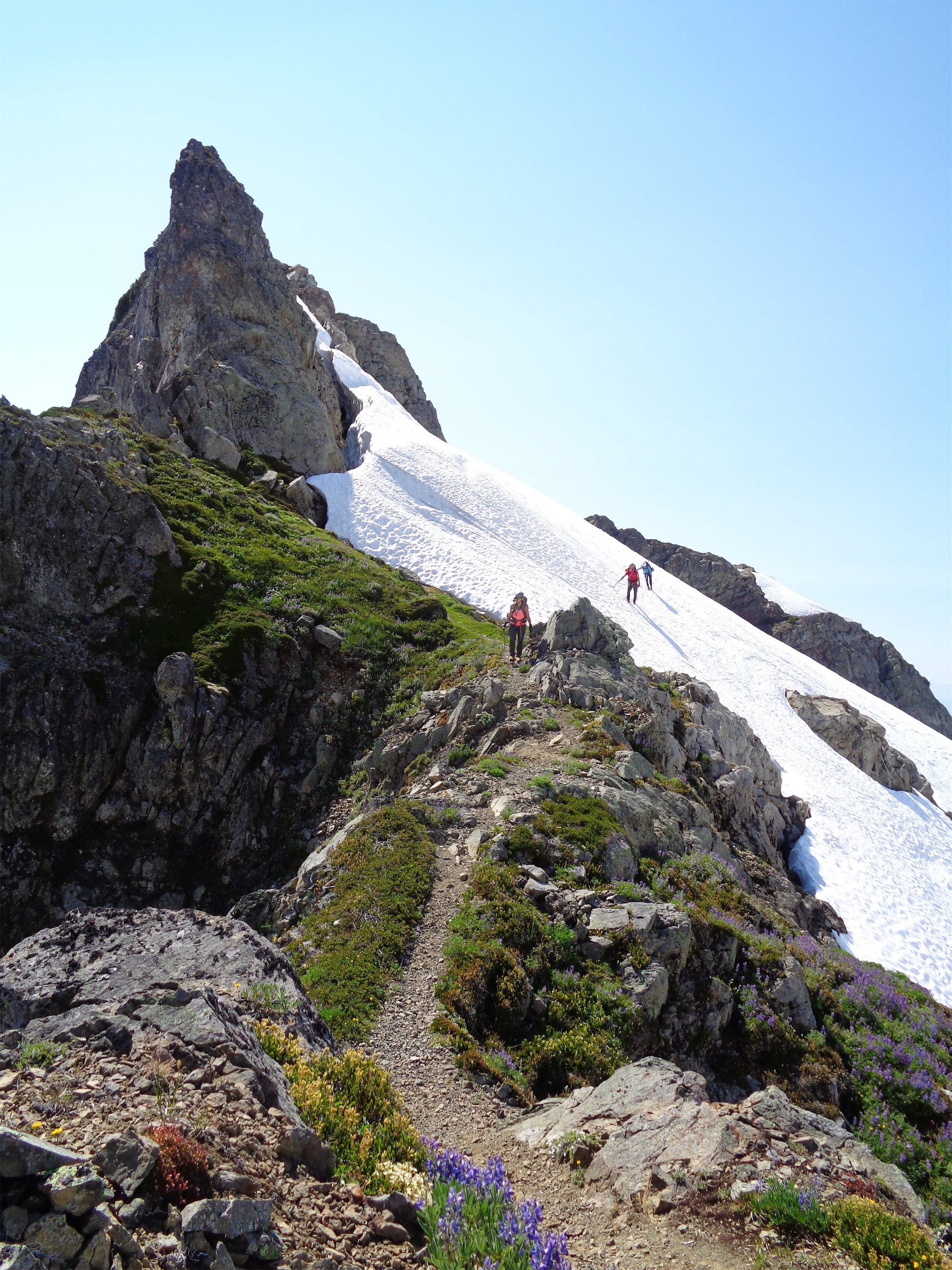 Rather than drop onto the glacier, we stuck with the summer trail. That was our mistake. We expected it to be more melted out, or more snow covered, not the awkward in between we ran into. Decent moats to negotiate, one of which involved a rock that slashed my thumb. It probably needed stitches, it still hasn’t healed, and I’m not sure my thumb will ever be the same shape again. Some steep snow to traverse. Some downclimbing third class scrambles, occasionally with crampons (the worst). Some goats, completely uninterested in us but making us look like slow bumbling fools while they dashed down the fields. And finally, a somewhat melted out trail, surrounded by wildflowers, switchbacking on top of the world. Yes. This is why I was here. I hadn’t been expecting wildflowers! We finally hit a snowfield that took us to the final scramble to the lookout. We had no idea where the ladders were, so we each scrambled a separate path to the top.