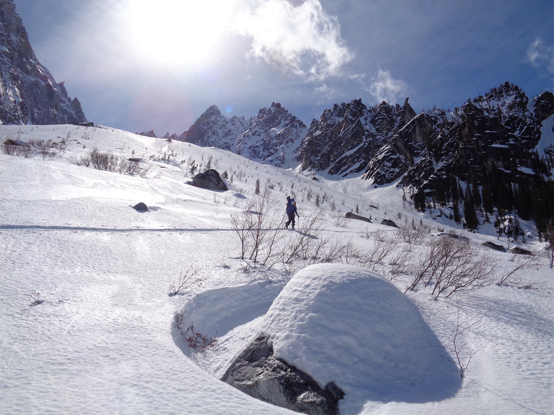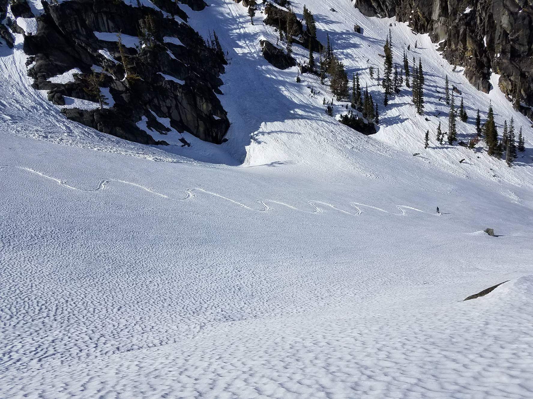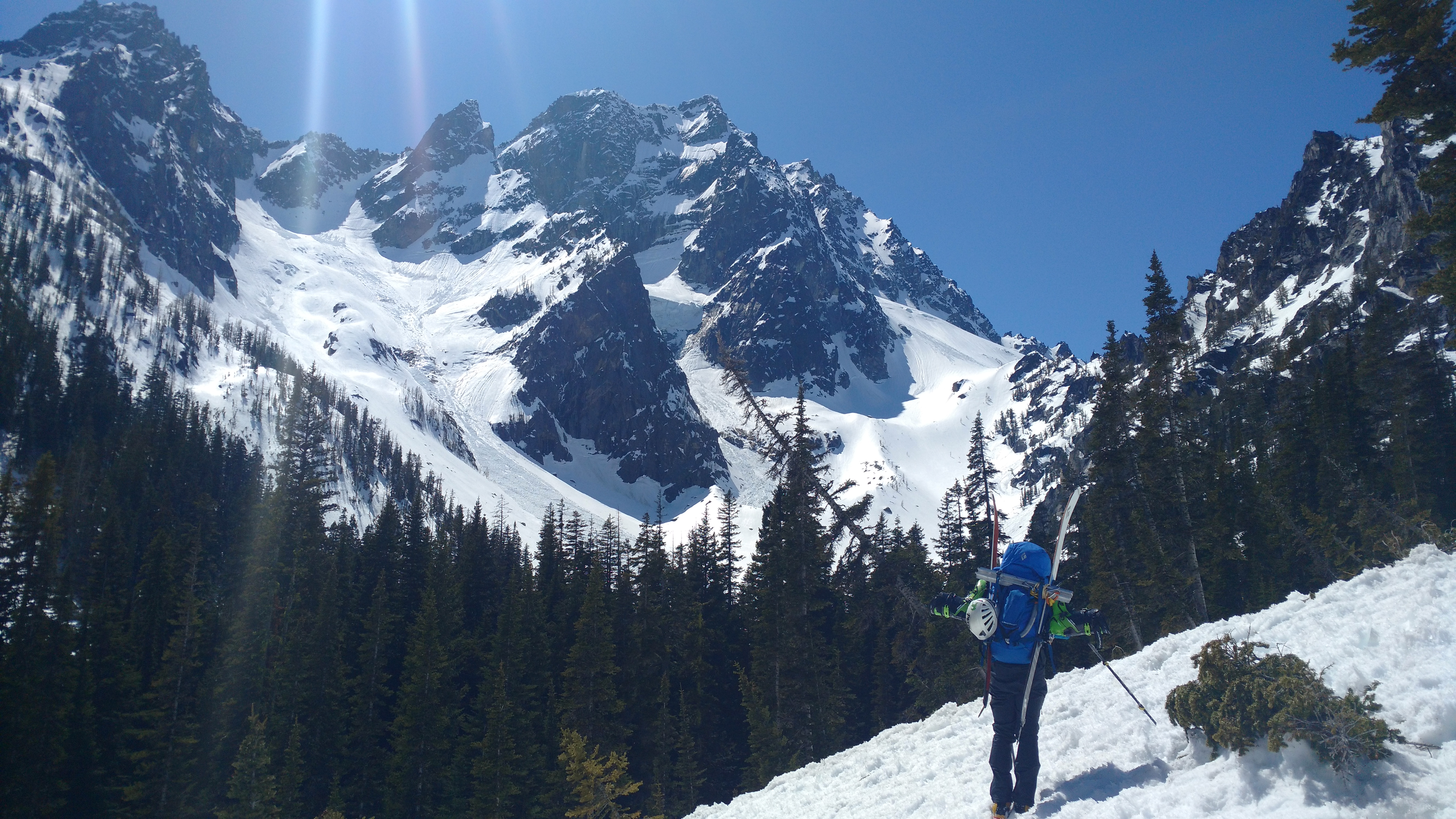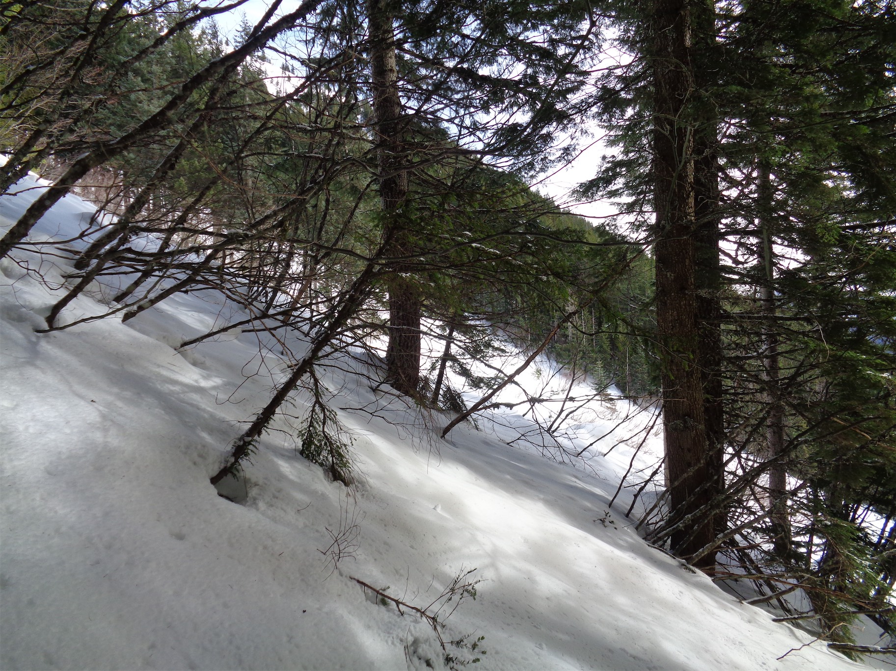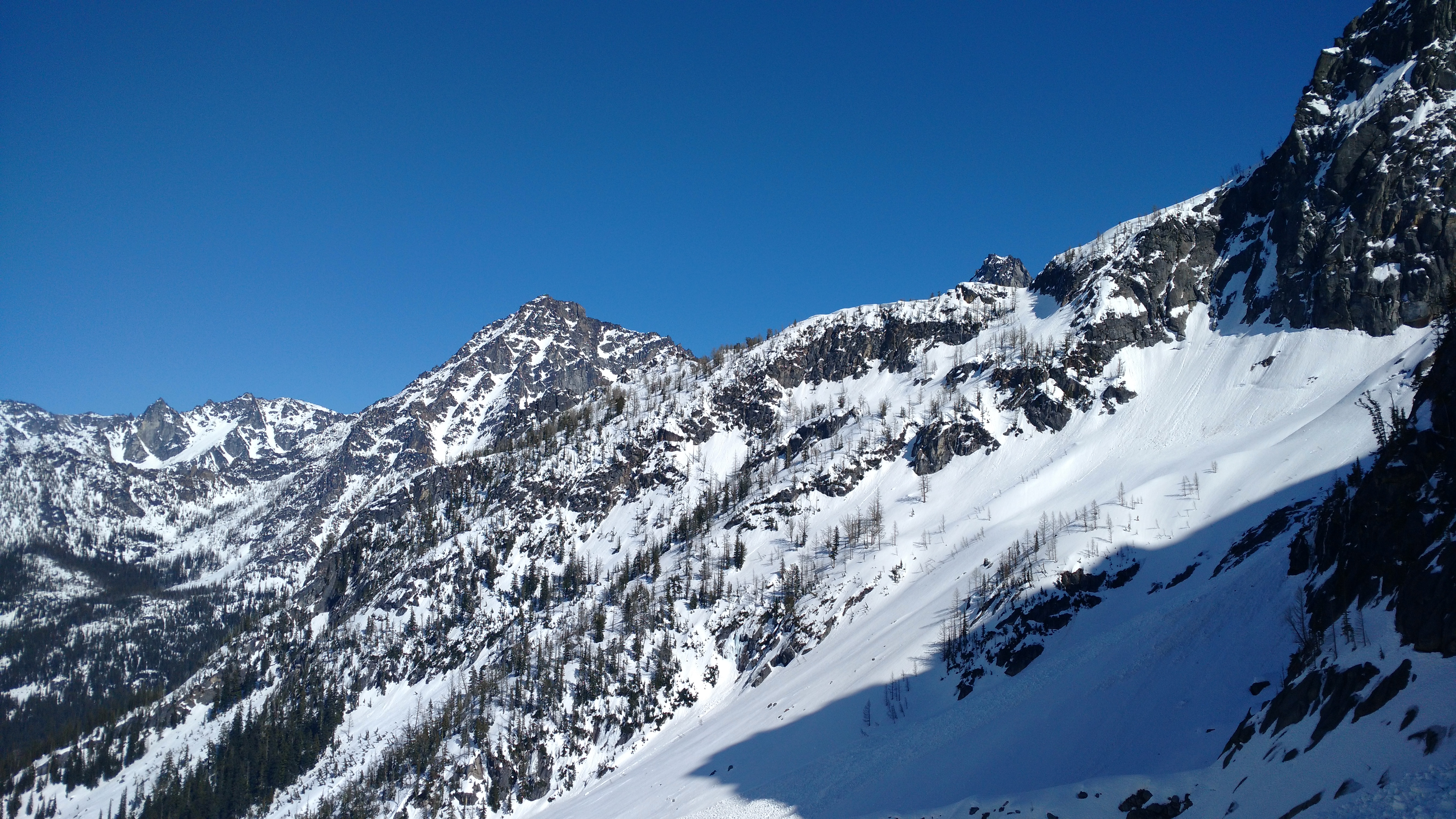 We descended too far on the wind scoured ridge instead of following the rocks east to the trees we had come up through. We could have kept going straight down, but then we’d have had to navigate a bit instead of following the (surprisingly efficient) route we had taken up. And I’m lazy. So instead, we chose to cross the definition of an avalanche slope, facing the south, on a sunny day, on a notoriously avalachey mountain. While the snow seemed fairly consolidated besides the few inches on top of the ice crust, and we hadn’t seen any serious red flags for an avalanche, it was still unnerving. Did I mention that the previous day in SAR we had been looking at pictures of bodies buried in avalanches on Granite? Yeah, it was on my mind. Welp, one at a time, move quickly, and don’t trip. Let’s get this over with.