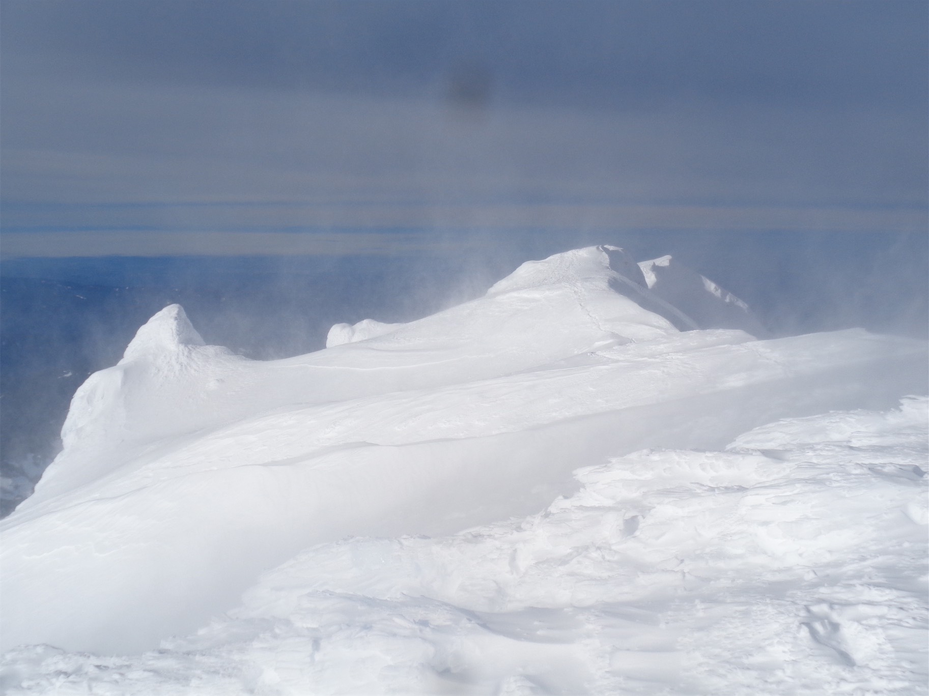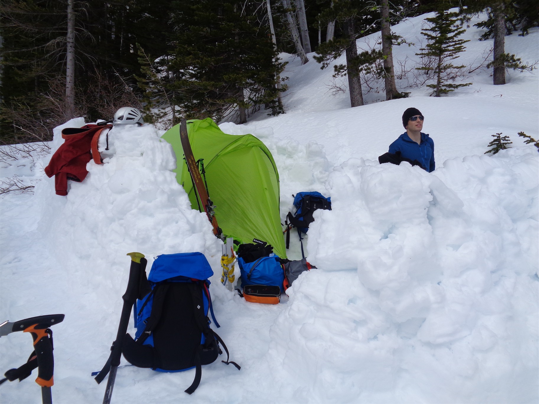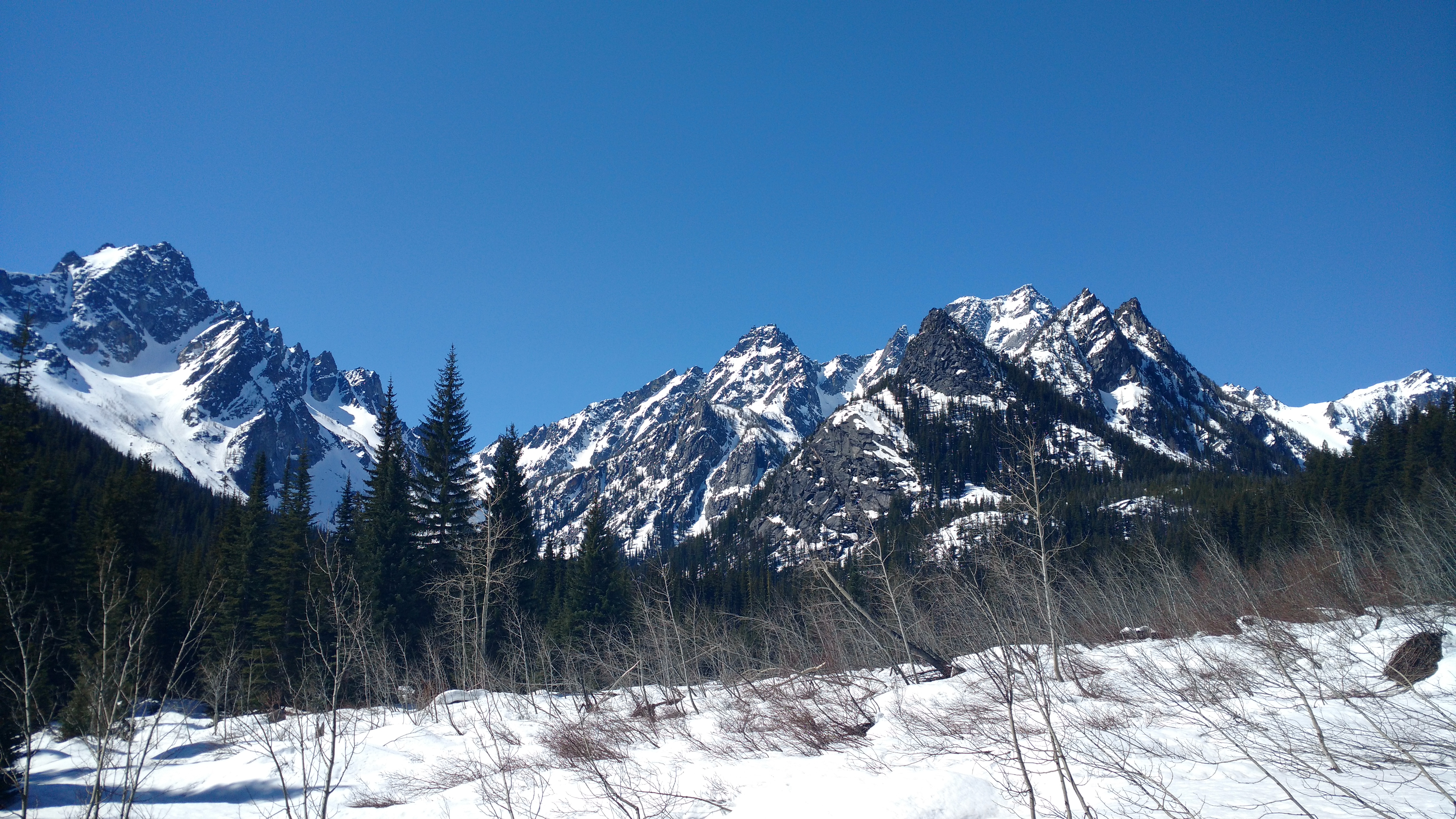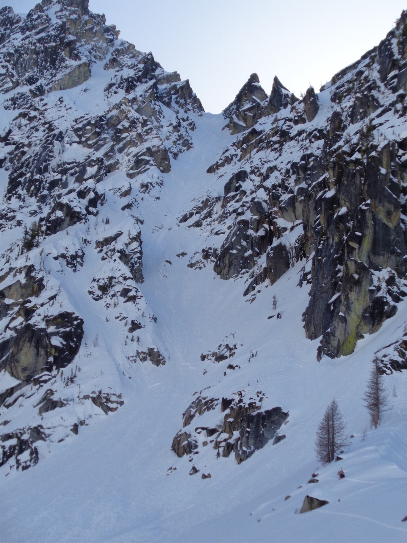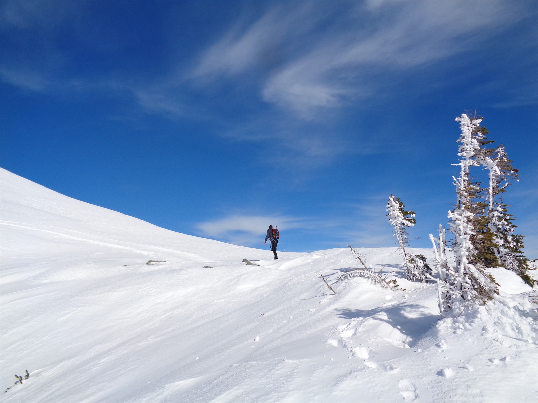 We descended too far on the wind scoured ridge instead of following the rocks east to the trees we had come up through. We could have kept going straight down, but then we’d have had to navigate a bit instead of following the (surprisingly efficient) route we had taken up. And I’m lazy. So instead, we chose to cross the definition of an avalanche slope, facing the south, on a sunny day, on a notoriously avalachey mountain. While the snow seemed fairly consolidated besides the few inches on top of the ice crust, and we hadn’t seen any serious red flags for an avalanche, it was still unnerving. Did I mention that the previous day in SAR we had been looking at pictures of bodies buried in avalanches on Granite? Yeah, it was on my mind. Welp, one at a time, move quickly, and don’t trip. Let’s get this over with.