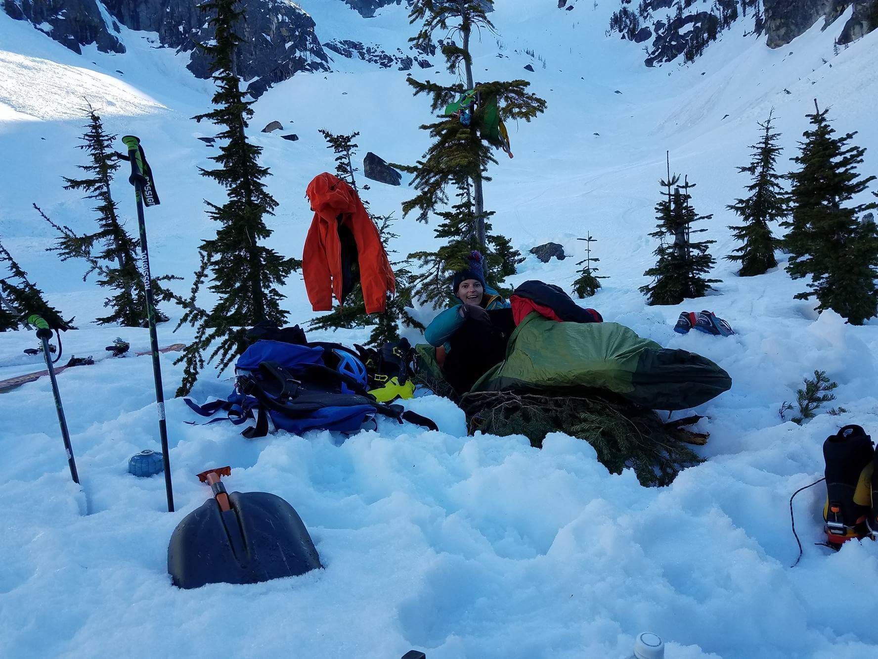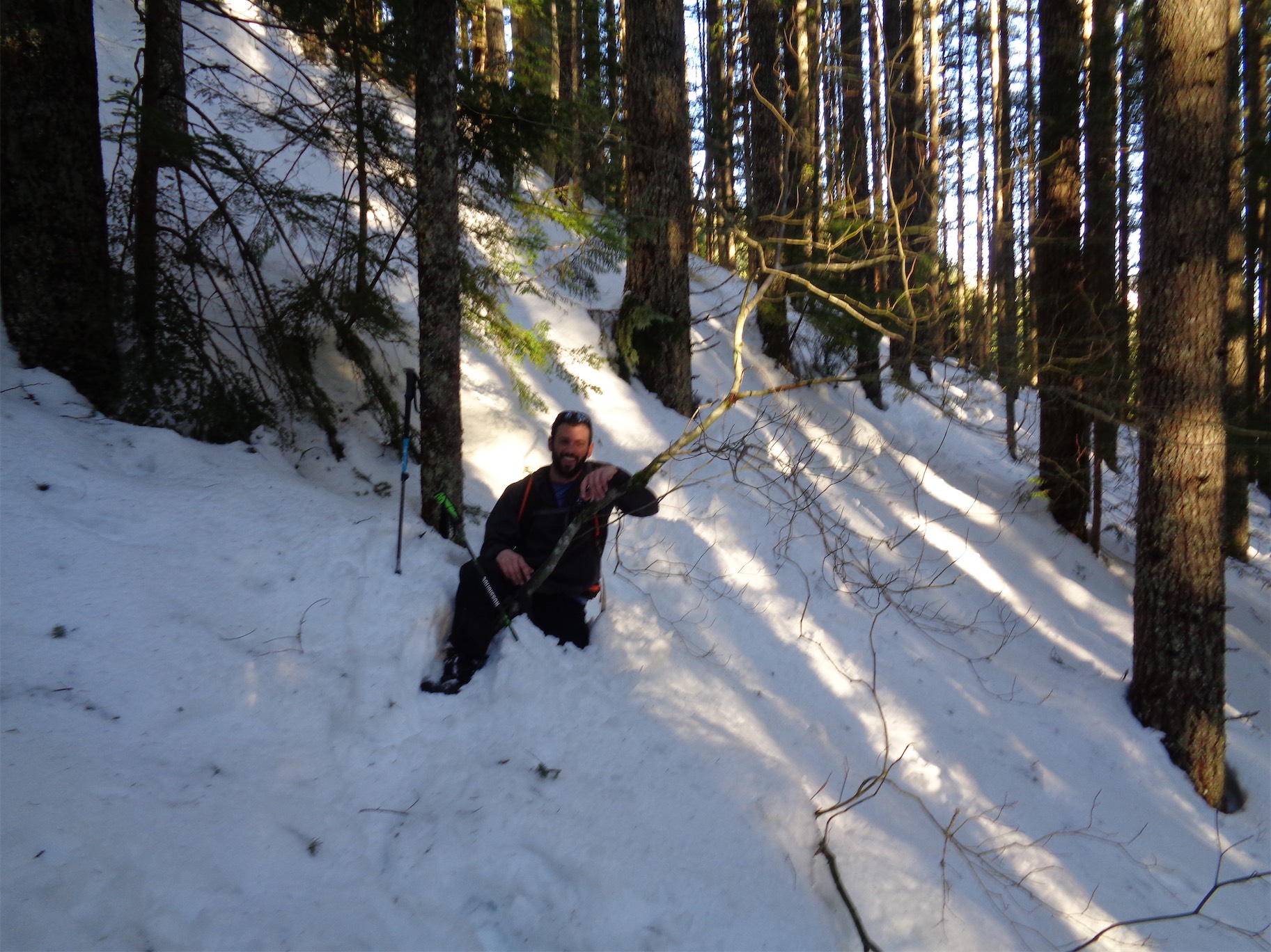 Spoiler alert, we were fine. But you never know. .01% chance something goes wrong, 99.99% chance of a horrible outcome if something does go wrong. That’s how a lot of mountaineering is. Sorry mom. Next time I’ll go back up and over instead of across. But it was quick. From there on out we were back on the rock, and soon enough we were in the trees were we glissaded down our tracks (destroying every beautiful staircase we had made on the way up so you all have to break your own trail, suckers) which flew by if you ignore my immediately numb ass. We were almost back to the snowshoe tracks when I saw something curled up in the bottom of a posthole. Could it be?!
