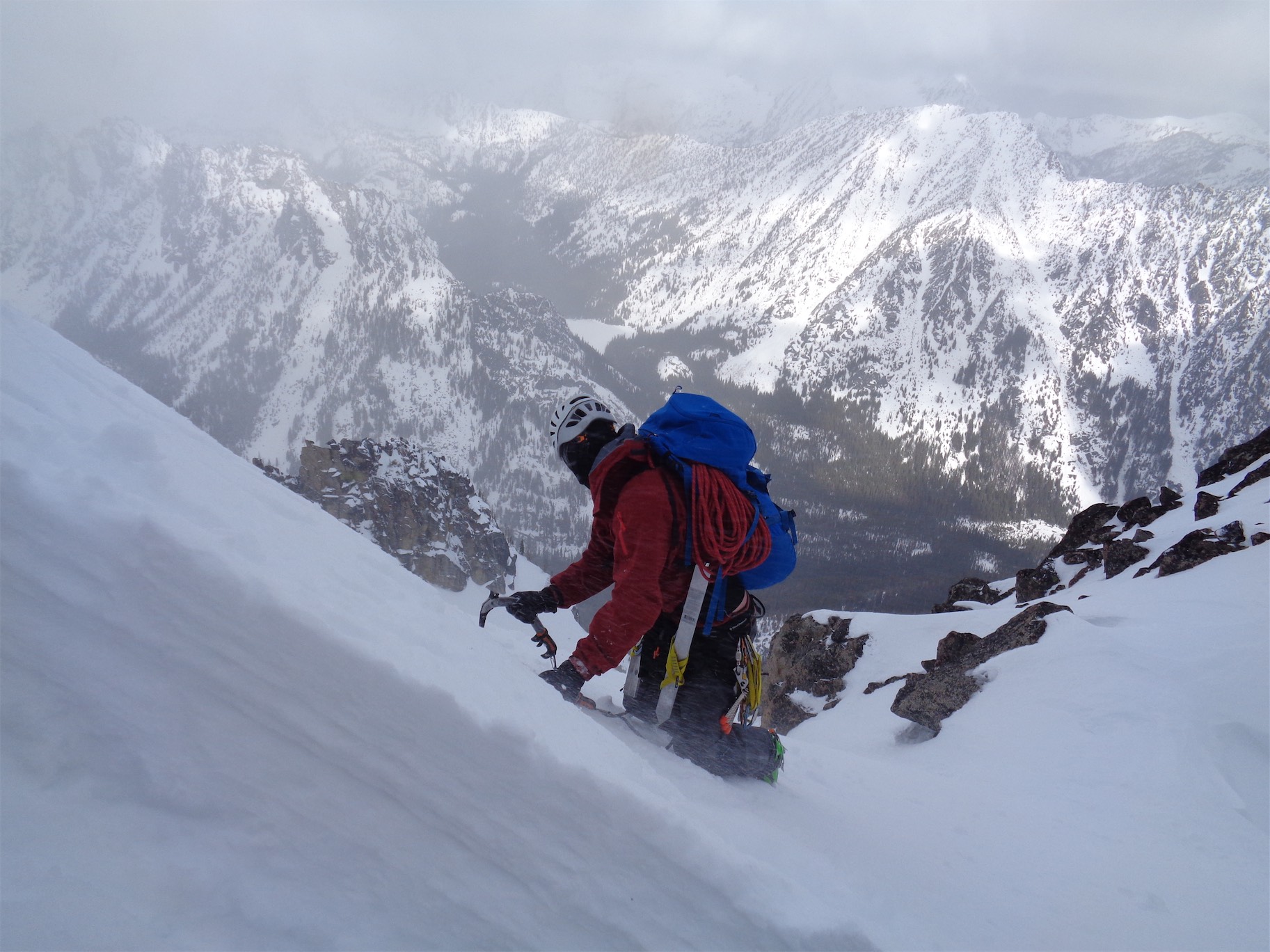 The snow traverse was slower going than I expected. More tedious than anything. There was one brief icy section, but most was soft enough for nicely kicked steps and the ice tool stuck well, I ended up using the pick more than the shaft. Halfway across the traverse I thought to myself ugh, please let there be a bivvy spot at this notch. Huh, I must be tired if I’m hoping for a bivvy spot. I knew the ideal bivvy spot was at the next notch, but we had used up so much time rapping across the moat that I didn’t think we were going to make it. Turned out we could have made it by dark if we had tried, but apparently I was tired, and since I didn’t know how long it would take, I was ready for dinner and bedtime.
